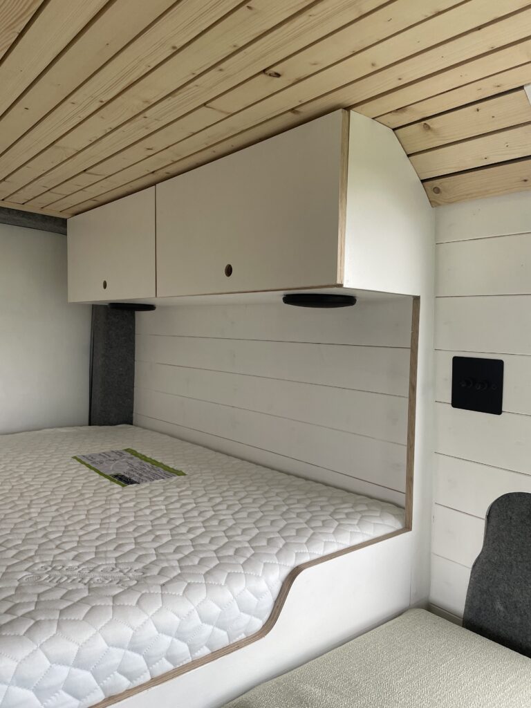Double fixed bed with memory foam mattress and custom fitted sheet – 162cm x 135cm