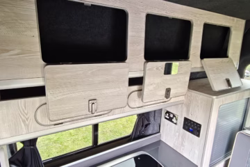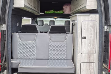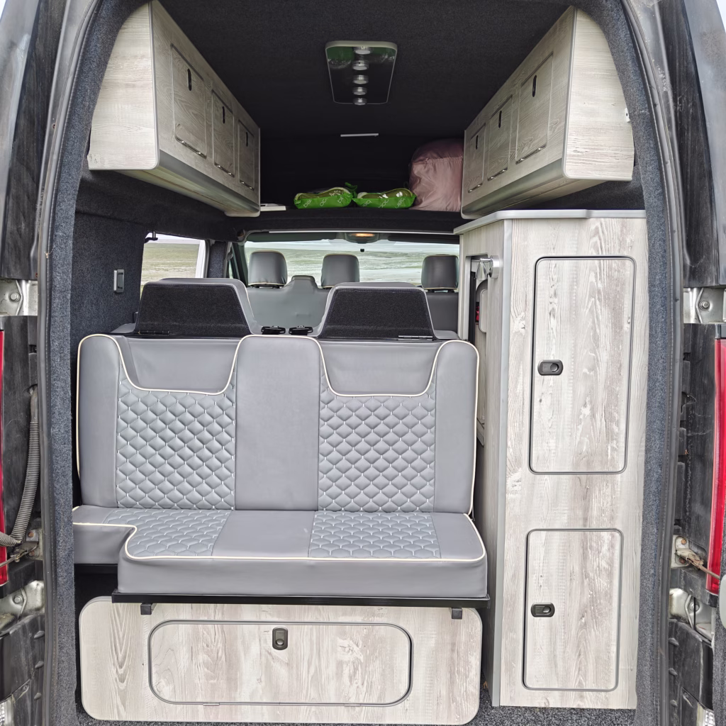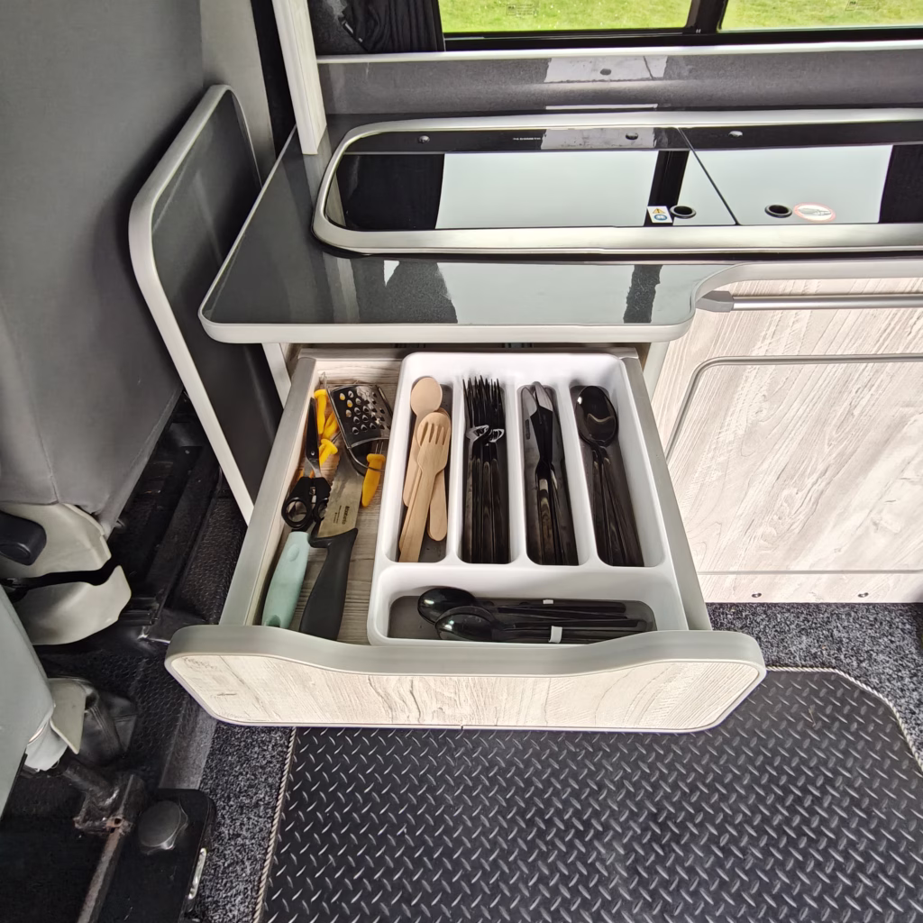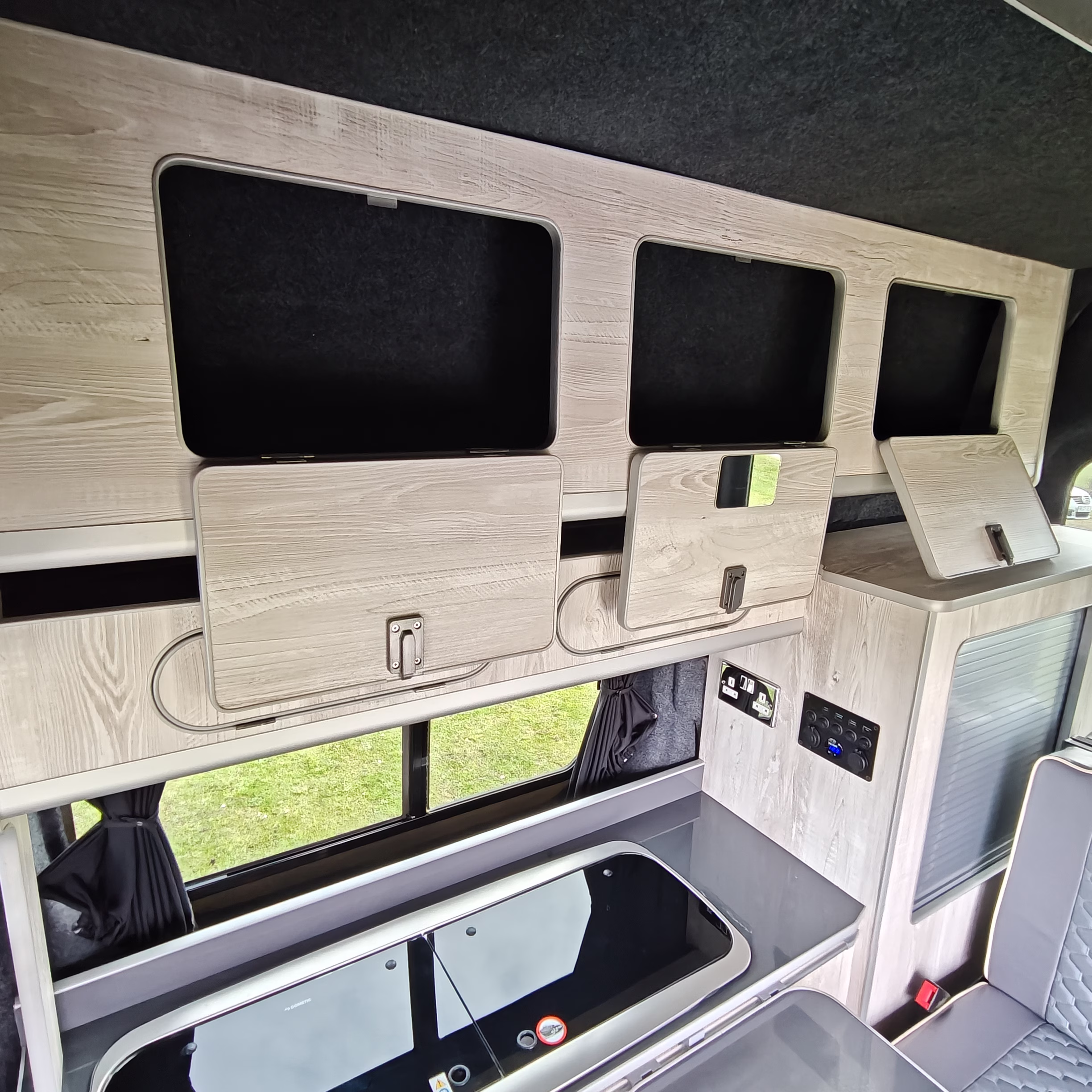 * Excellent and well-lit cupboard storage spanning both sides of the van to keep all your gear organized.