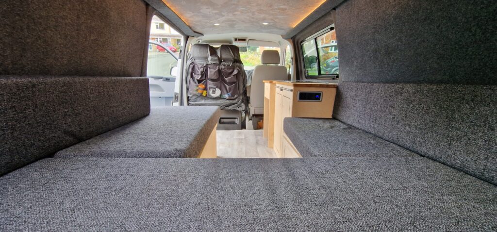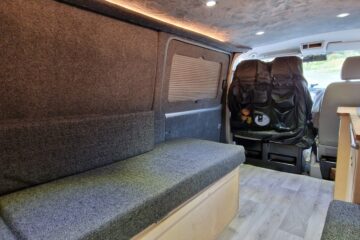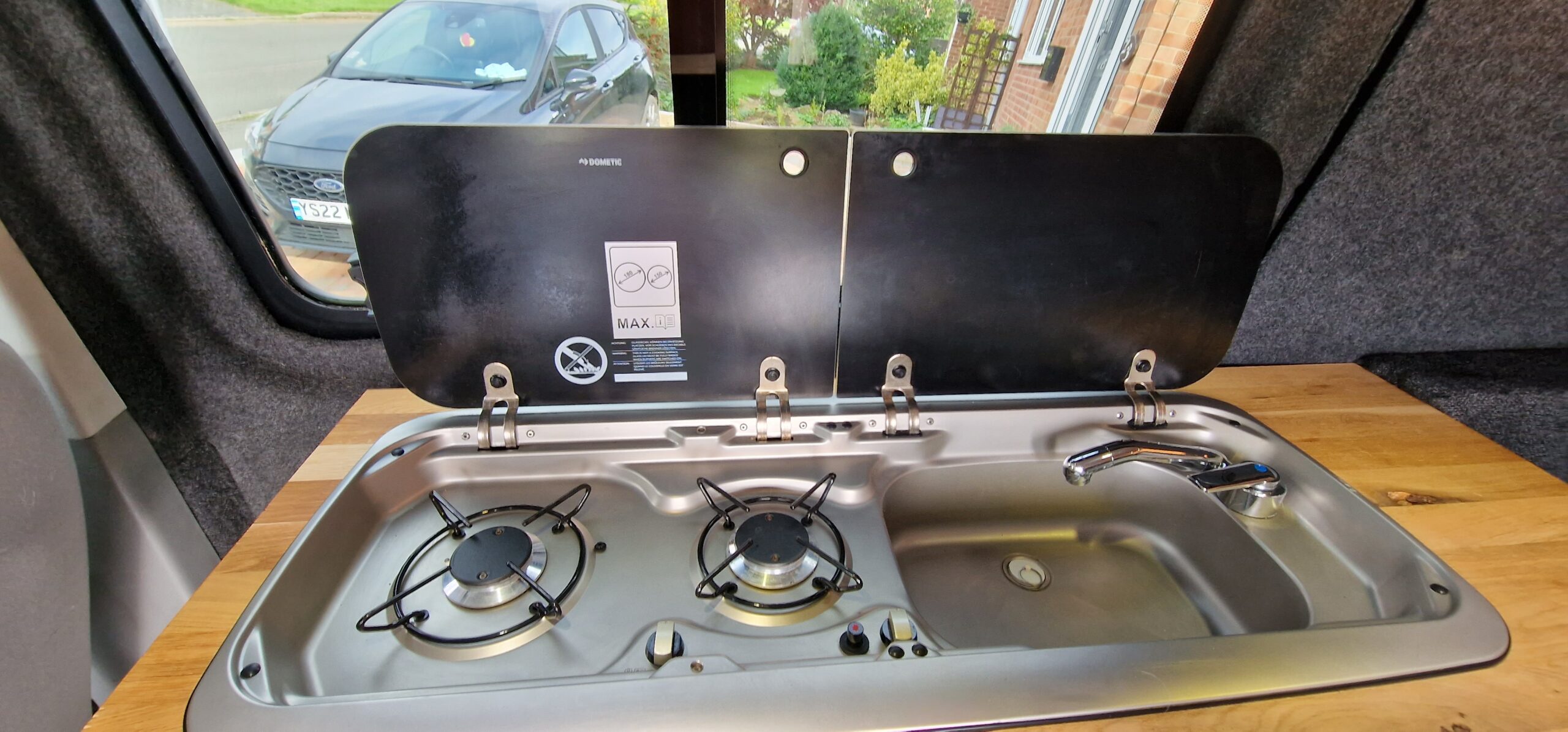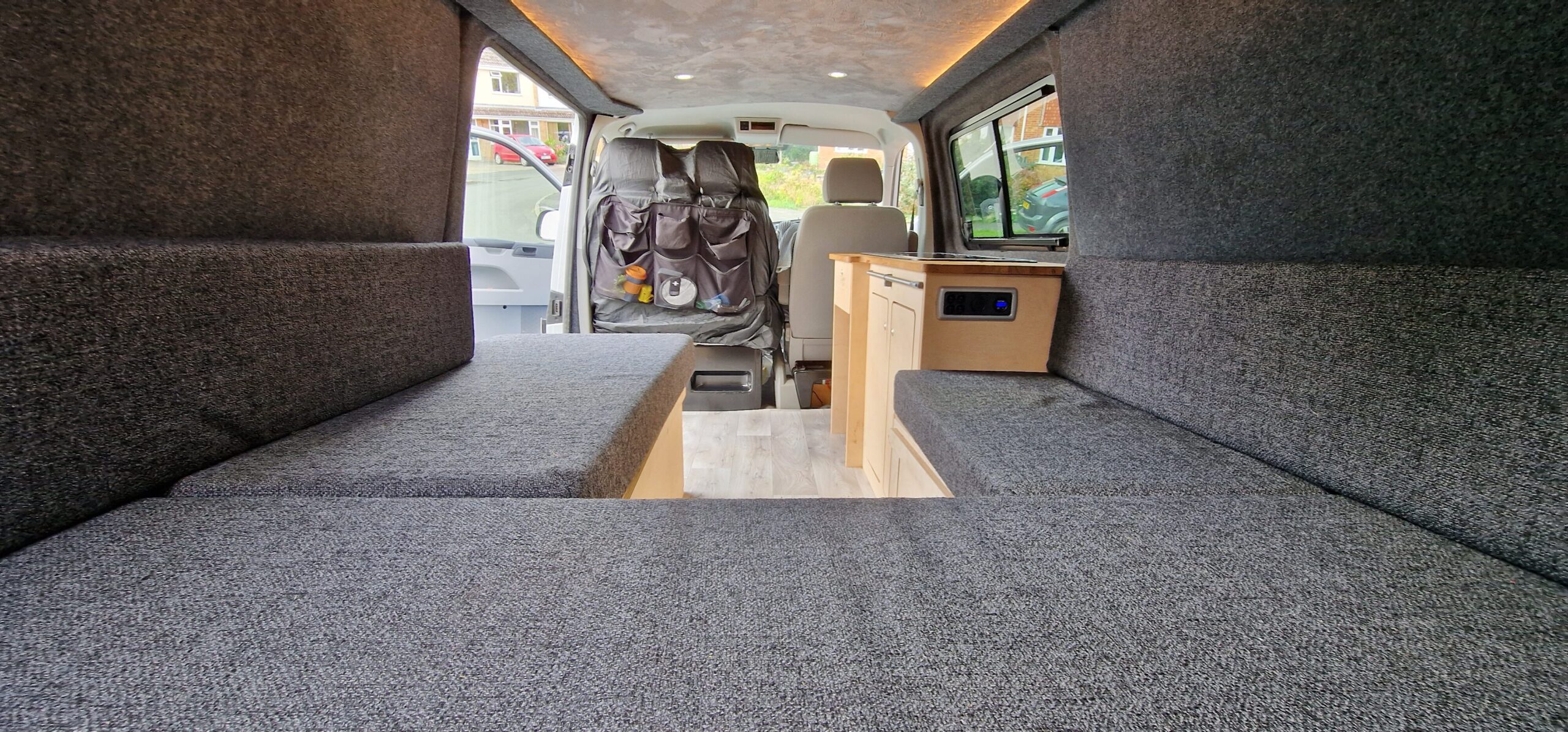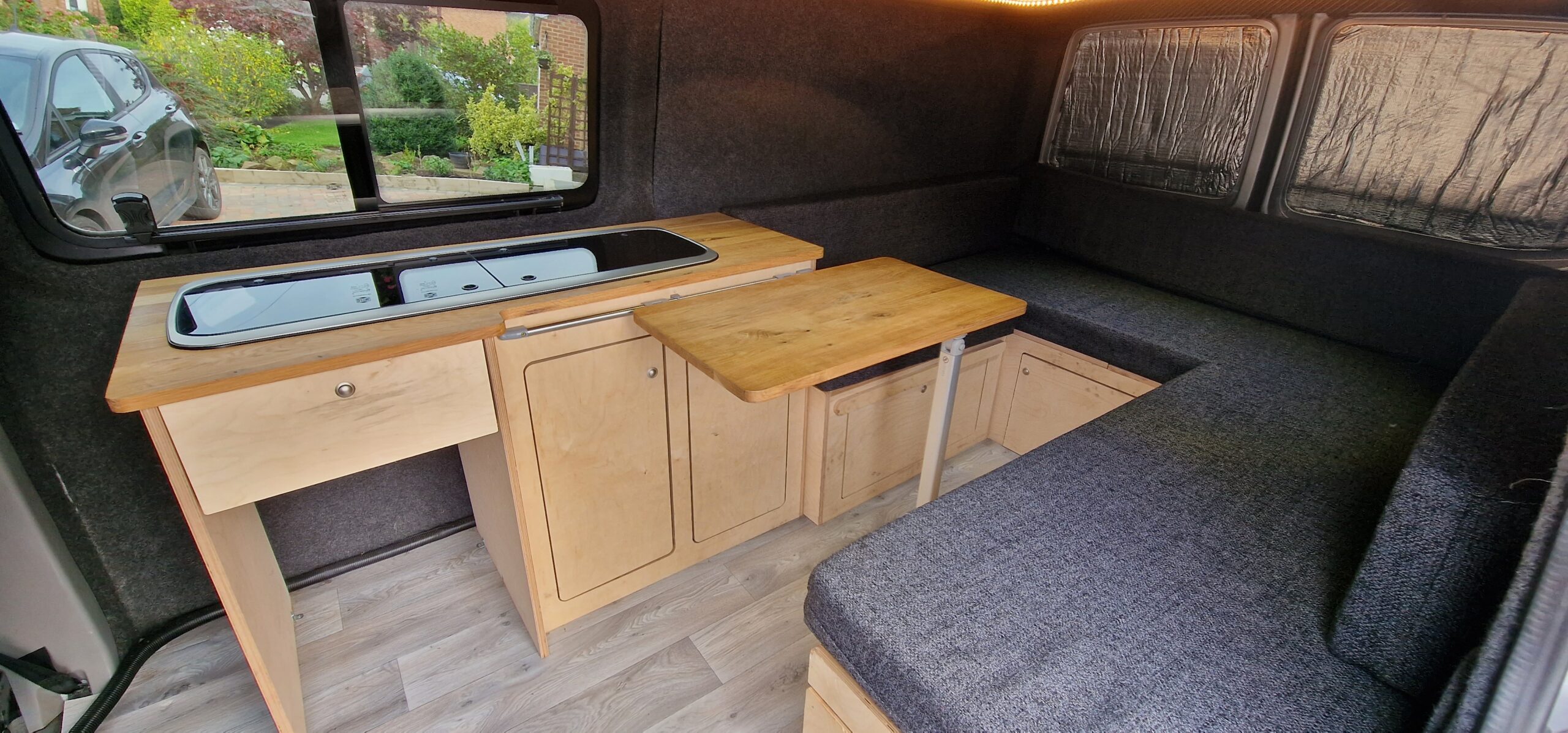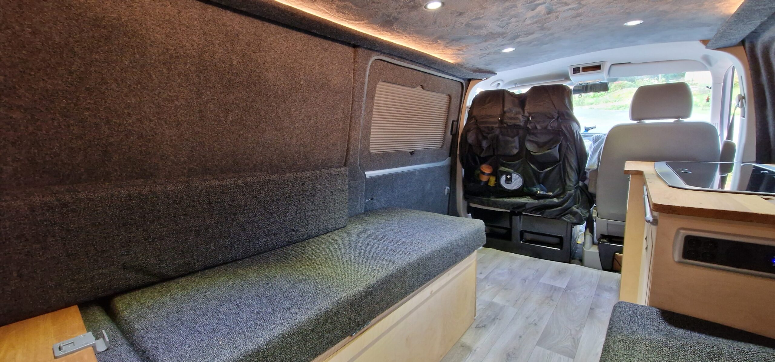 Camper Glass privacy glass. U-Shaped furniture from Van Furniture. Dodo thermal fleece insulation, Sound Coat sound deadening. Split charge relay, leisure battery, CBE switch surround with 2x USB ports, 4x switches (3 in use for lights), and voltage meter. Dometic-Smev 9222 dual hob and sink with bulkhead gas regulator. Space for campervan fridge. Halo roof with carpet surround, 6x LED downlights, and LED halo lighting. Vanshades blind on sliding door, external, thermal cab blinds. Mega stretch anthracite carpet from MVM throughout. Air conditioning, front and rear view camera, electric windows, Bluetooth connectivity, hill hold assist. Work required at age/mileage completed. Next MOT due 16/01/2025, Long wheel-base, Silver, 2 owners.