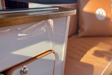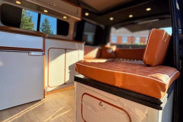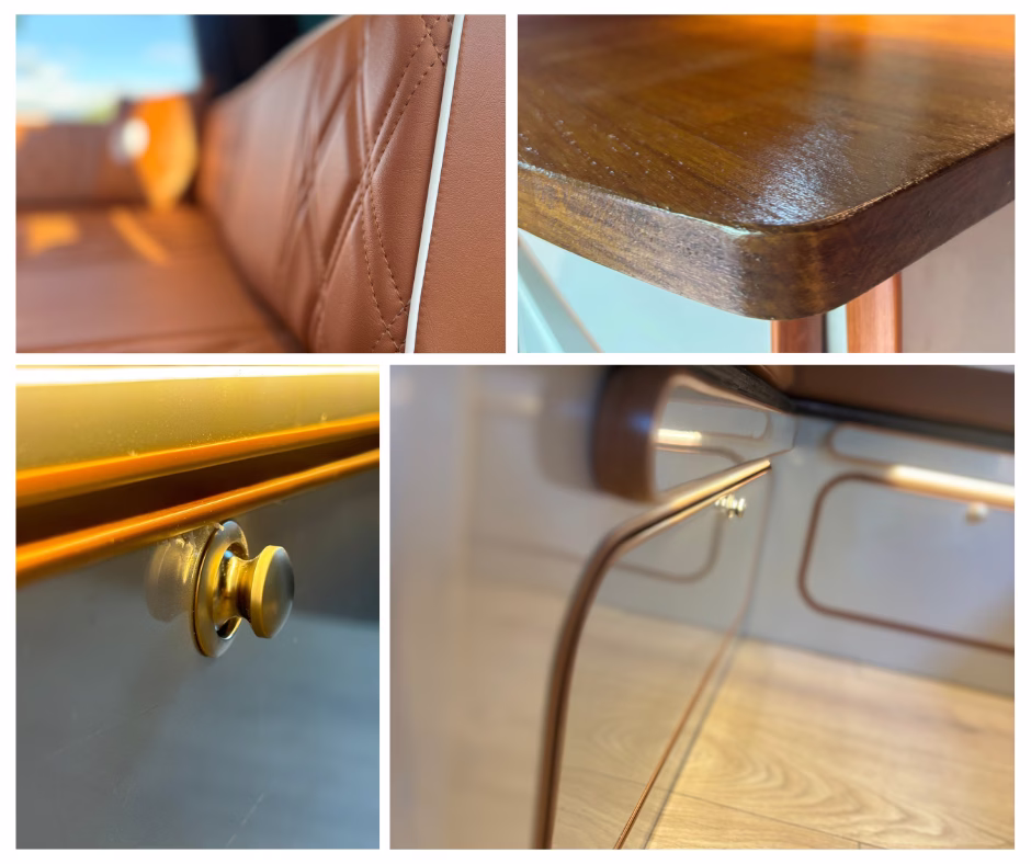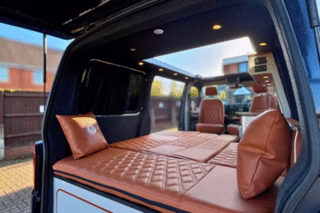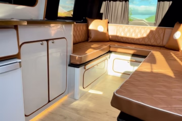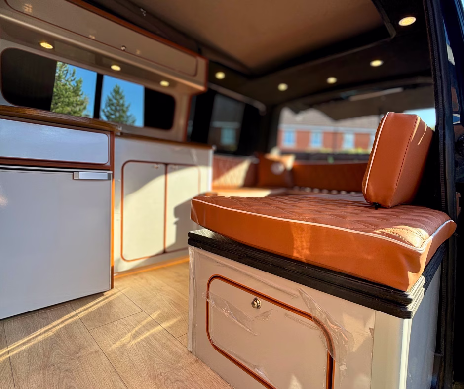 This campervan is beautifully designed, with custom U-shaped seating, matching upholstery, and high-quality materials throughout.
