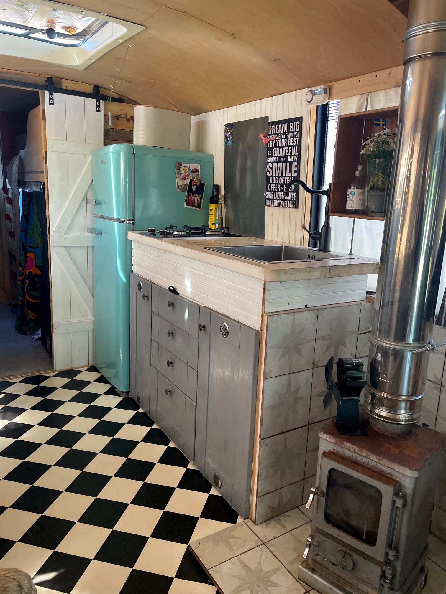 * Spacious Living and Kitchen Area: The open-plan living space is fitted with a large sofa and two captain’s seats, offering plenty of room to relax. A breakfast bar with two barstools provides a lovely spot for meals or a morning coffee. The kitchen features a big sink, a gas hob, a fridge freezer, and even a Salamander Stoves Hobbit wood burner to keep things toasty. Wooden panel flooring in living area and a black and white chequered vinyl flooring in the kitchen area.