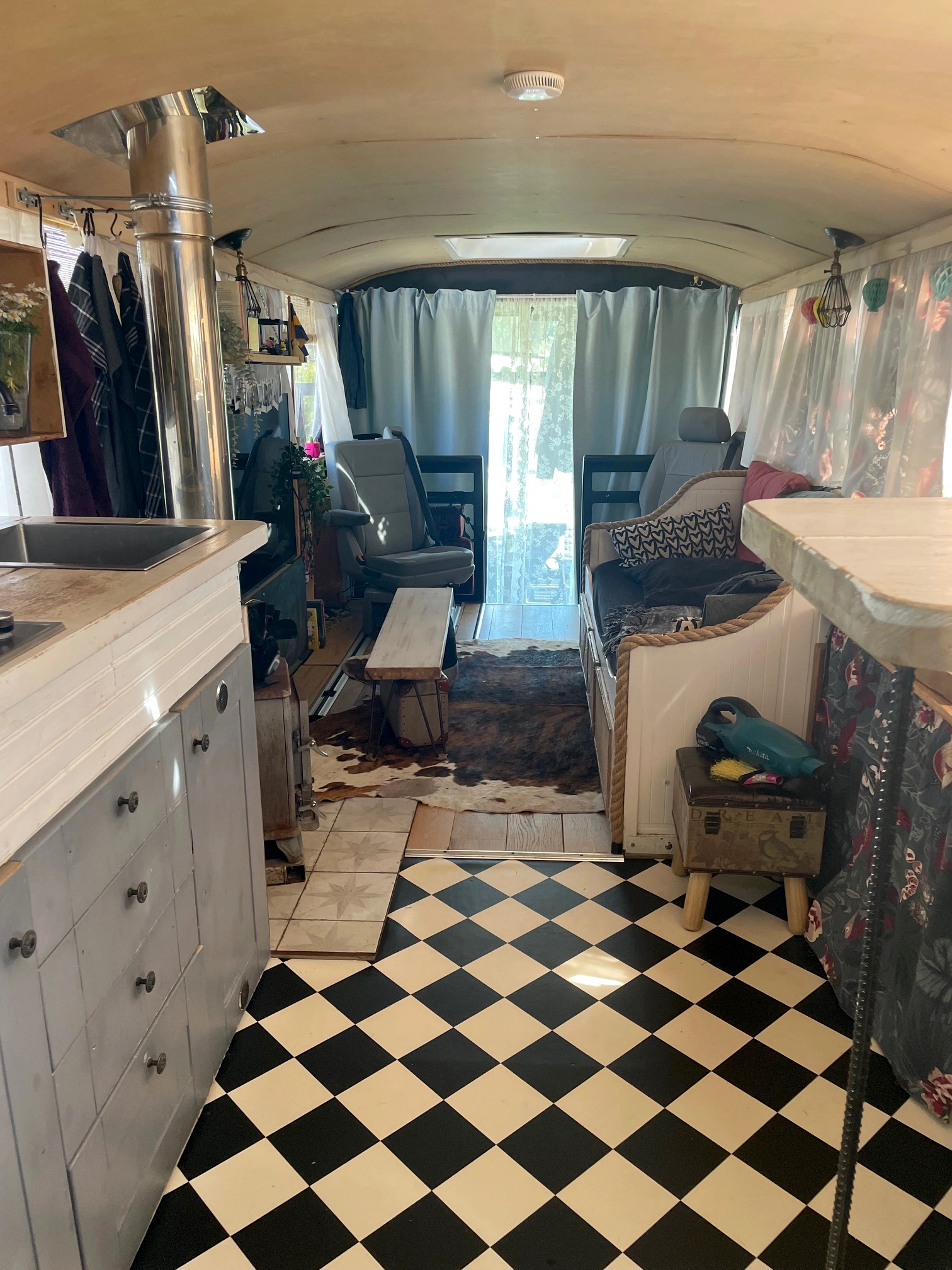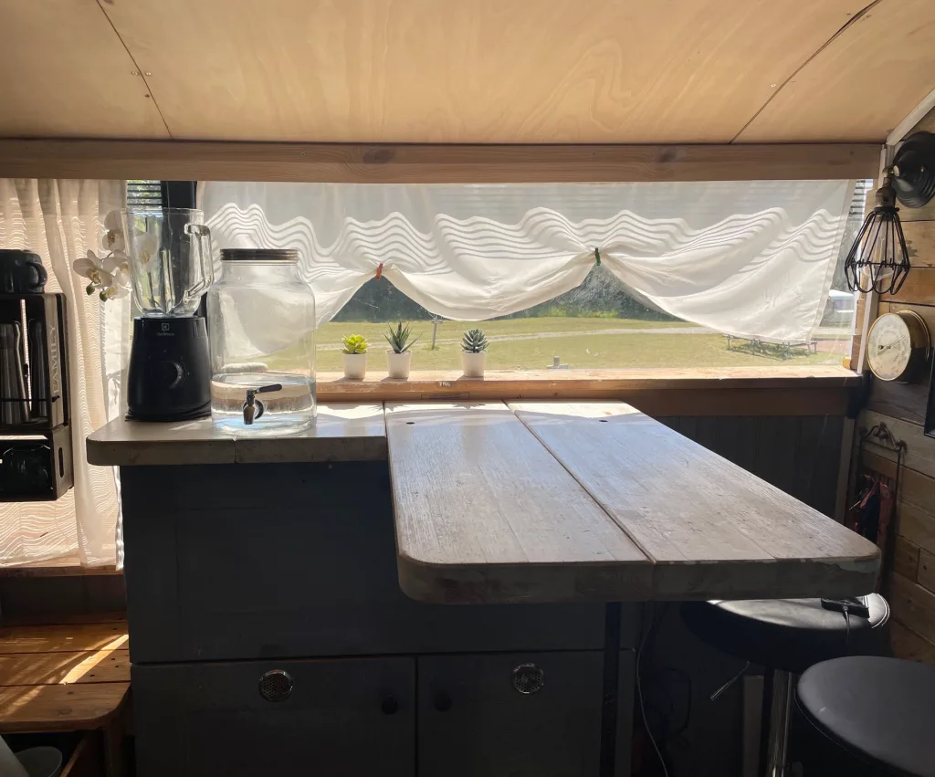 This bus conversion offers a unique combination of rustic charm, spaciousness, and practicality. Designed with family life in mind, it has provided a cozy, functional home for traveling through Europe. With its extensive solar power system, large water tanks, and ample storage, it’s perfectly set up for off-grid adventures nearly year-round.