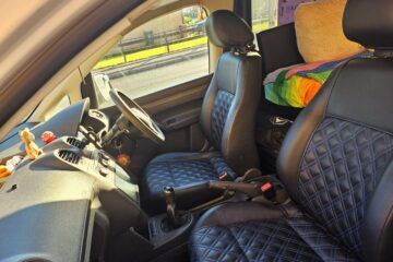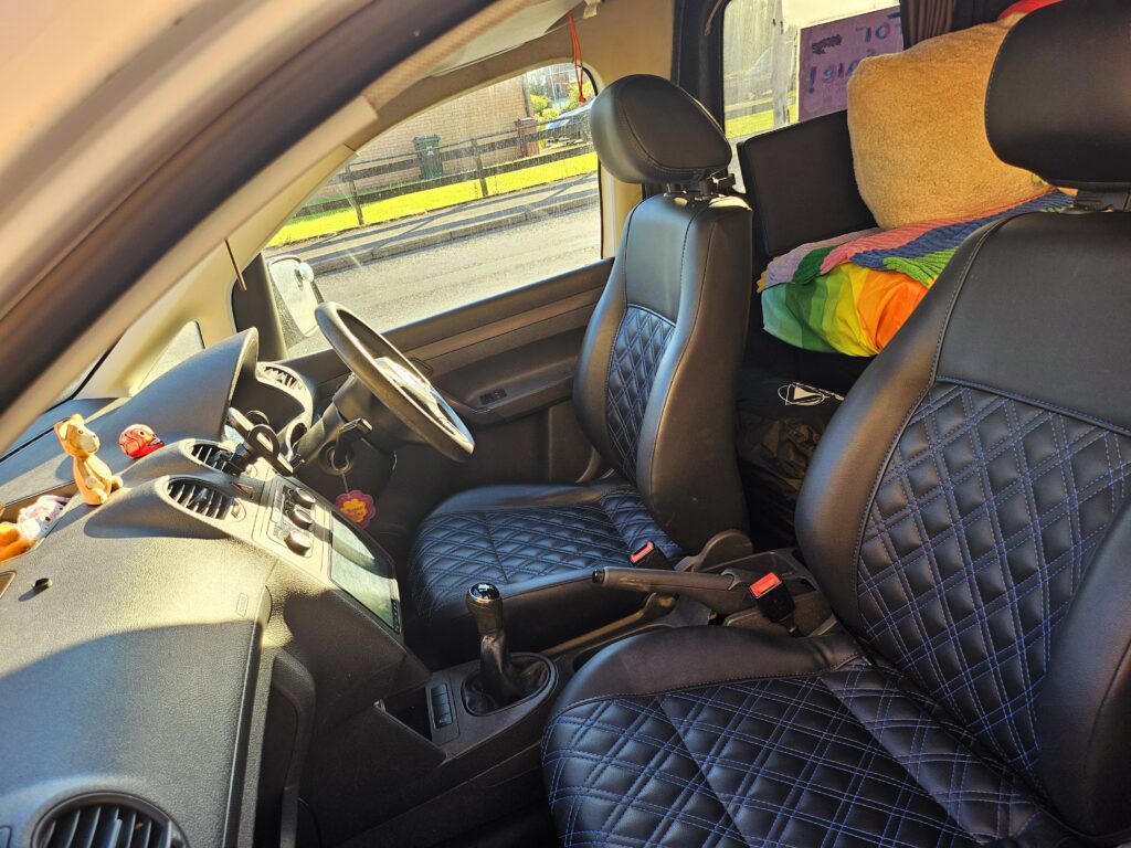 – Leather seats /w blue stitching.
