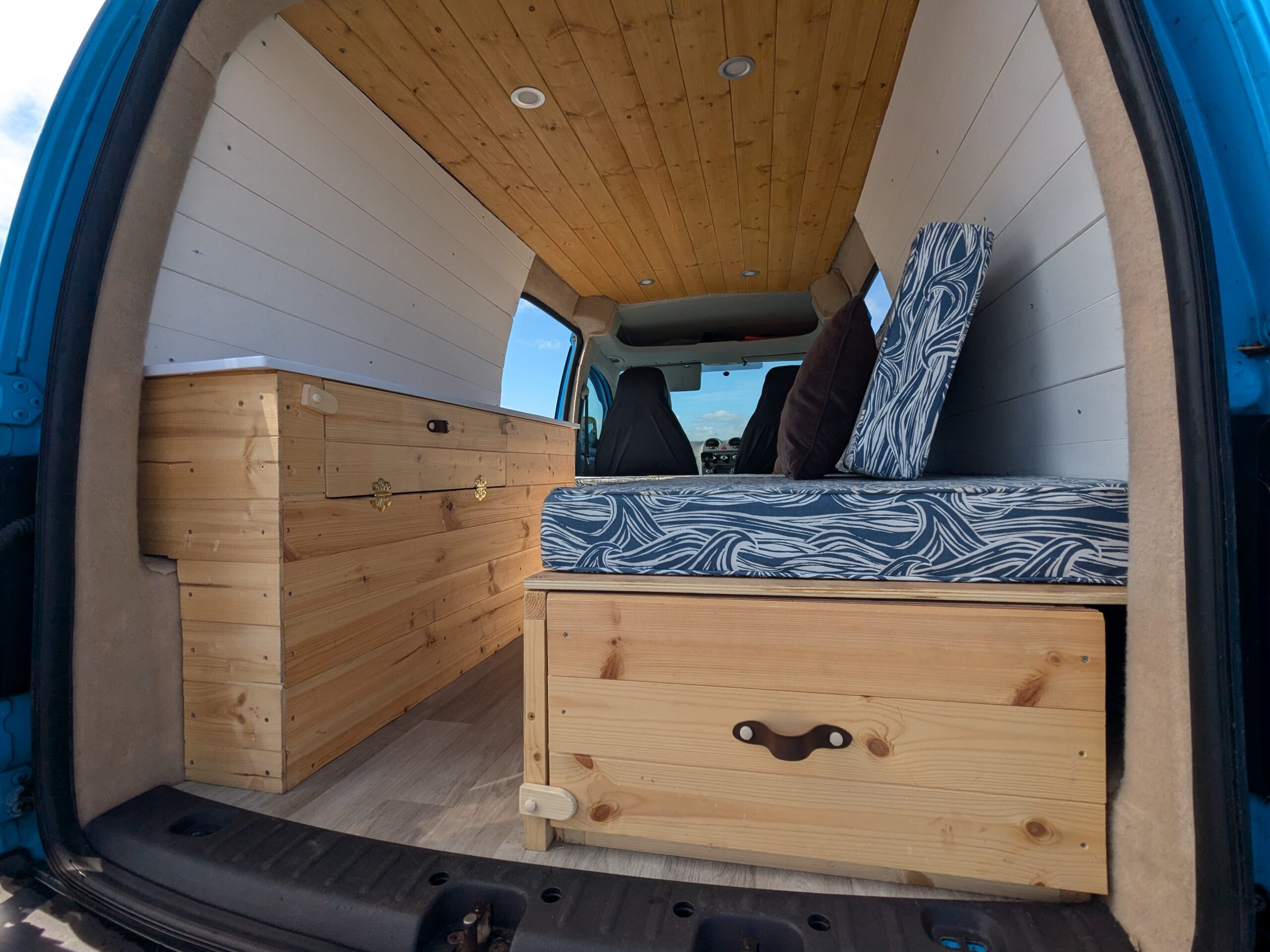 Large pull out draw under bed with a surface for cooking on outside van