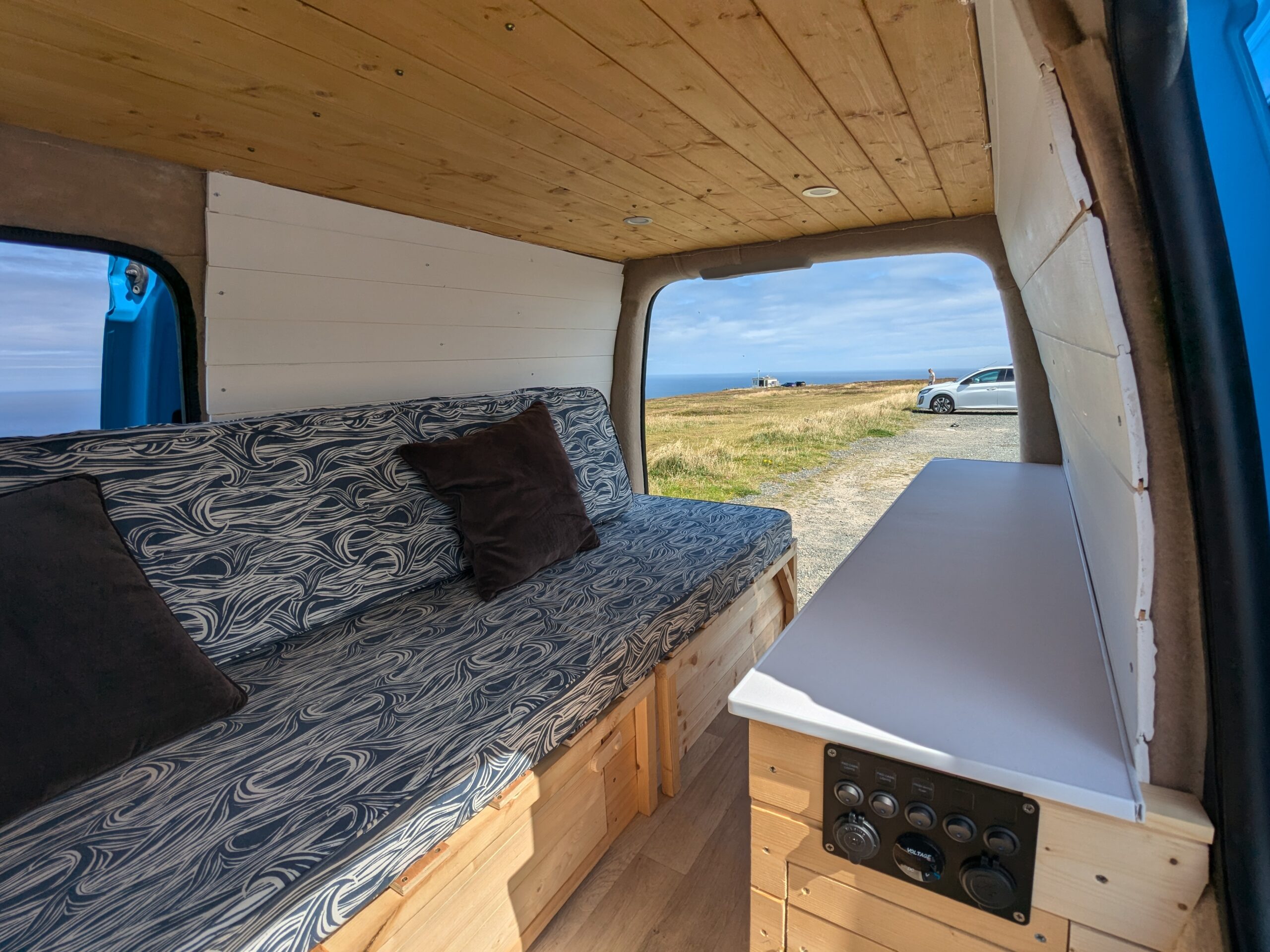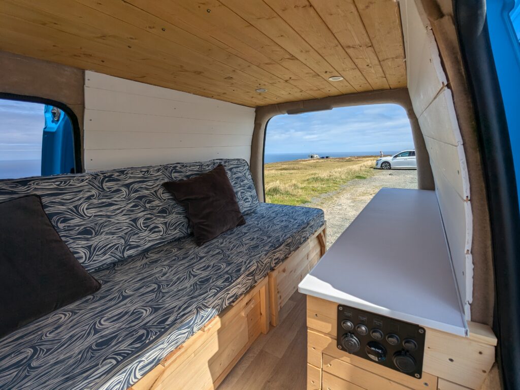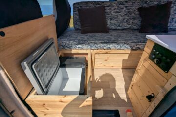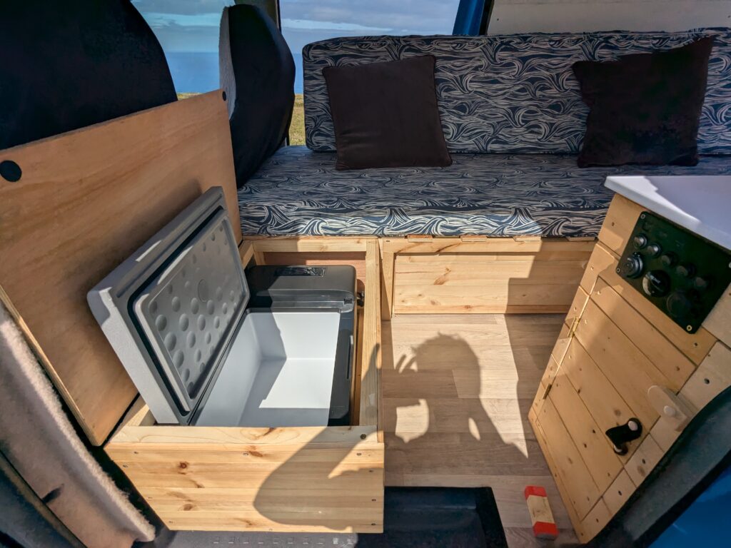 12 vault leisure battery with split charge relay providing charging ports, ceiling lights and mini fridge – all professionally installed