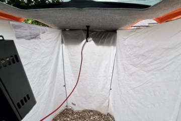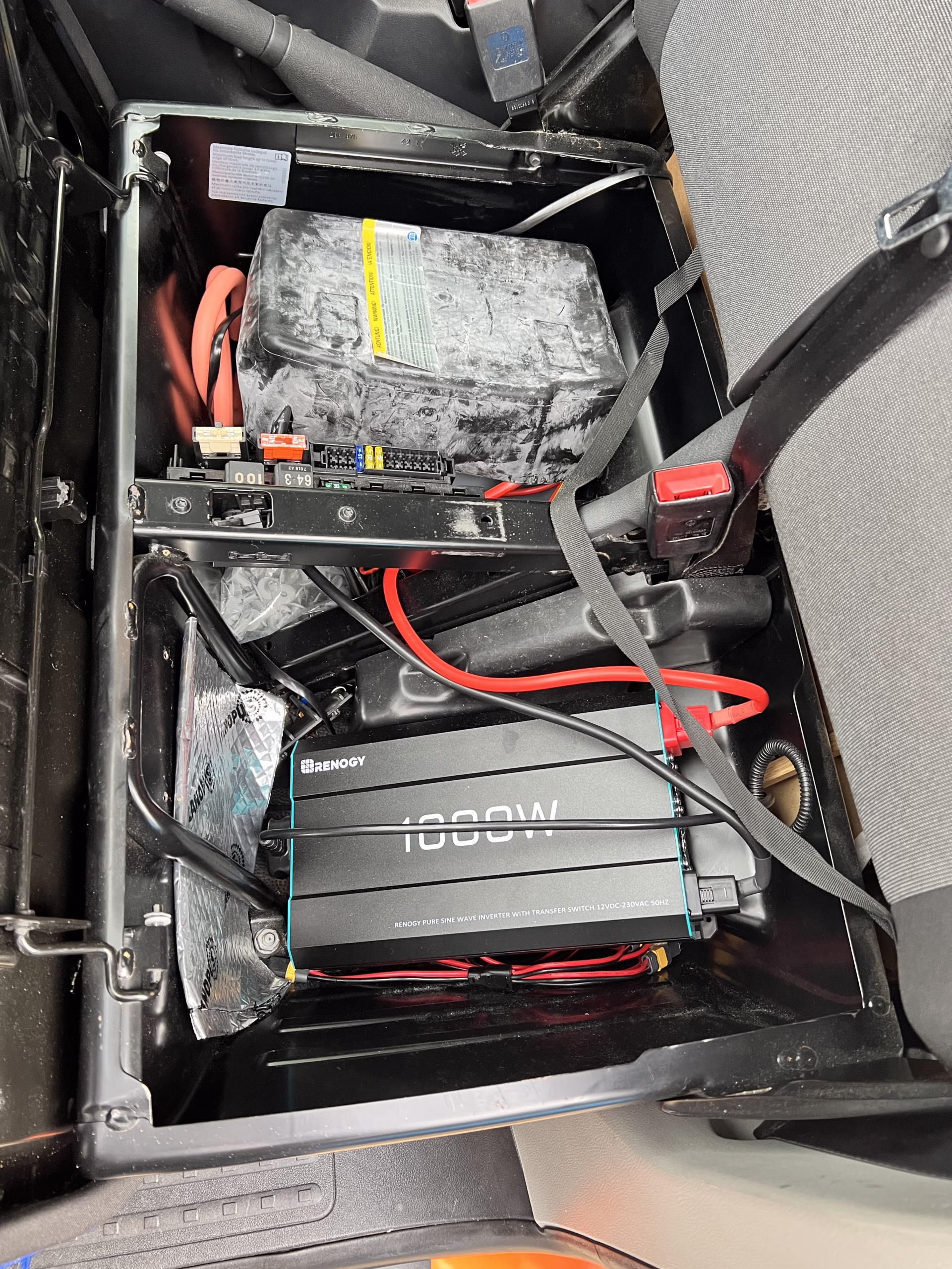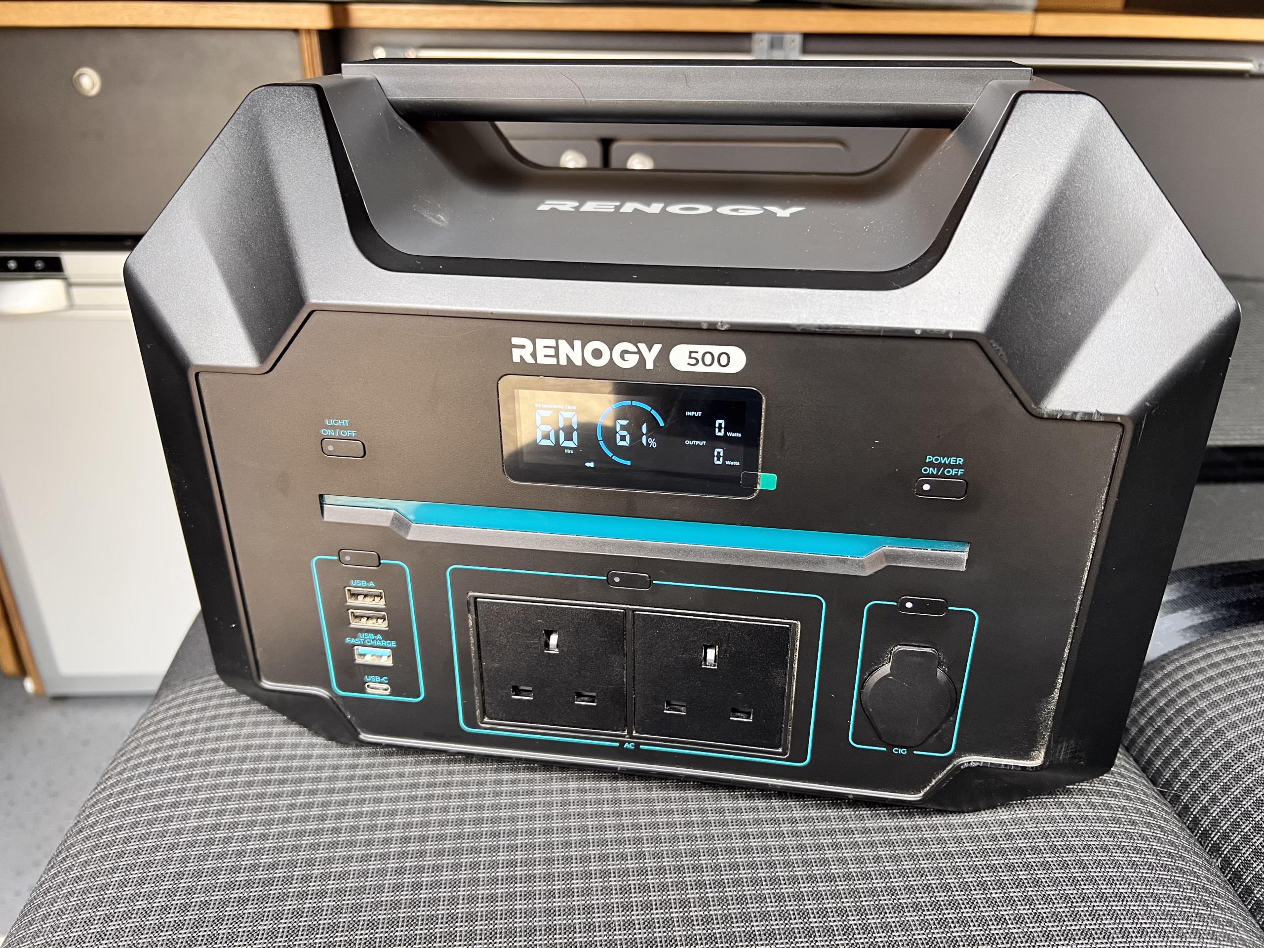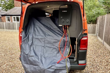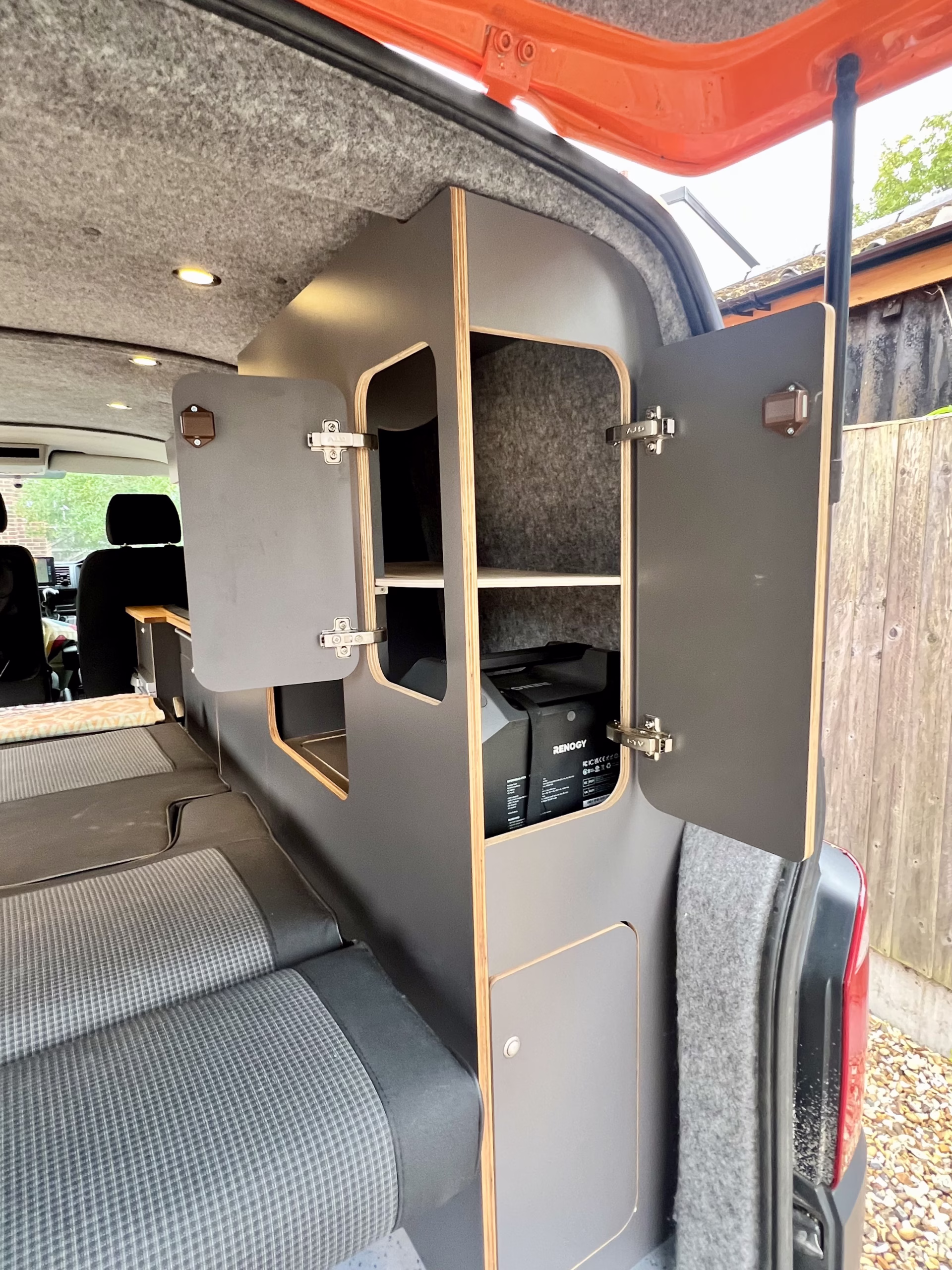 I kept the electrics nice and simple with a small fuse board powered by a portable power station from Renergy. There are two 100w flexible solar panels fixed to the roof. There is an extra battery under the front passenger seat, which is charged off the engine, which is great for extra power and also can help in cold conditions when starting the engine. The inverter is connected to this battery and charges the power station when the engine is running. I preferred this setup because it’s easier to change out, also because it’s portable, you can take the power bank out of the van.