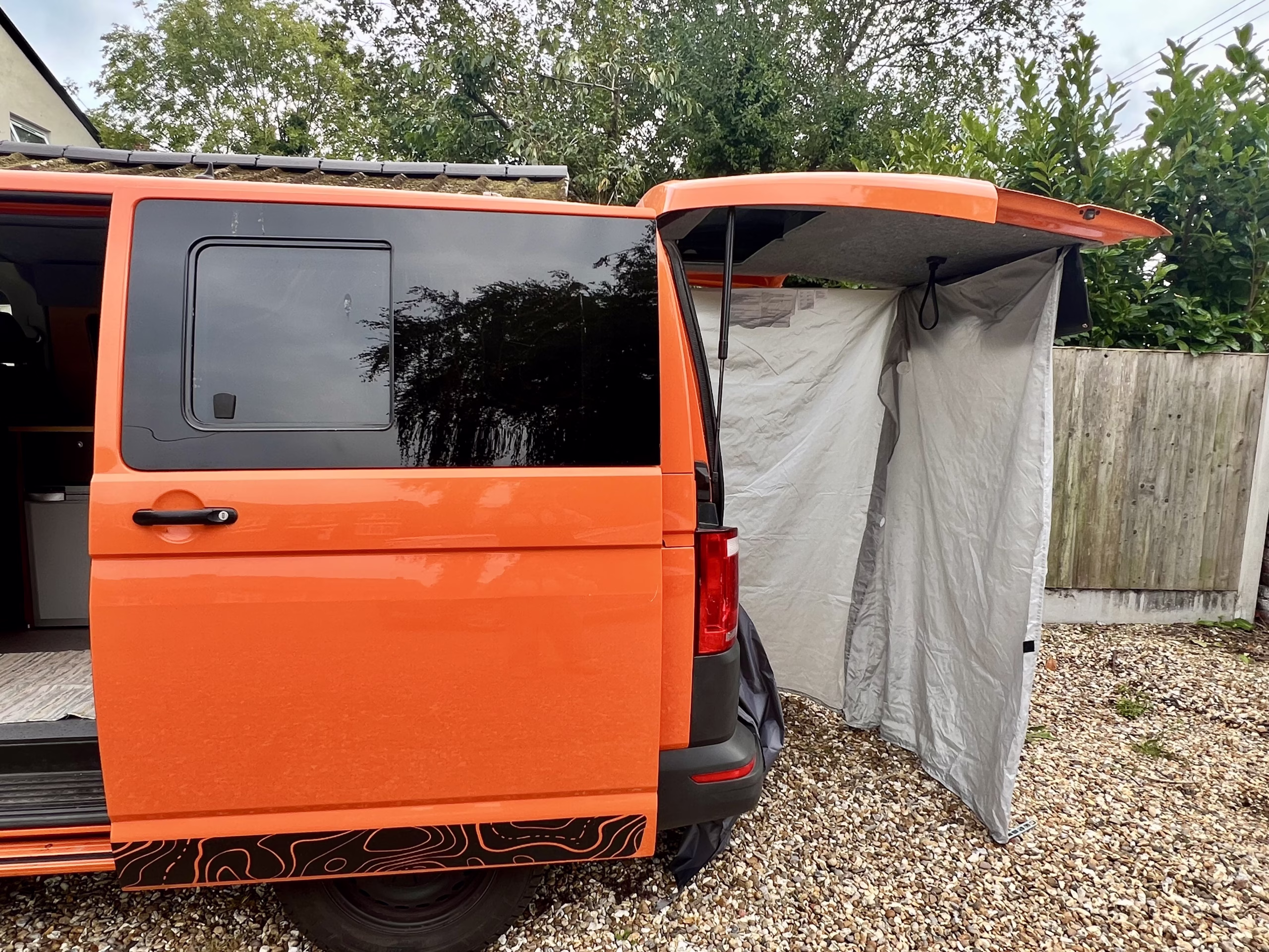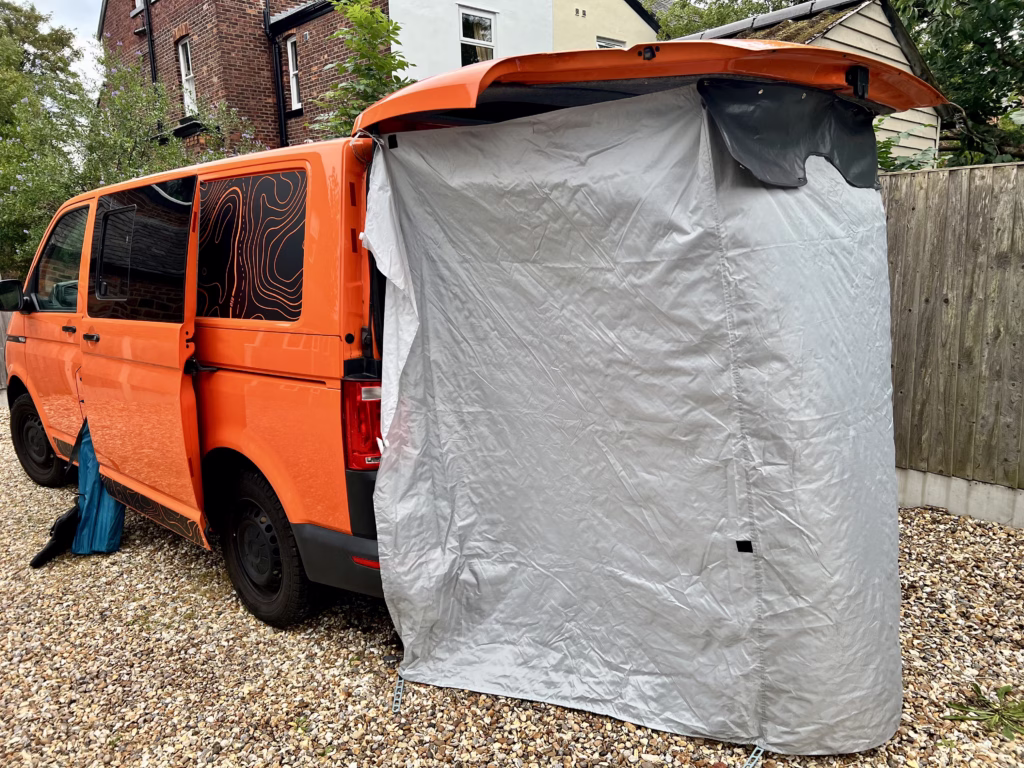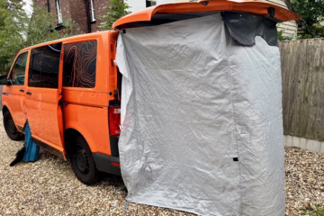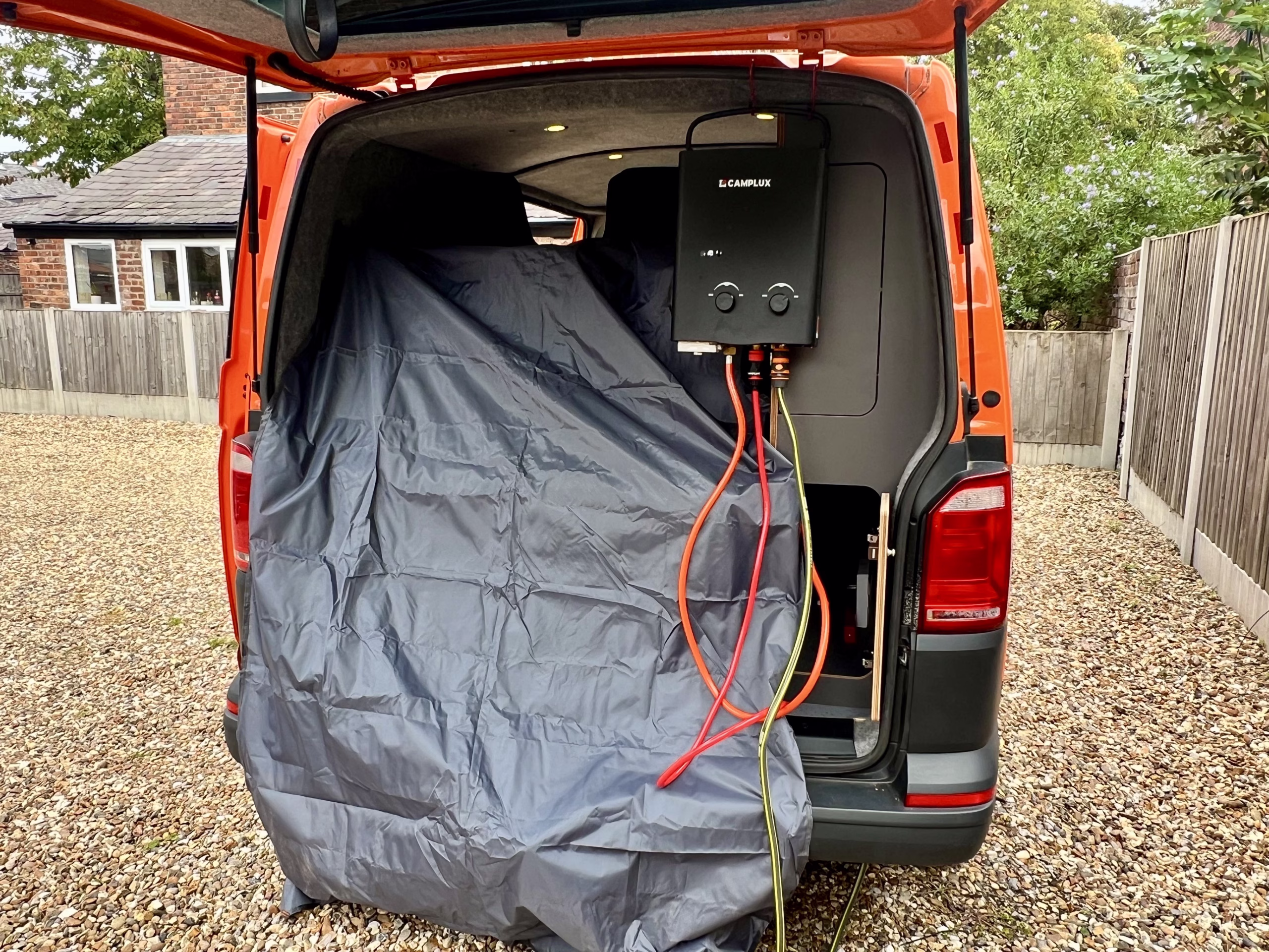 It is fitted with an underslung freshwater tank, which supplies the sink and also powers a portable boiler used for showering. Along with the shower, I also fitted a shower curtain to the tailgate.
