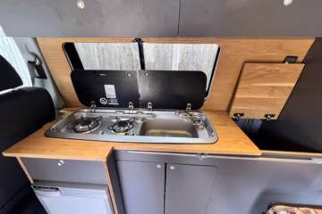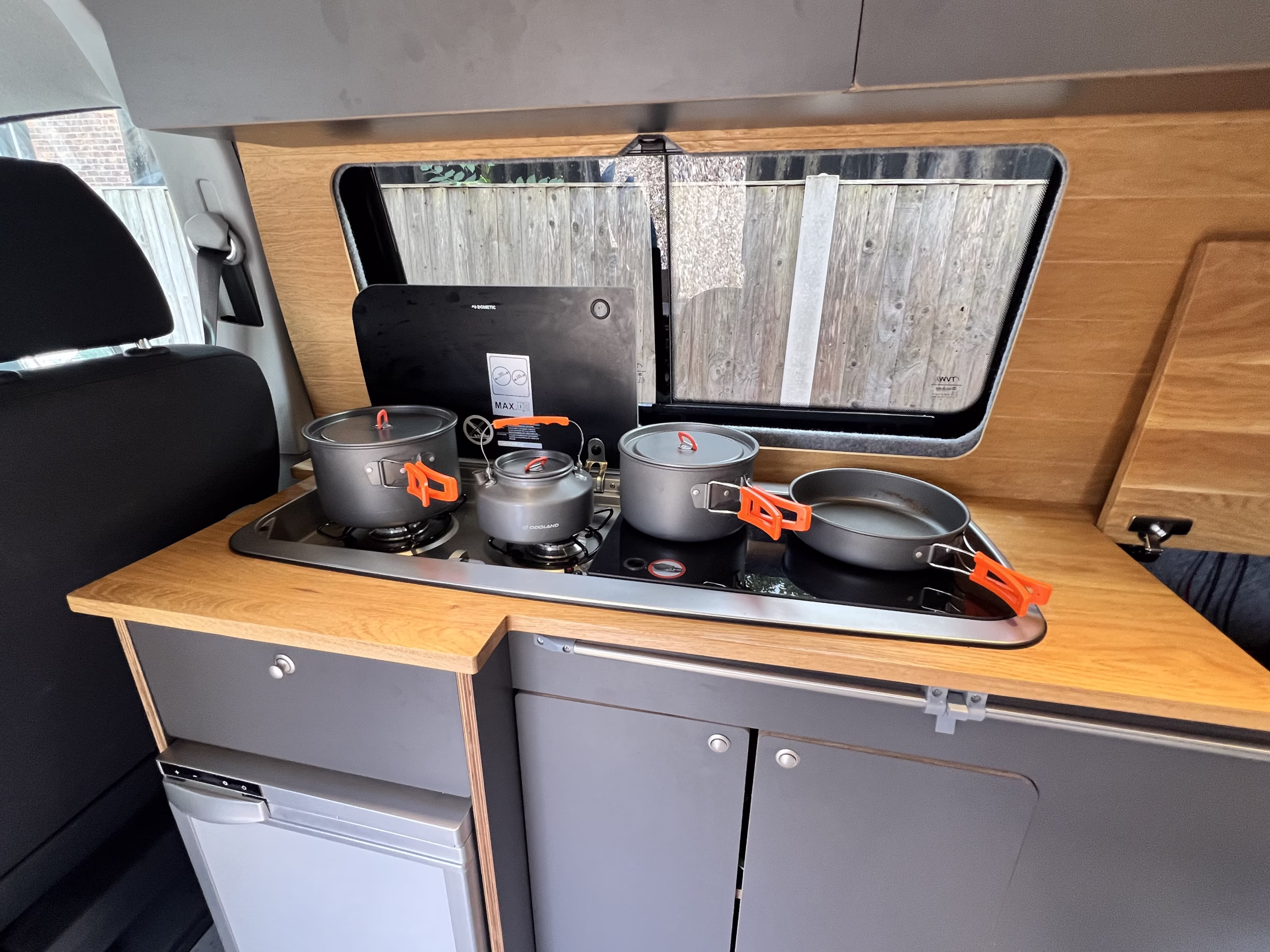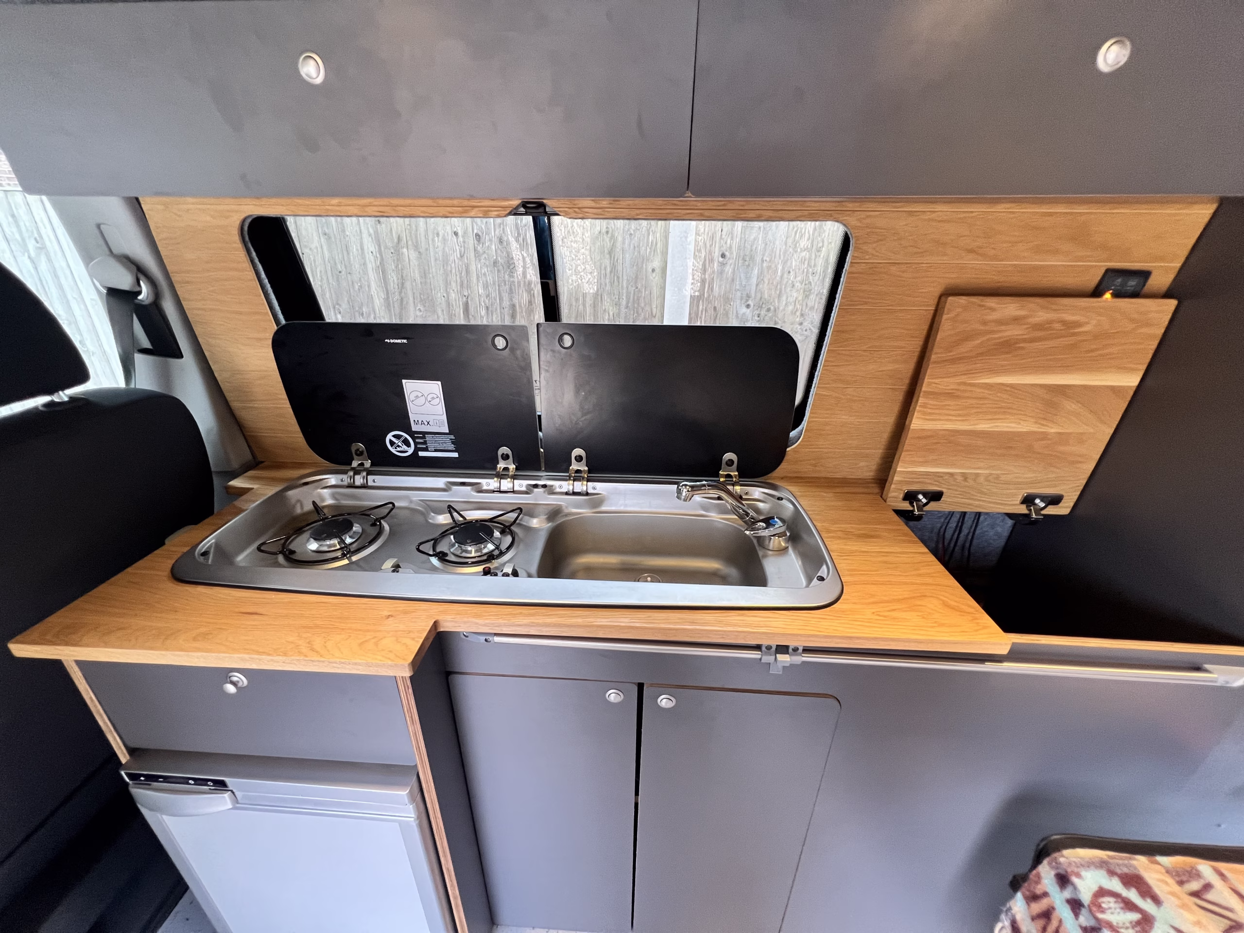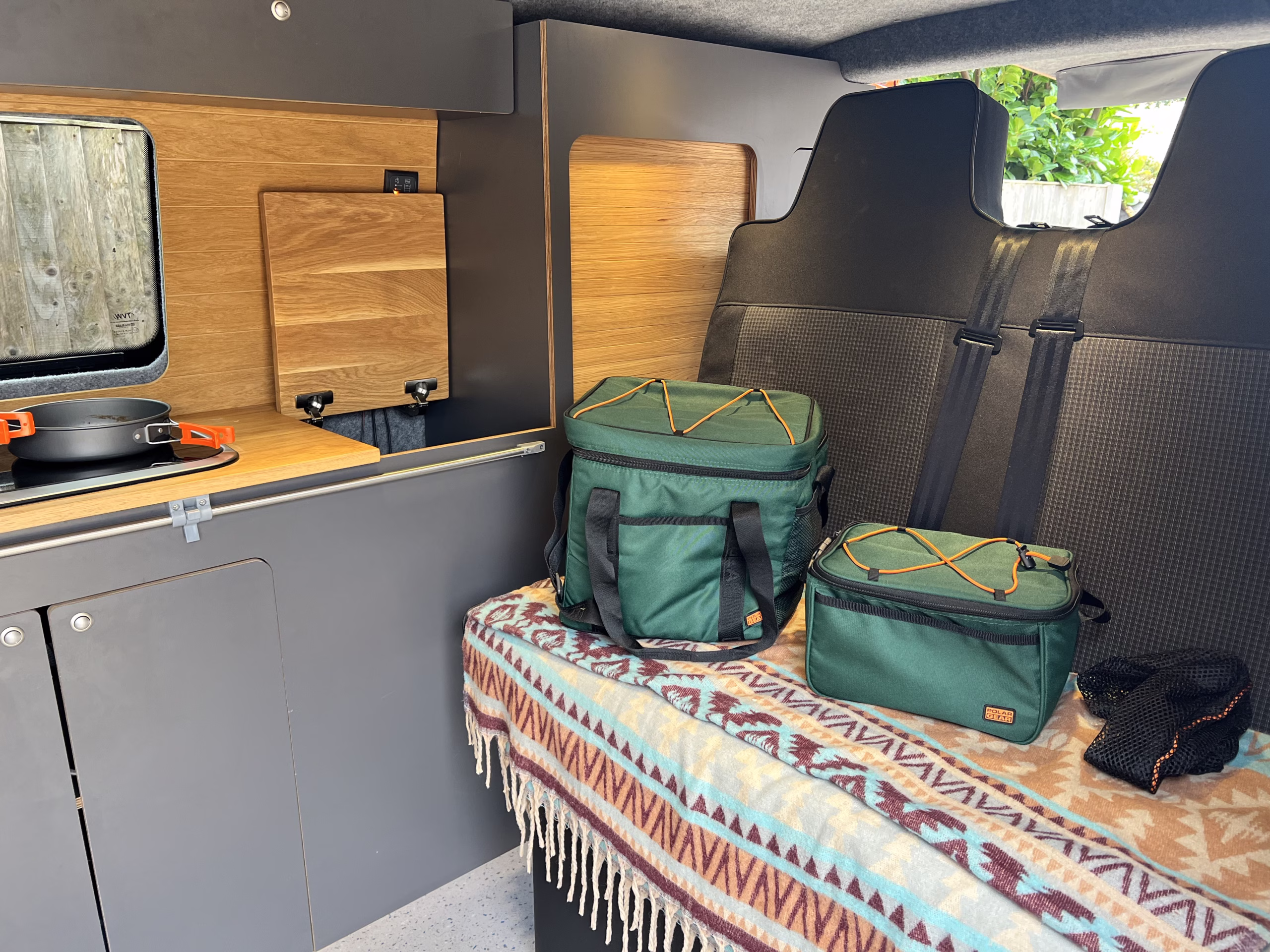 I kept the electrics nice and simple with a small fuse board powered by a portable power station from Renergy. There are two 100w flexible solar panels fixed to the roof. There is an extra battery under the front passenger seats which is charged off the engine which is great for extra power and also can help in cold conditions starting the engine. The inverter is connected to this battery and charges the power station when the engine is running. I preferred this setup because it’s easier to change out, also because it’s portable, you can take the power bank out of the van.