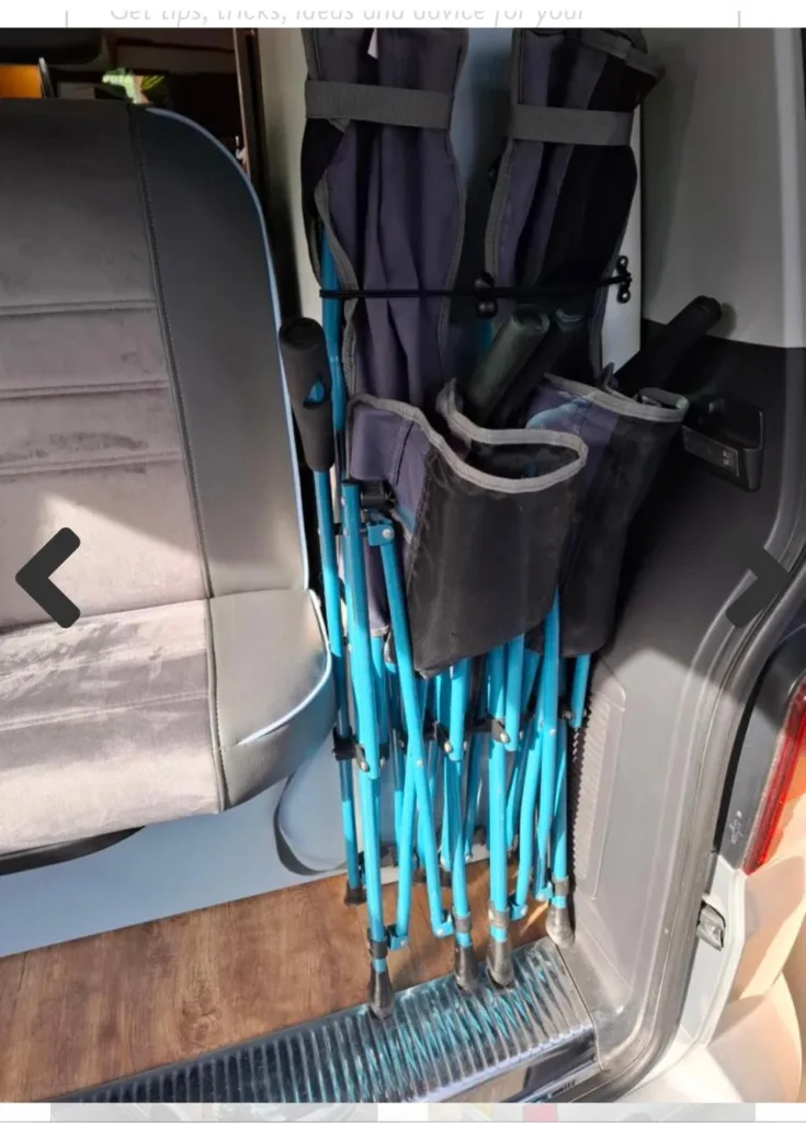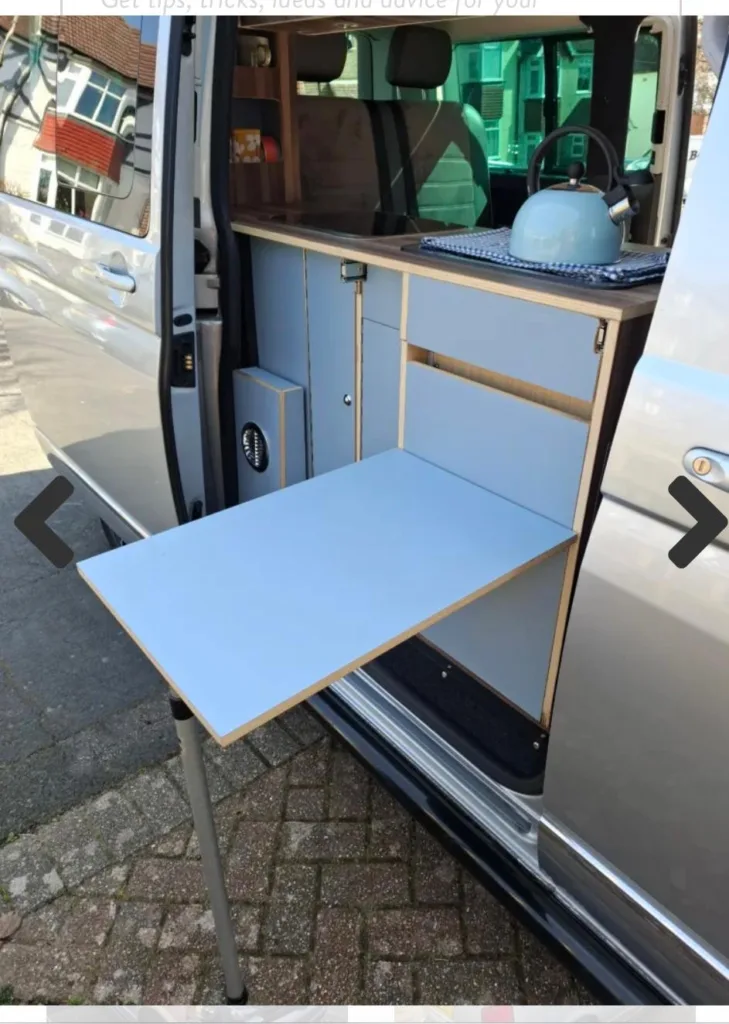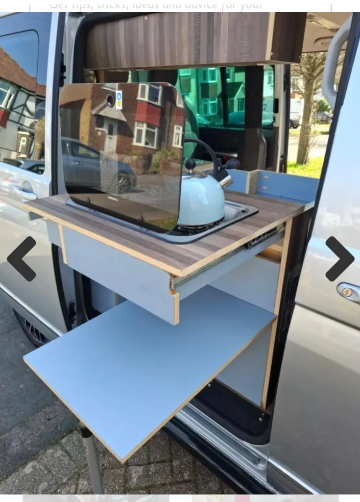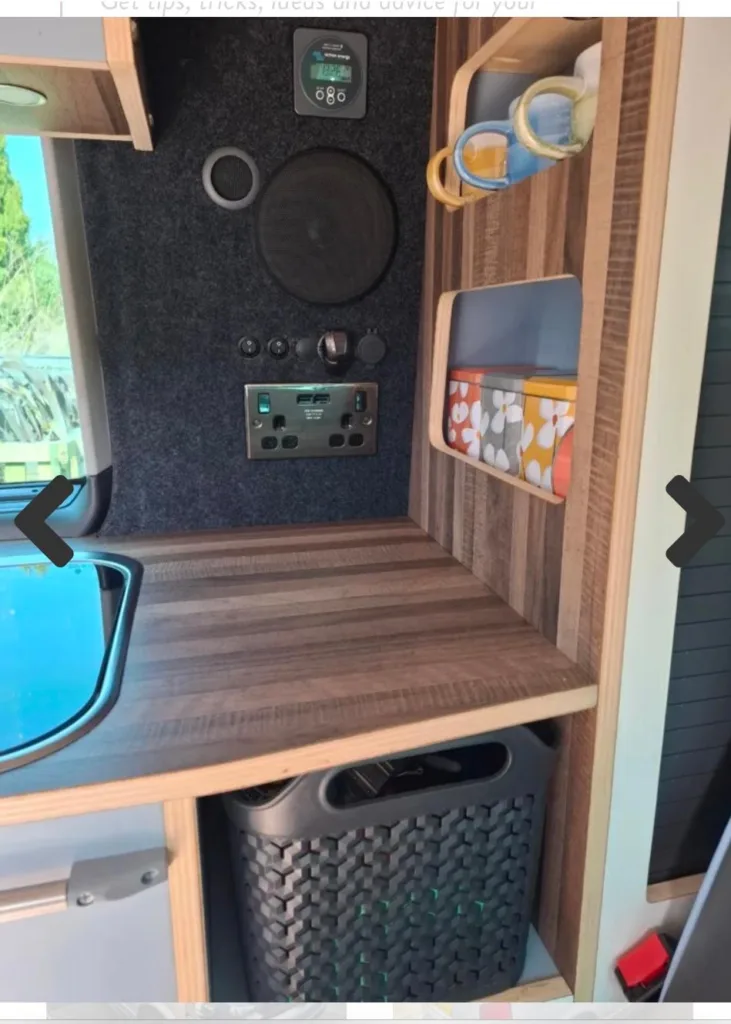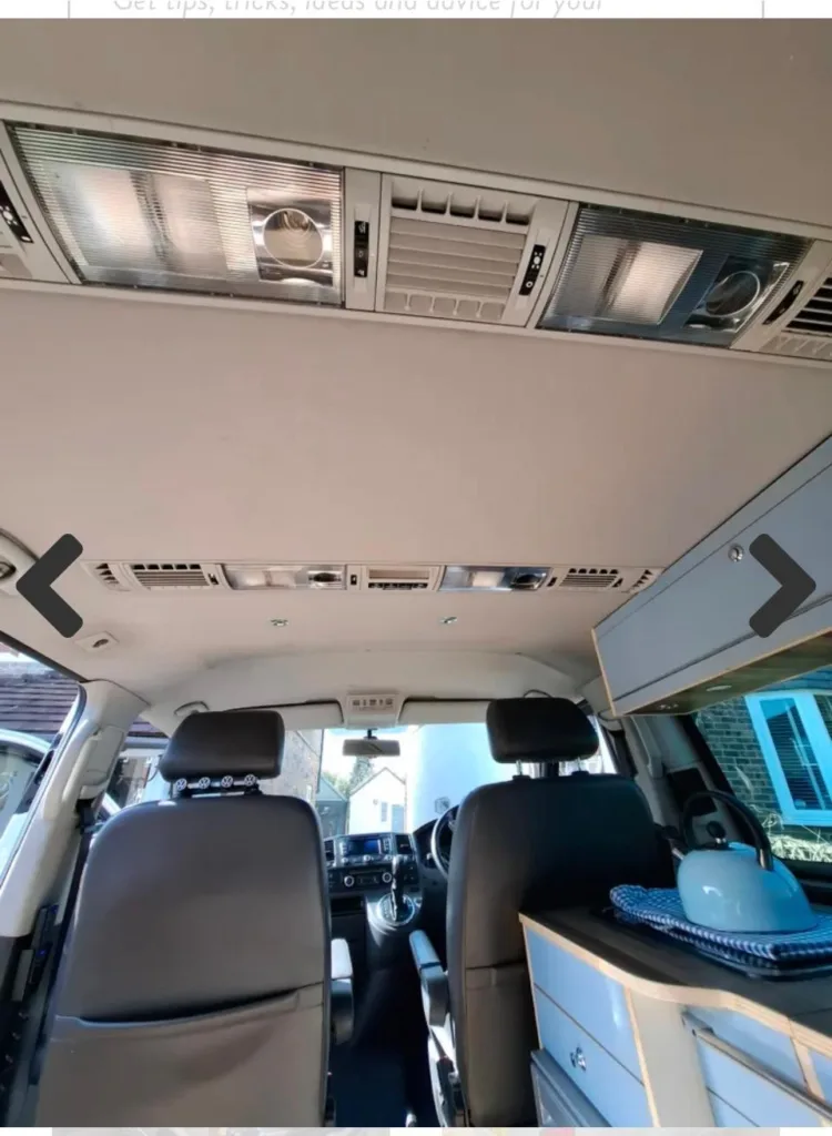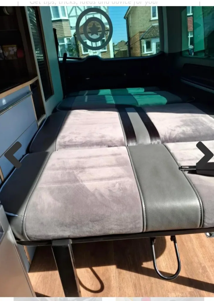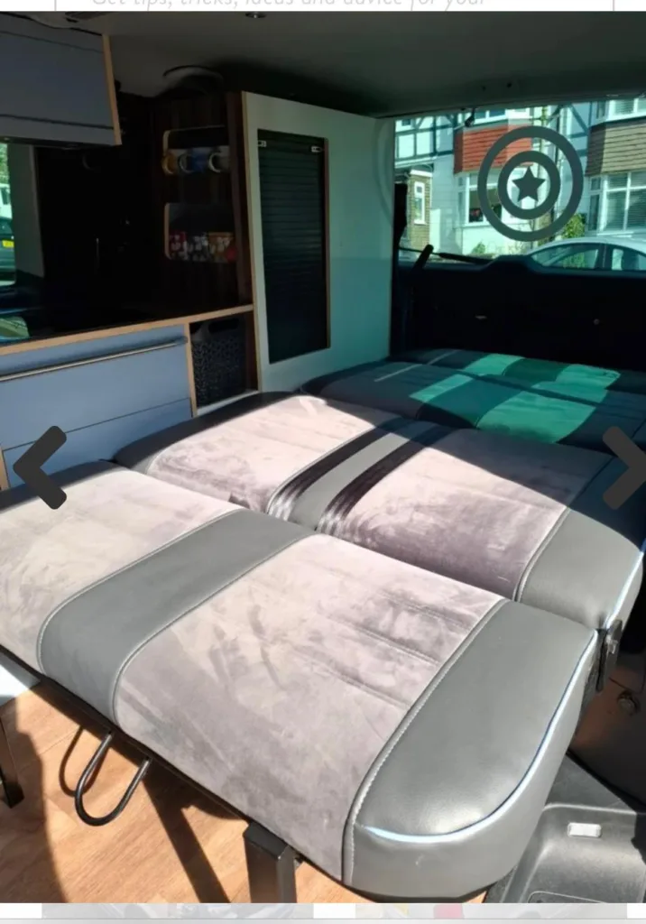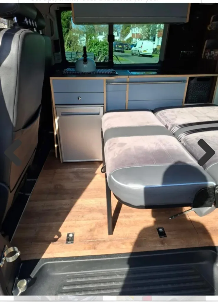 The vehicle itself is very comfortable, benefitting from the Caravelke spec with full glass and sunblinds, A/C all around and sound insulation. We have used it for days out and festivals. The lithium battery and solar panel are useful if you prefer not to be plugged in. The current spec includes: unique underfloor storage front and rear, 3/4 width rock and roll bed with matching seat fabric, handmade curtains, 12v fridge with removable freezer compartment, twin gas hob, cold water sink with removable water tank, plenty of storage including removable trays and quick access for cups, tea/coffee etc. Included are also awning rails on both sides, sun shade and airbeam awning with 2 berth inner tent. There is a full 12v system with a 100 amp lithium leisure battery, Led lighting including reading lights, coloured camping lights inside and out and USB charging points. The leisure battery can be charged using the powerful CTEK charger when driving, the Victor Energy 240v charger when plugged in or by using the solar panel. The 12v system can be monitored via the Victor screen or using the Victron App or battery monitoring App.