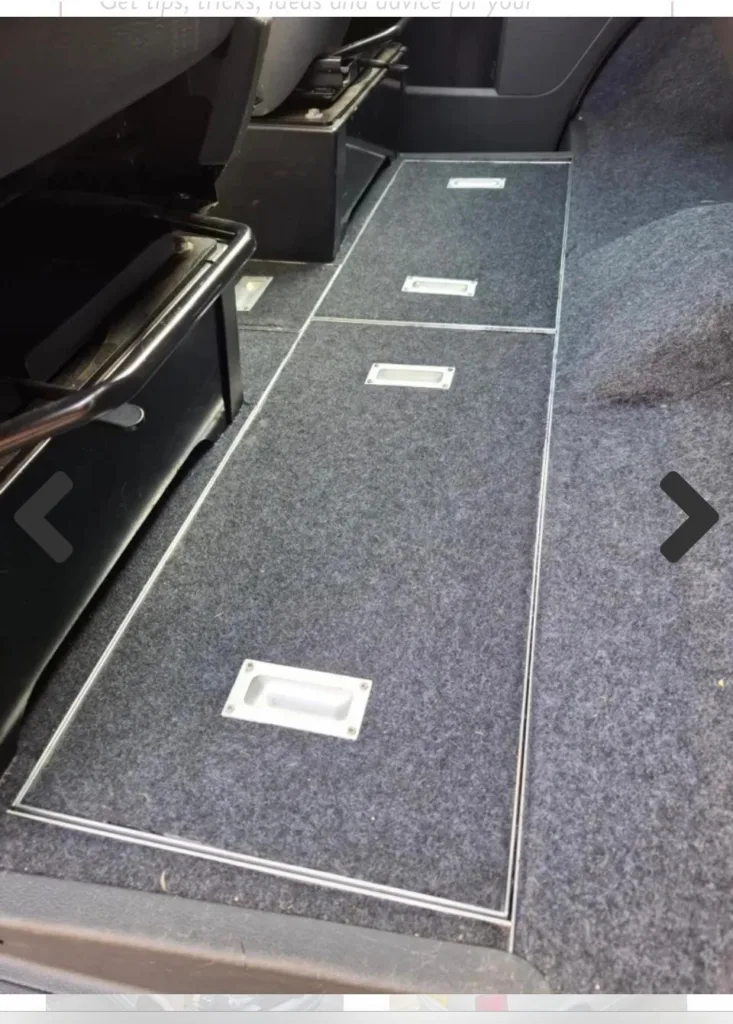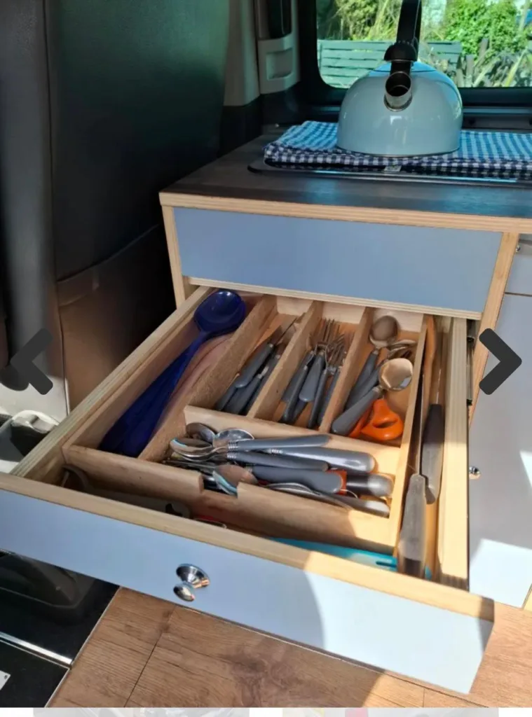 Apart from the under floor storage, under and over counter cupboards, there is side storage behind a tambour door, lots of under bed storage accessed from front or rear, rear wardrobe storage, a place for your camping chairs as well as a mount for the camping table under the tailgate. Both the front seats have swivel bases so four people can sit at the table inside, there are several other table options inside and out (see photos). There is a slide out cooker and table if you wish to cook outside. The double doors are also handy for ventilation.