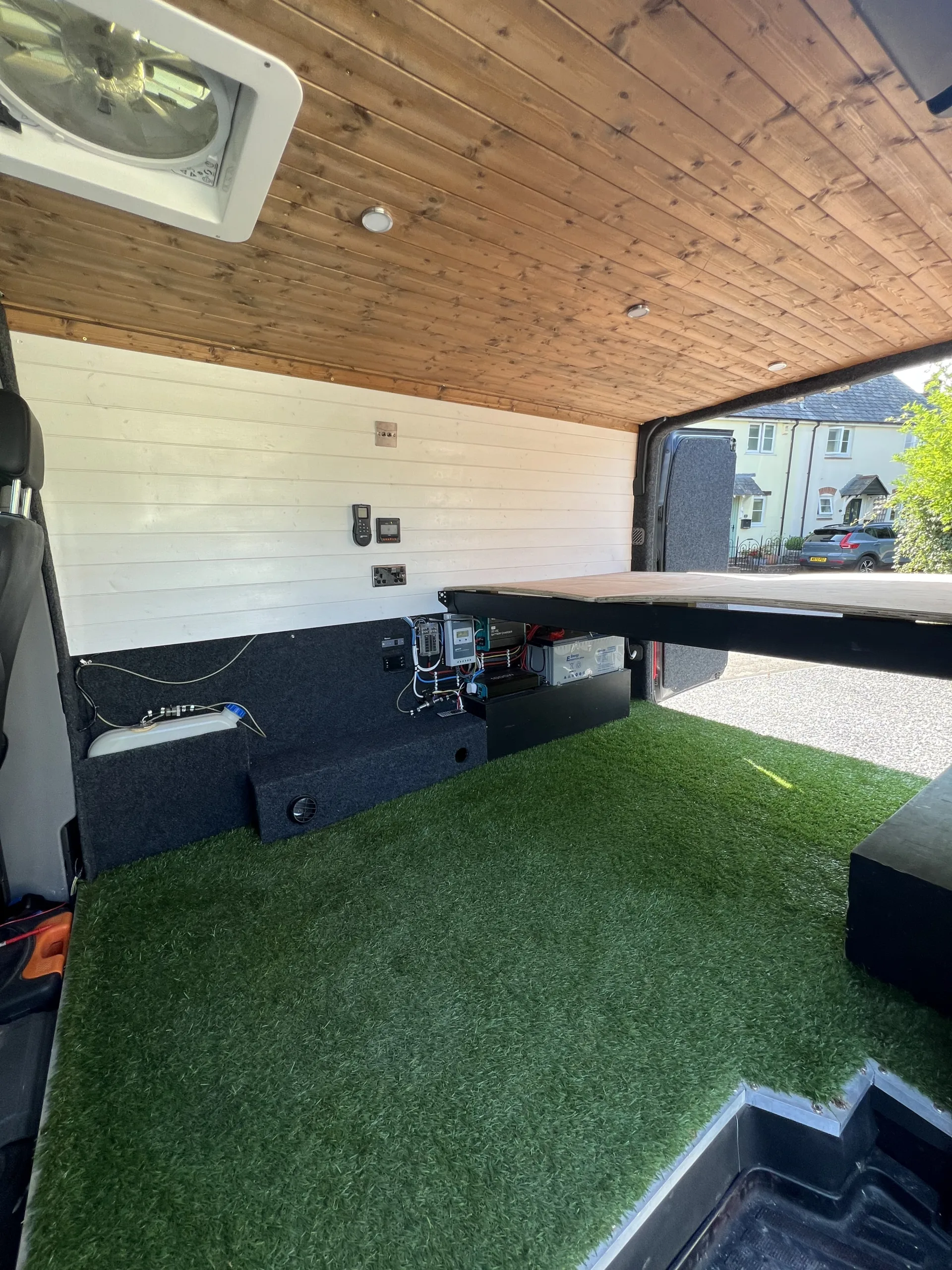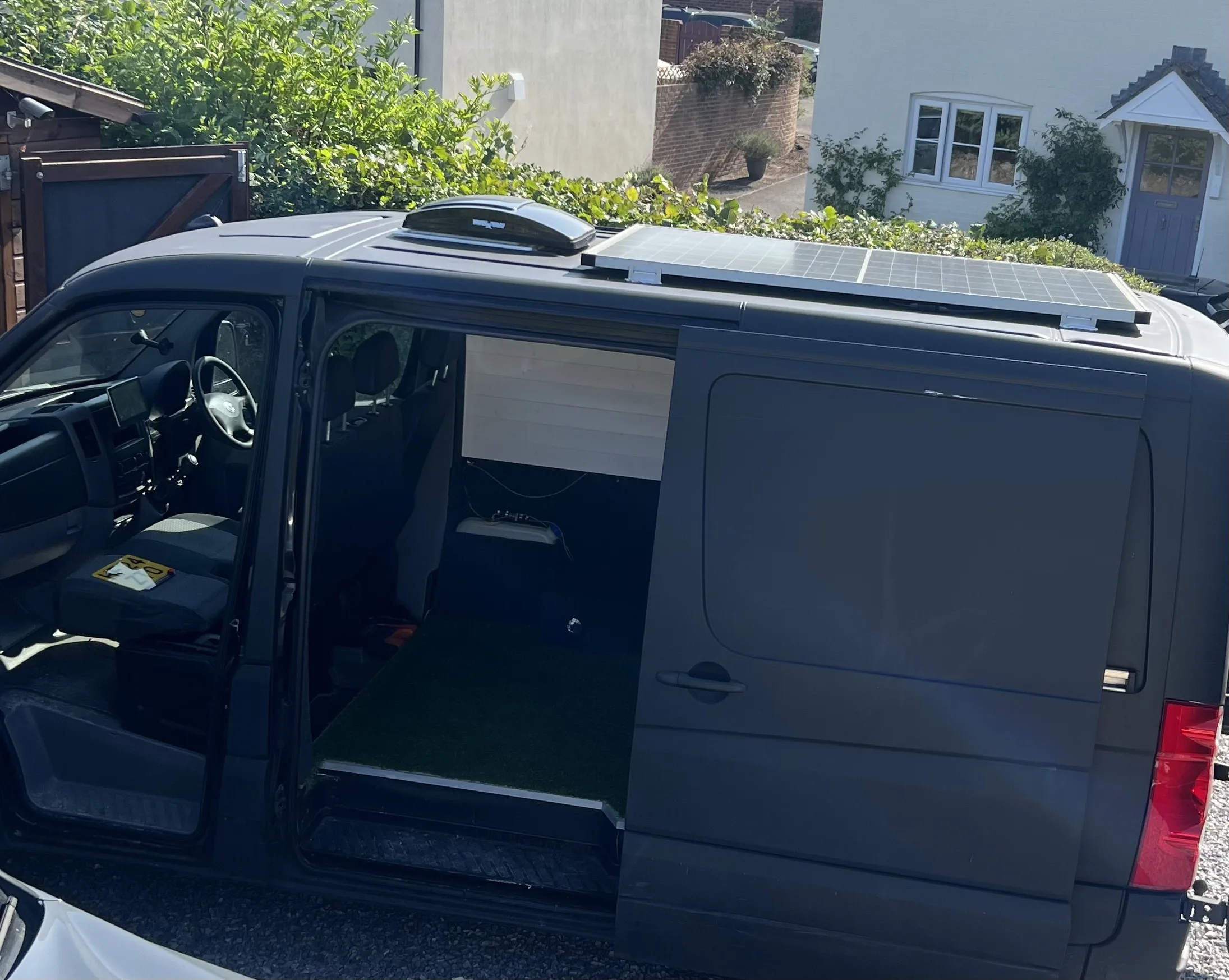 Converted van, brand new engine which has done around 17000 miles, full service history, solar panels, leisure battery, converter, lights, LED, double socket, diesel heater, roof fan, Raptor Matt black paint, removable ply shelf (ideal for mattress topper) happy to take offers