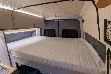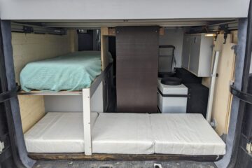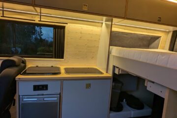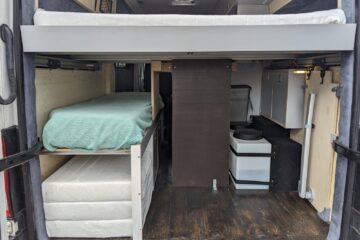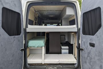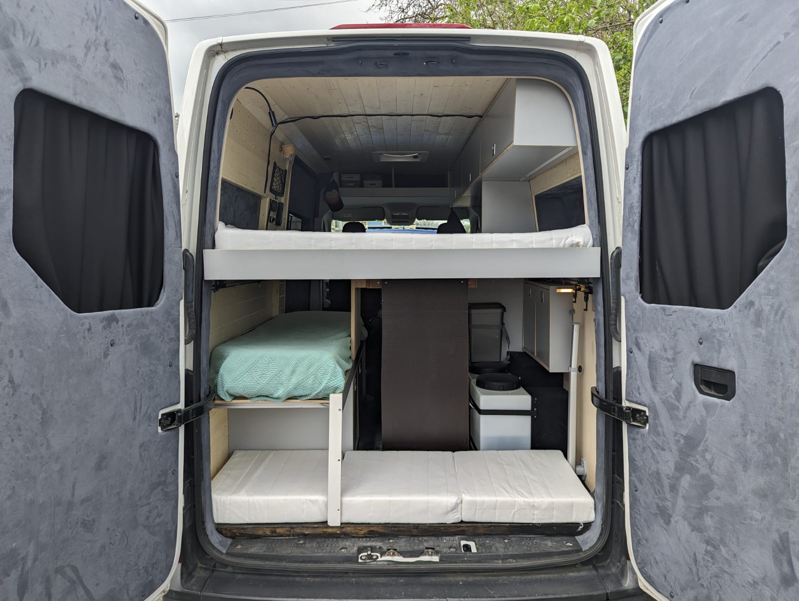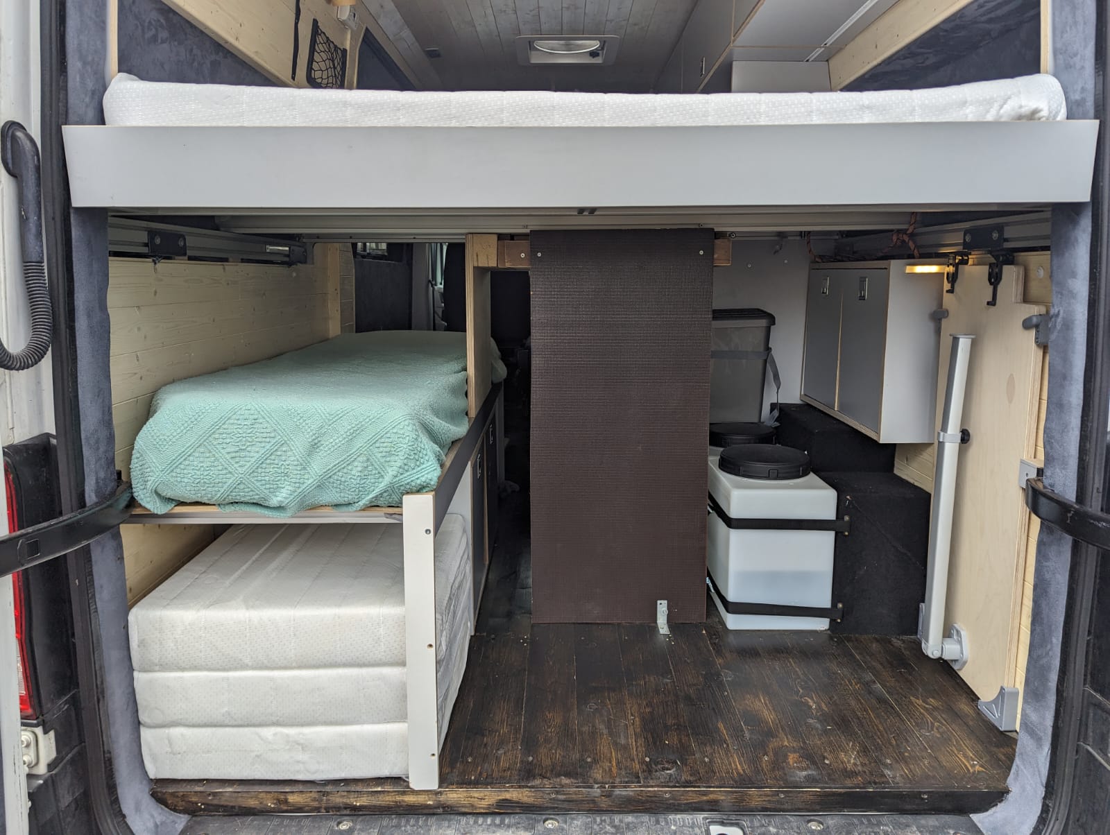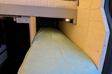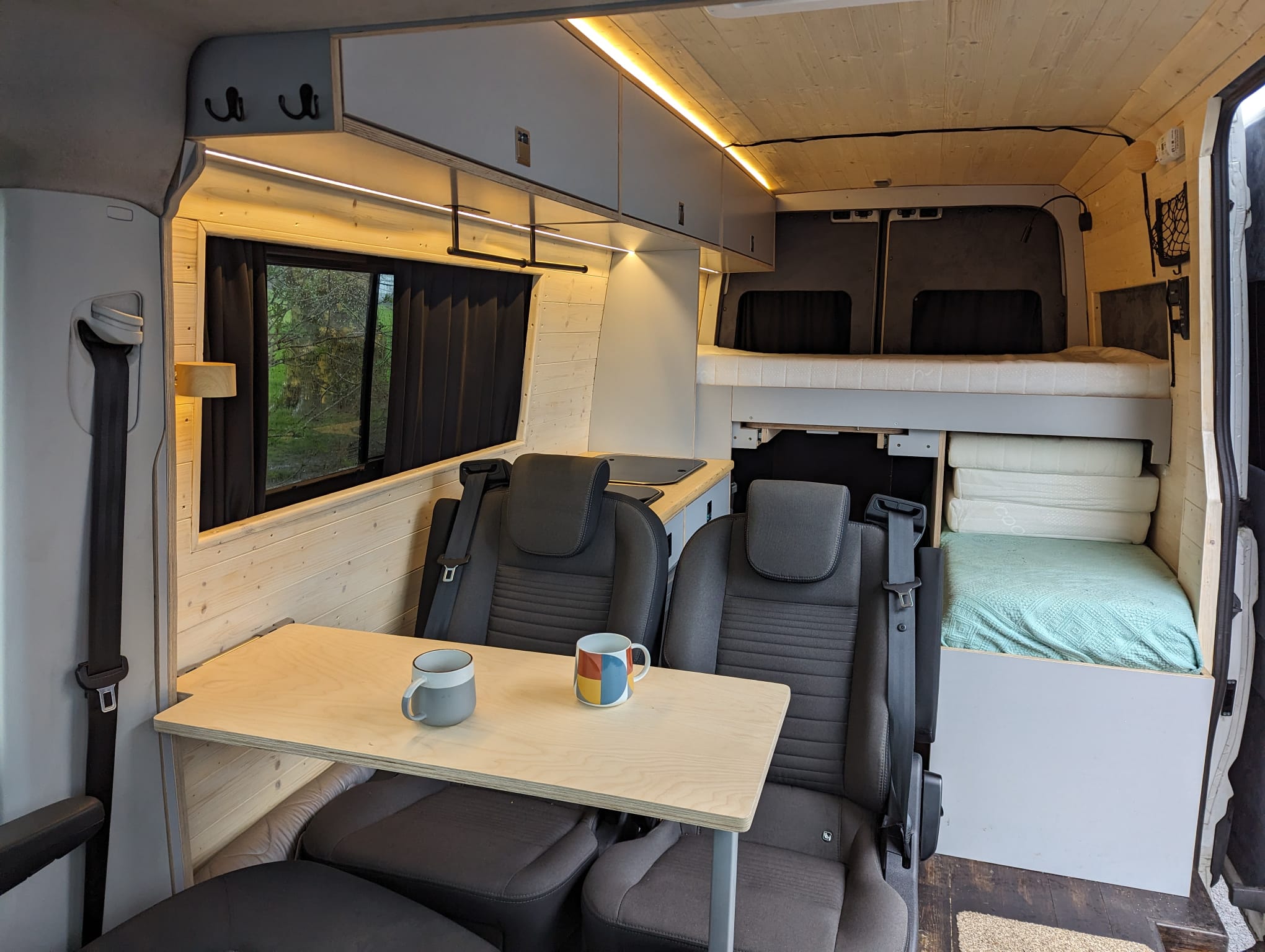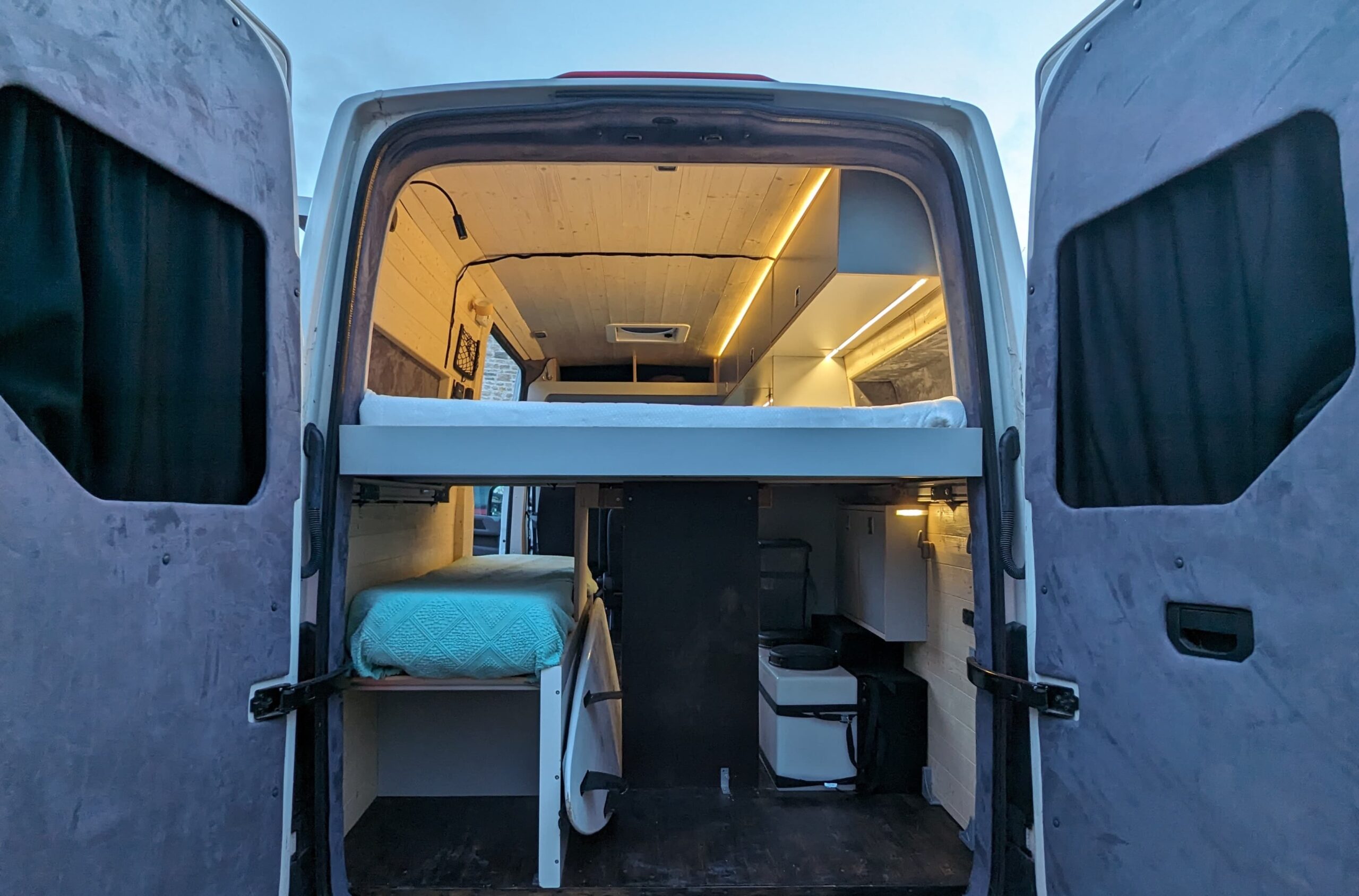 The flare on the side of the van allows for a full length (and width) double bed. I am just shy of 6 foot and sleep comfortably stretched out. The single bed underneath is full length. There is also space to set up a child’s bed across the back (160cm long) with three mattress cushions provided for this purpose (as it happens this bed can go in the front area and we also have a cot that fits next to the single bed if required).