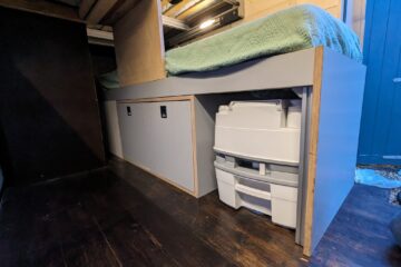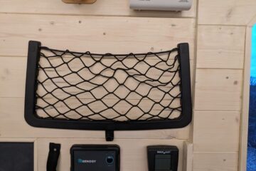 It has plenty of storage with 3 large cupboards above the kitchen and bed area, 2 storage selves above the cab, a cupboard under the kitchen and a huge garage space. We have split the garage into a front and back section and have space for a surf board to fit down the side of the single bed.