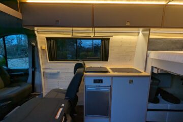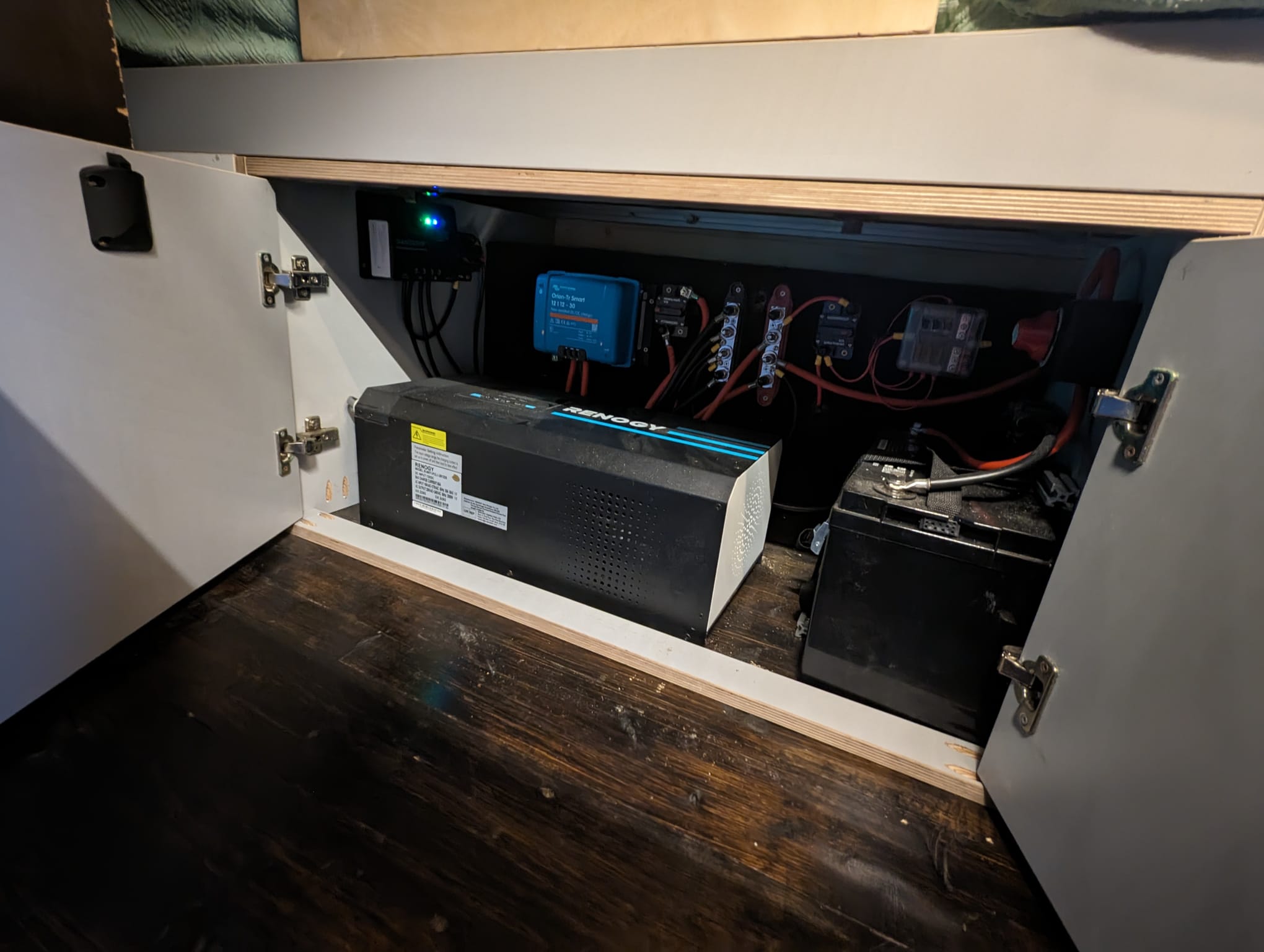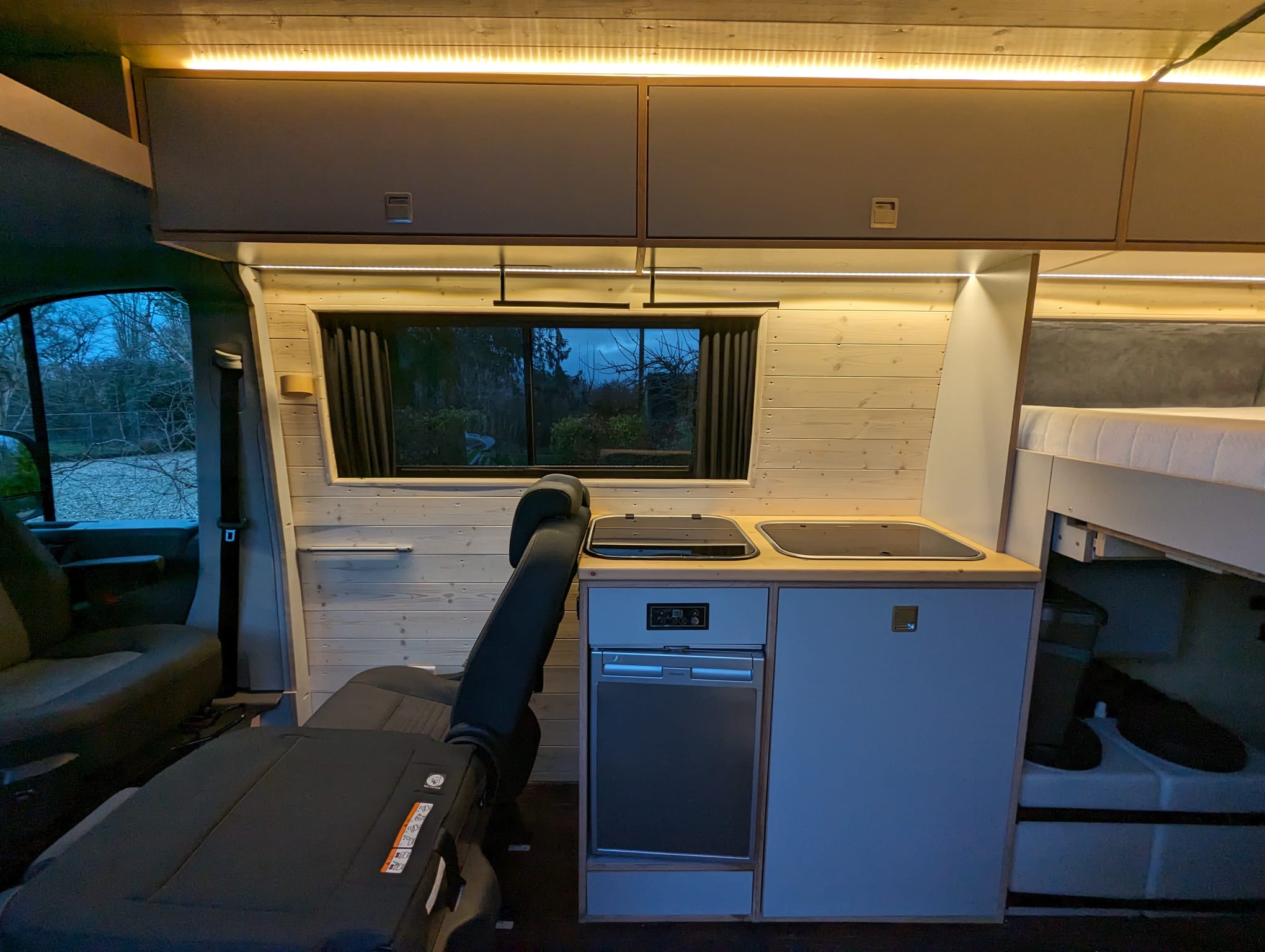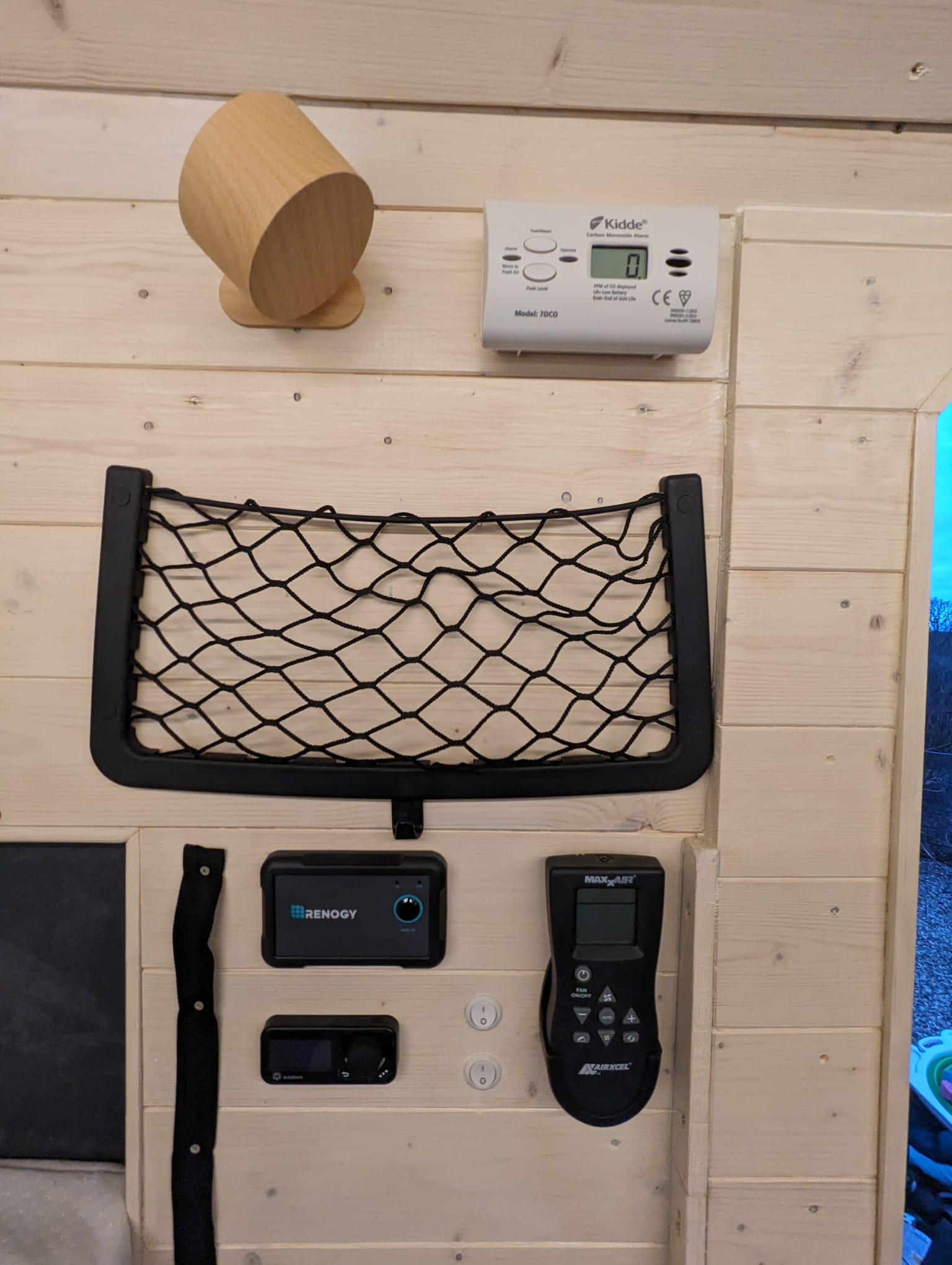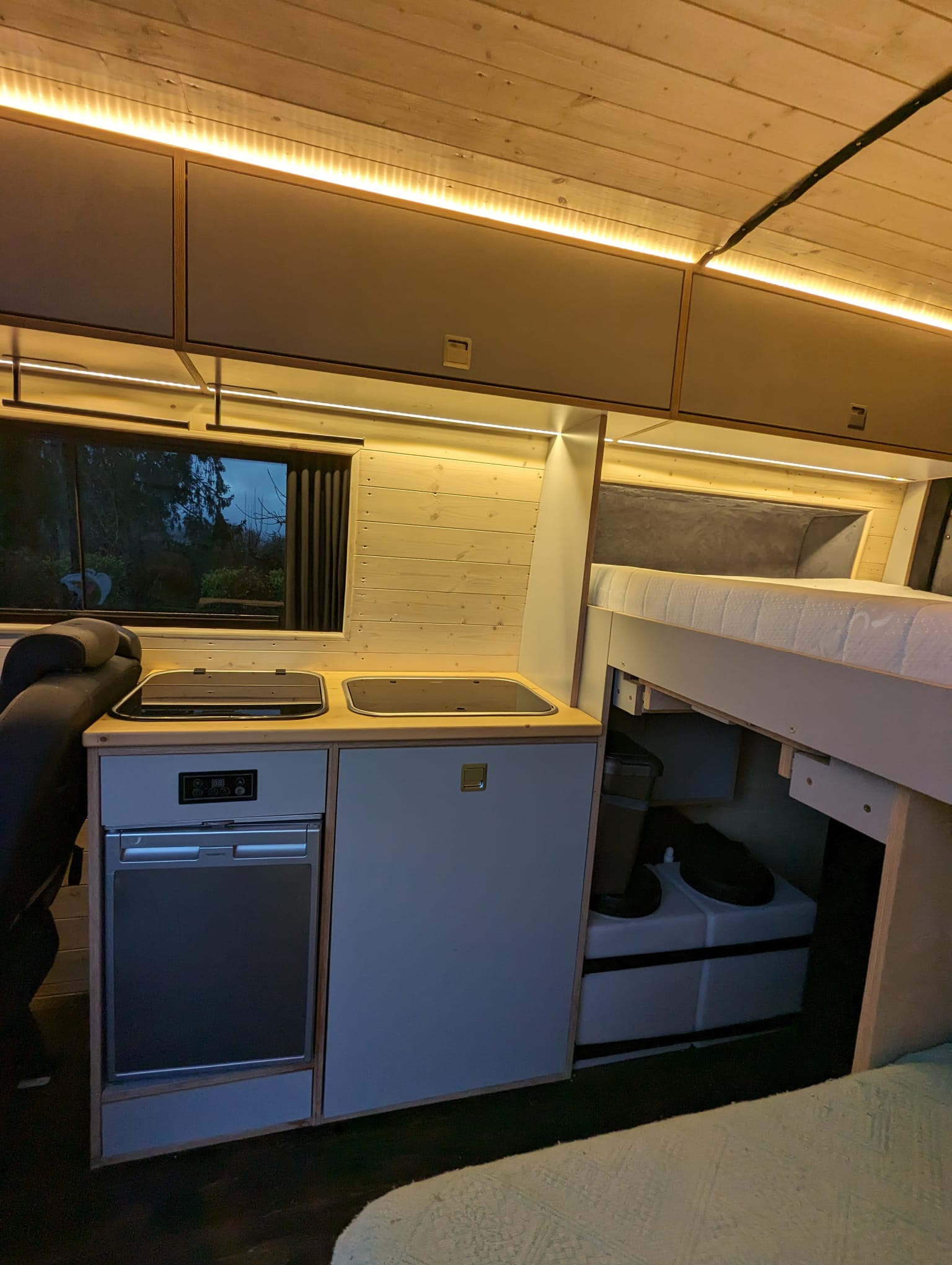The van can be plugged in if required but as it has 3 solar panels on the roof feeding a 12v 100Ah Bluetooth Lithium Iron Phosphate battery, so it works very well off grid. We have regularly used this van in sub zero temperatures and had the heater and fridge running all night. The bluetooth system means you can connect to your battery and see exactly what is the state of charge / voltage etc at any time. There is a converter which will convert to standard 3pin plug sockets. There are usb sockets around the van as well for charging smaller devices. There are small lights for reading and 2 led strip lights mounted above and below the cupboards to give good even light.