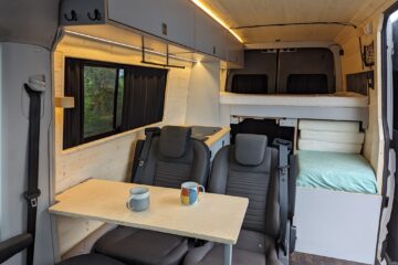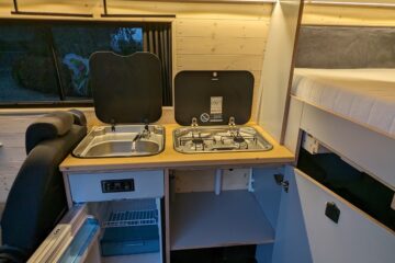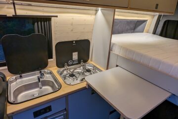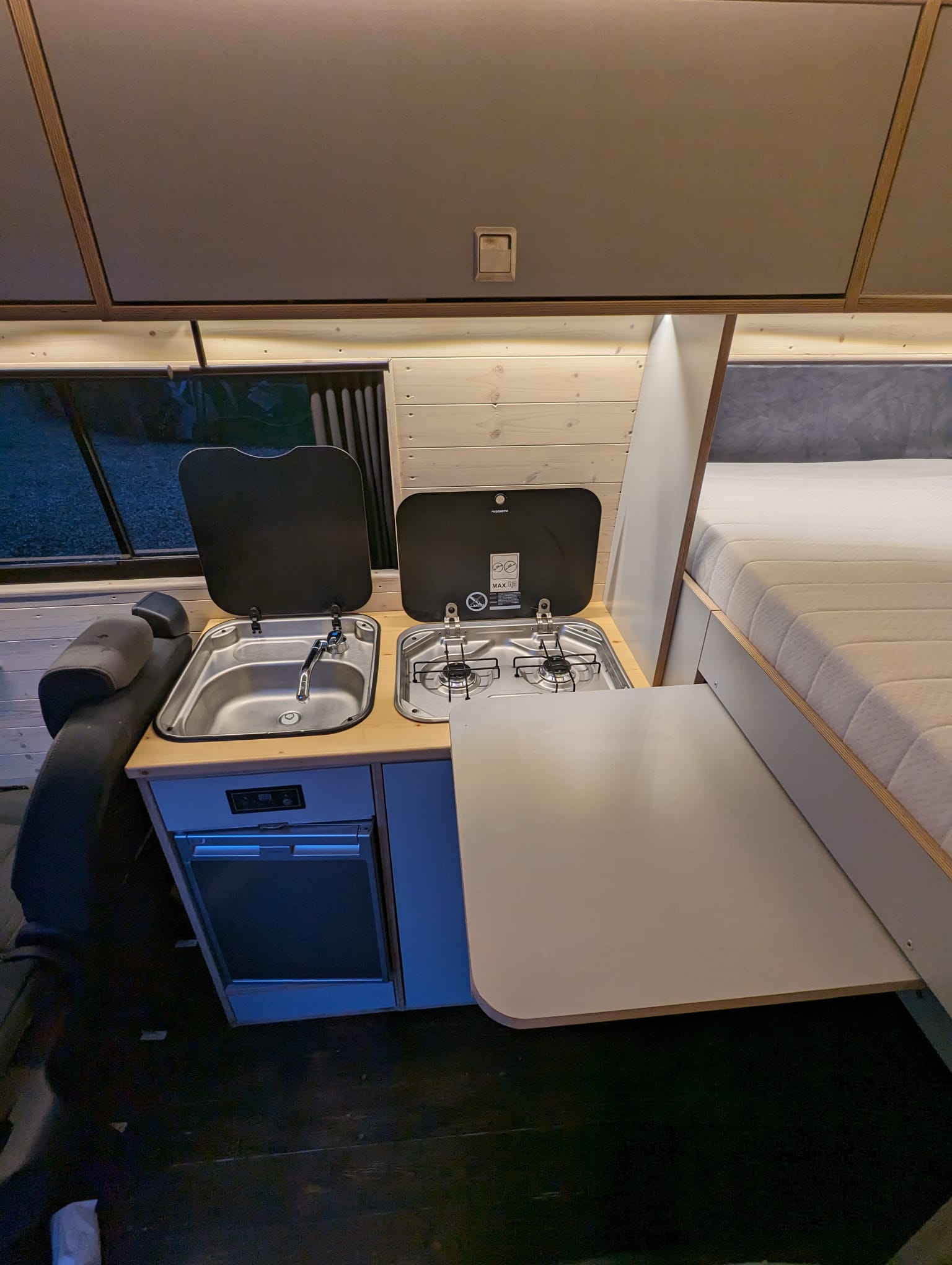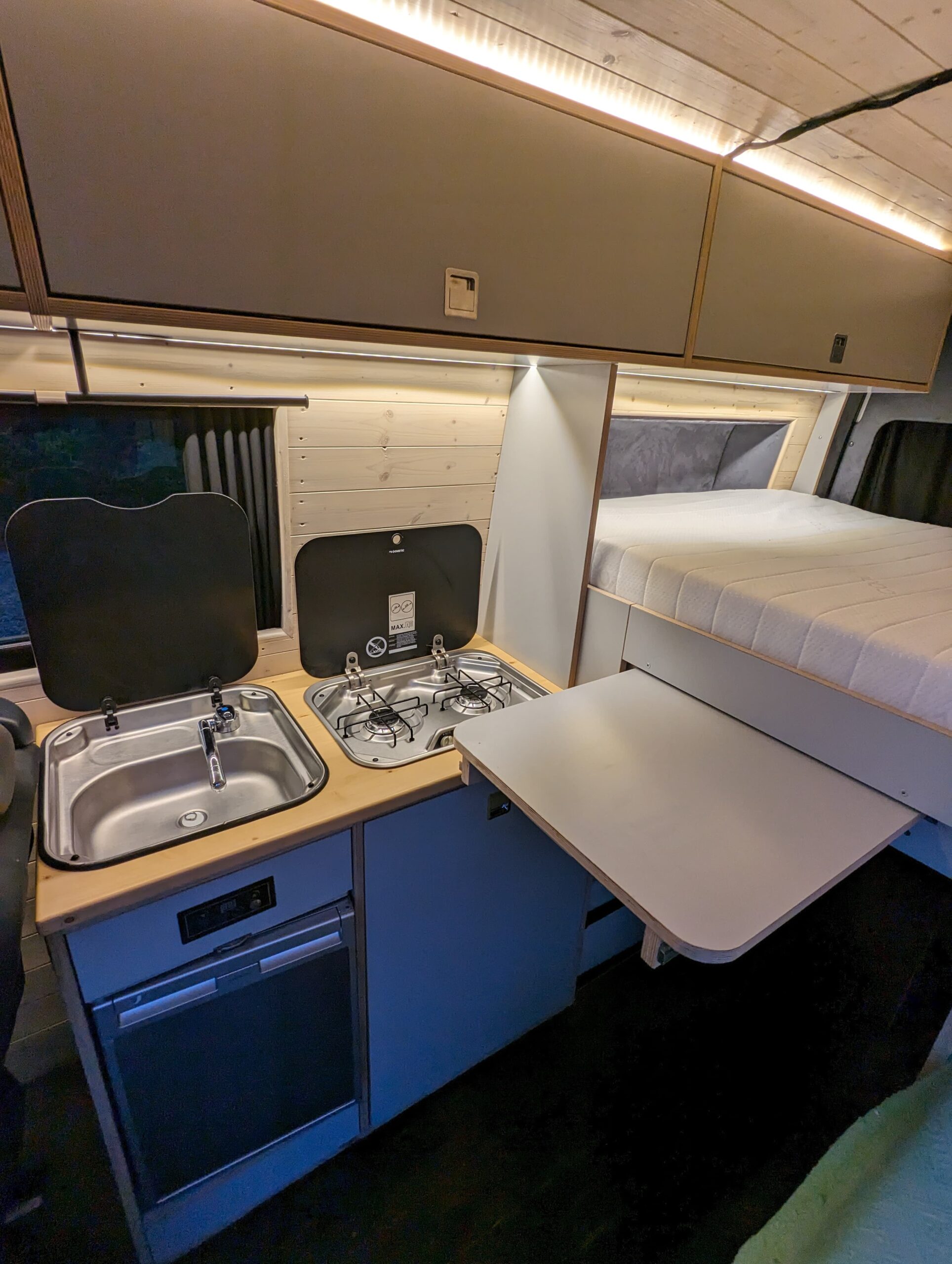 The quality of this conversion is excellent with high spec kit used. The front seats swivel very easily and the back passenger seats are comfortable and easily removable if you prefer to have the space on a longer trip. It features a Maxxfan roof vent / fan system, a Dometic fridge, a sink with 30l water tanks, a double gas hob fitted with a campingaz 907 bottle safe, a pull out kitchen prep table, a Thetford porta potti, usb and 3 pin plug sockets and an Autoterm Comfort Control diesel heater that has kept us comfortable in sub zero temperatures.