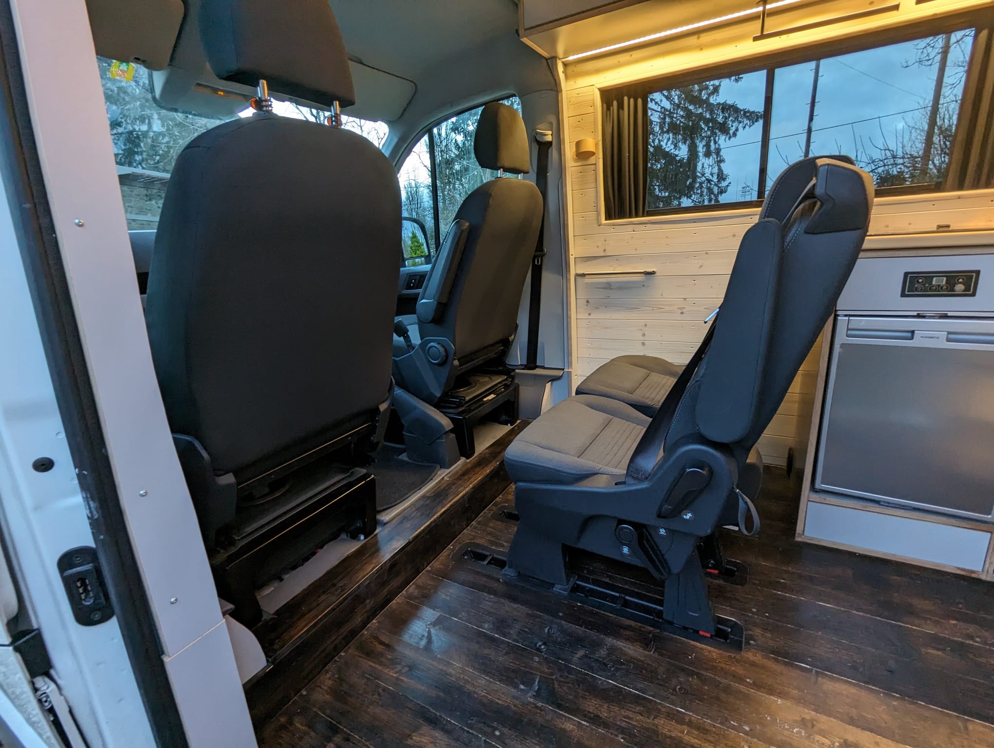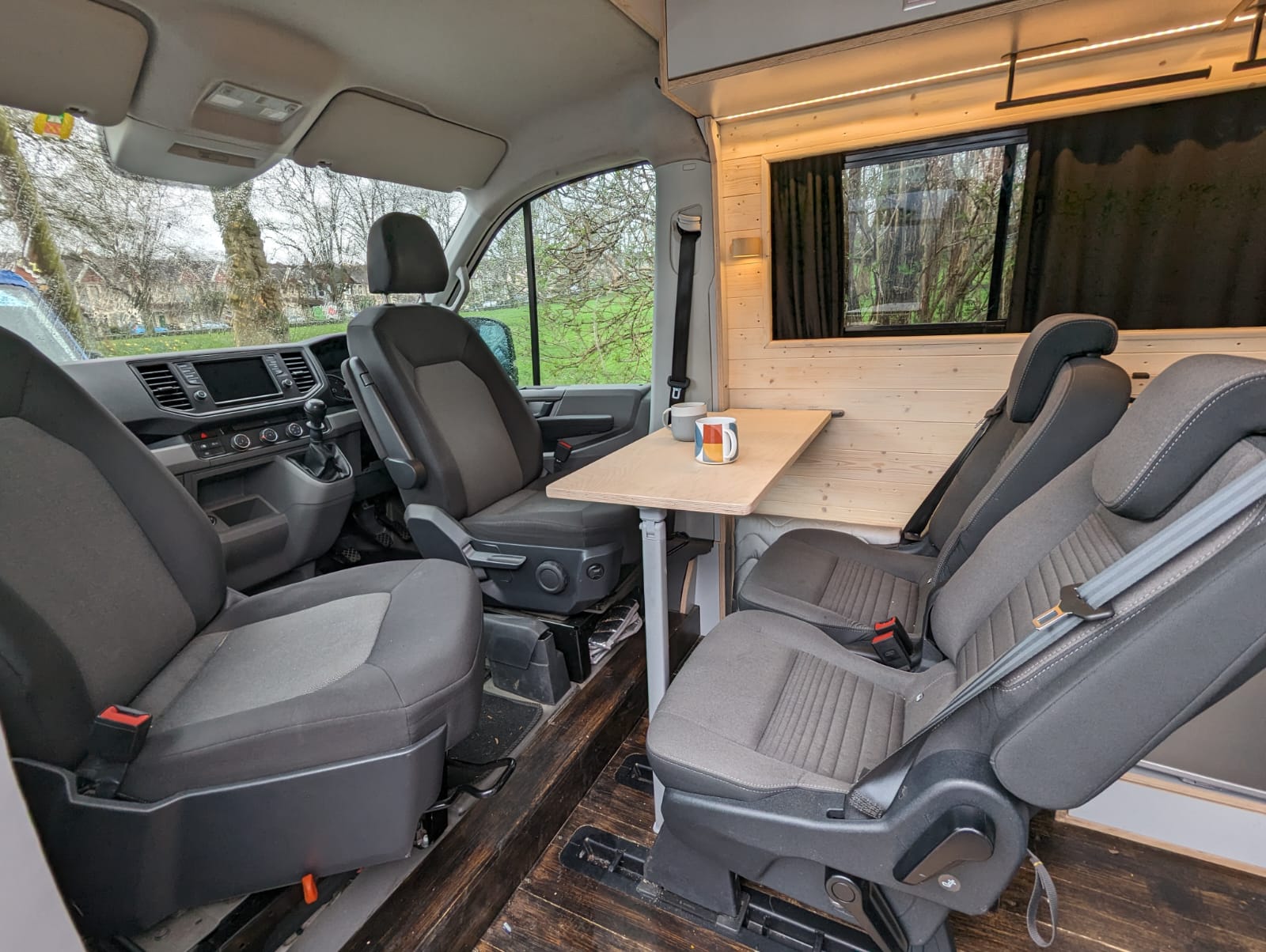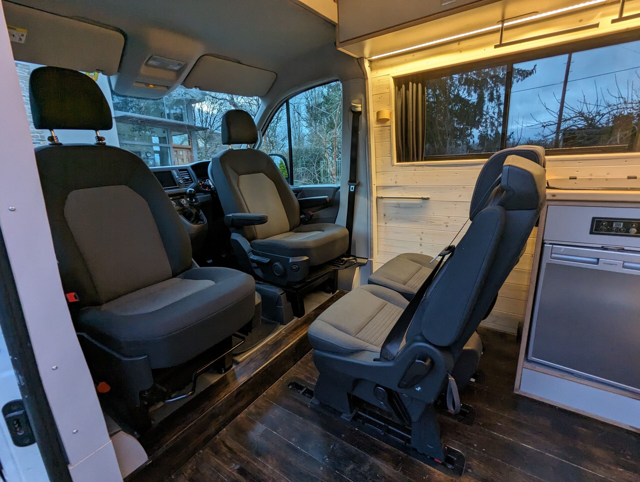 The front seats swivel easily to face the back. The drivers seat has double arm rests and both recline and are comfy for long journeys. The back seats are very comfy, recline-able with arm rests and fold flat, upright or are easy to remove completely if you want more space for a trip. The end of the single bed also acts as a comfy seat when lounging at the camp site.