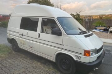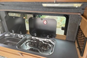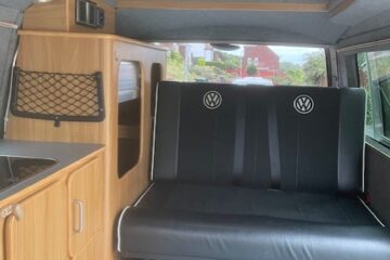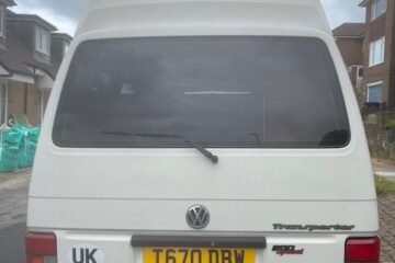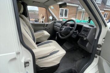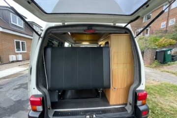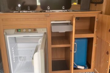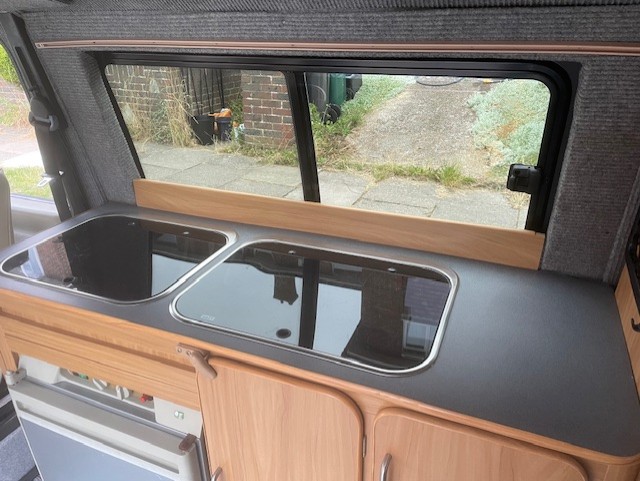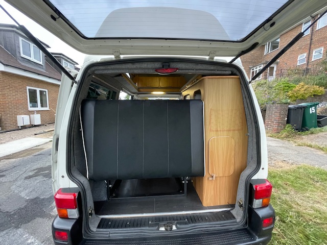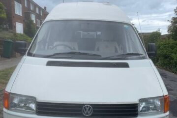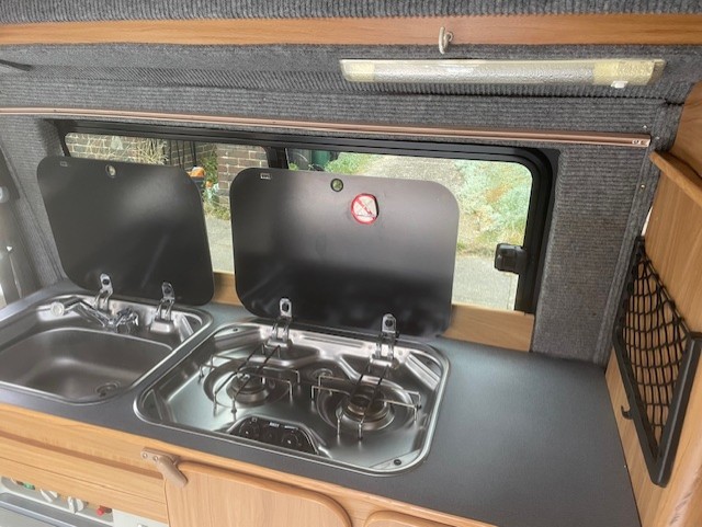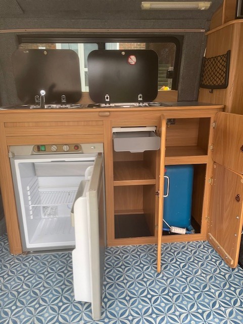 Fridge: gas/mains/12v. 2-ring gas hob. Sink and running water. 12v sockets and internal lights plus mains sockets. Tinted windows at back plus rear side windows. JVC radio. Captains seats at front (passenger seat turns 180). Rock and roll bed: double seating at rear (with two 3-point seat belts) folds out to large, comfortable bed. Area in high top can be used for sleeping – ideal for 2 children or 1 adult. Eye-level storage cupboards, wardrobe (with tambour door), kitchen base cupboards, plus extra space underneath bed. Aerial base on roof with cable in situ inside van. Power steering. Reversing sensor.
