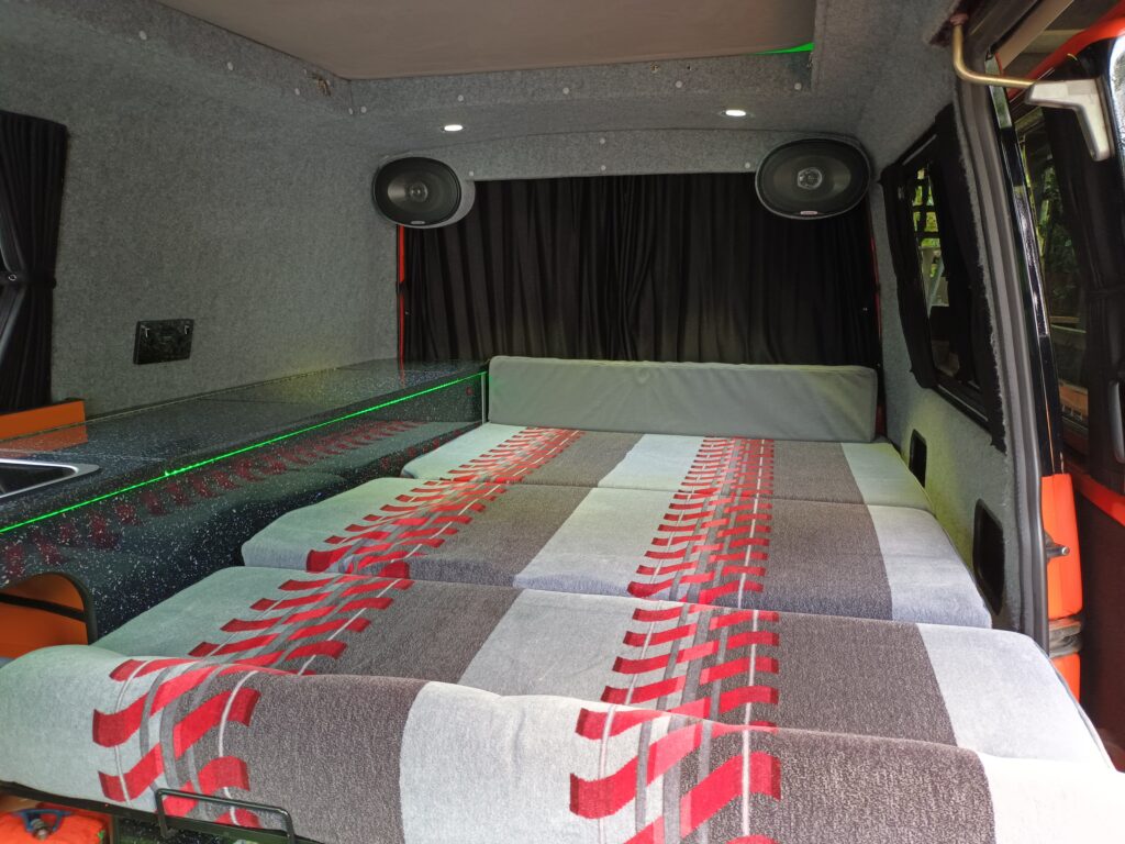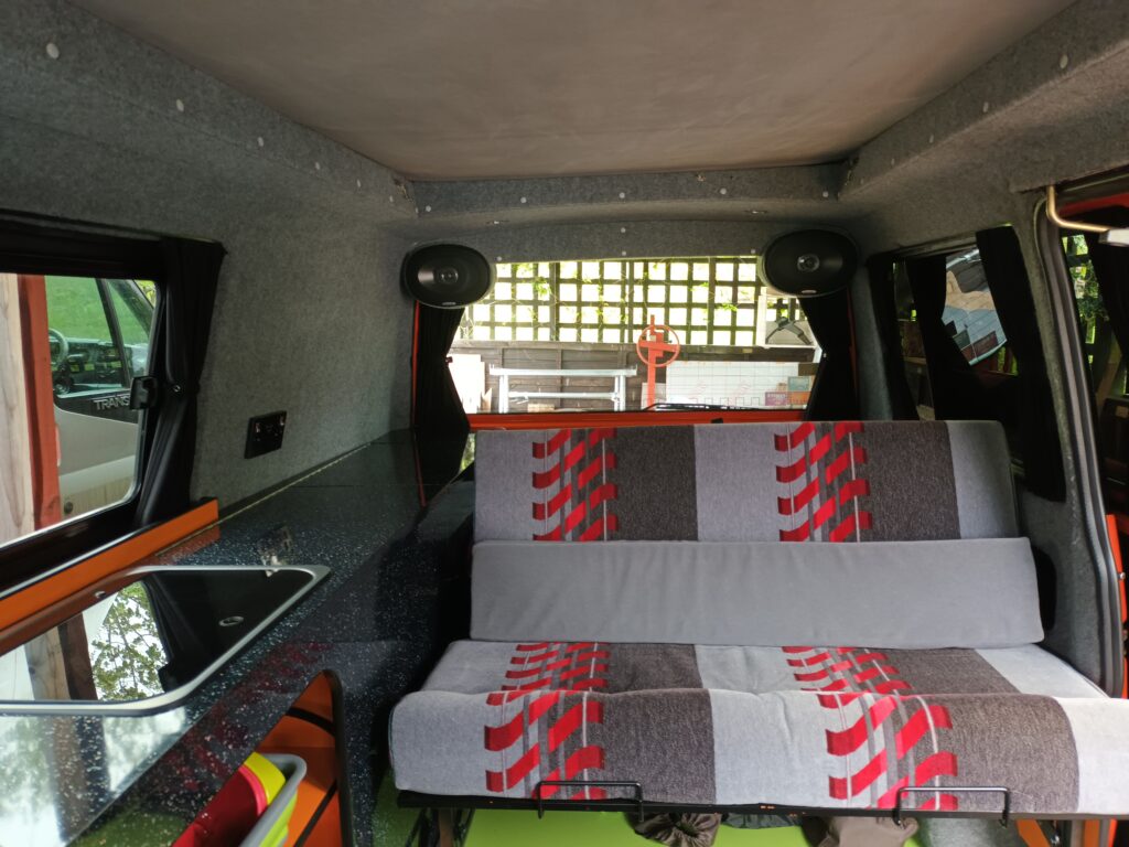 A table is neatly stored under the bed and fits in the main area between the bench seat and front seats when pivoted.