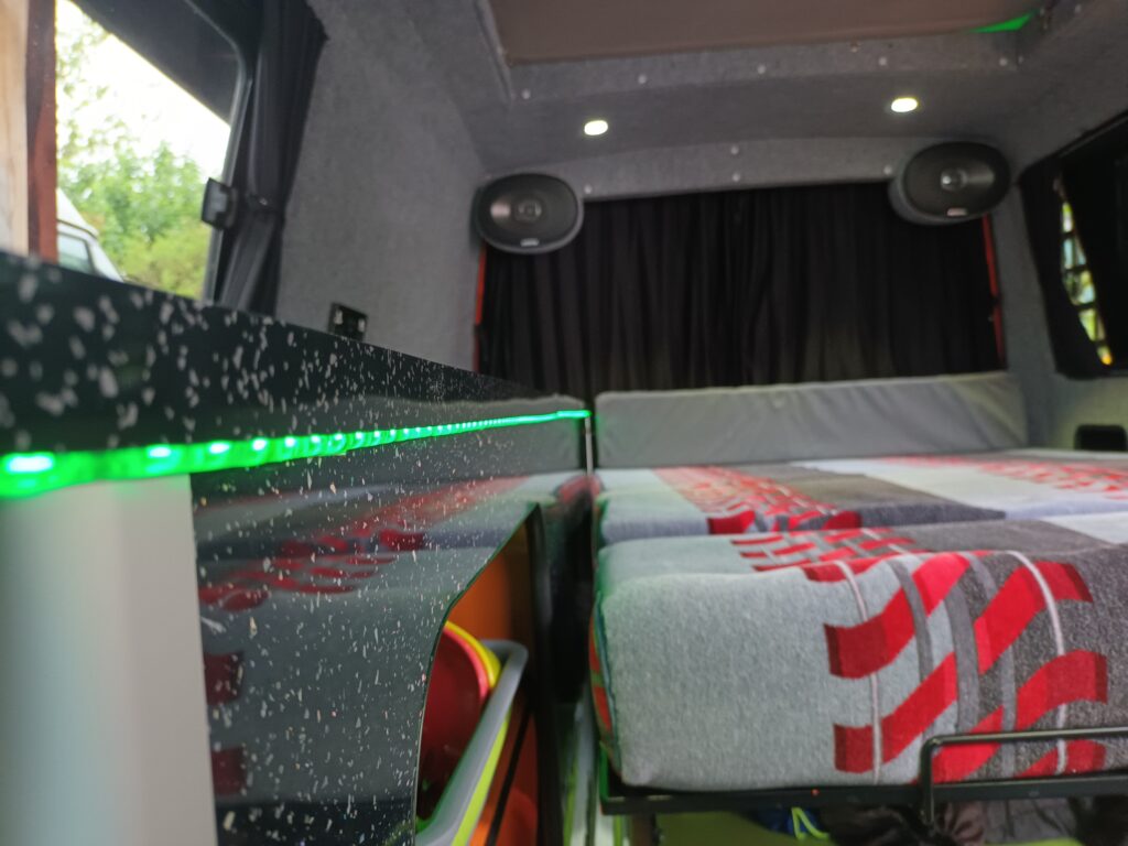The bolted in Rock n Roll bed is large enough for two adults. Storage space underneath runs the full length of the bed.