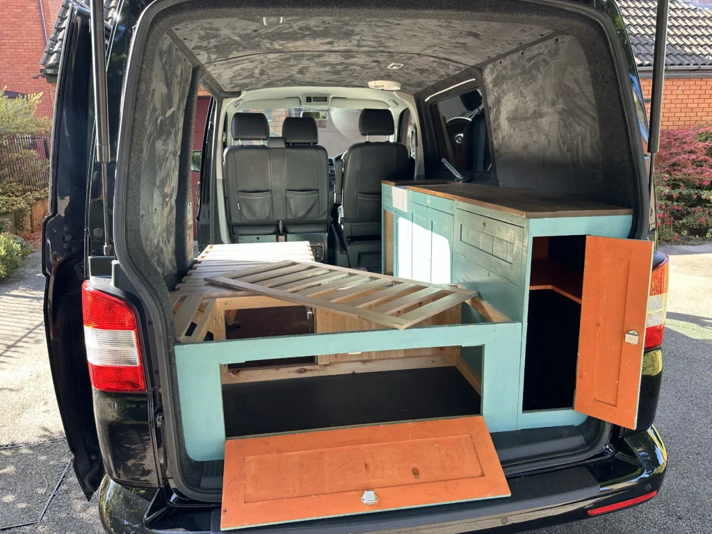 One section of the bed frame slides away to leave an L shaped bench style setup suitable for sitting inside the van and cooking/eating at the pull-out table.