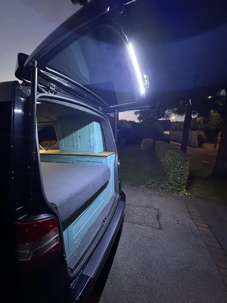 Leisure battery, solar charge controller, fuse board, and 160W Rennogy solar panel which powers: USB charging, internal LED lights, tailgate LED strip light, “Maxxfan Dome Plus” roof vent with additional LED and water pump for the tap.