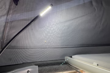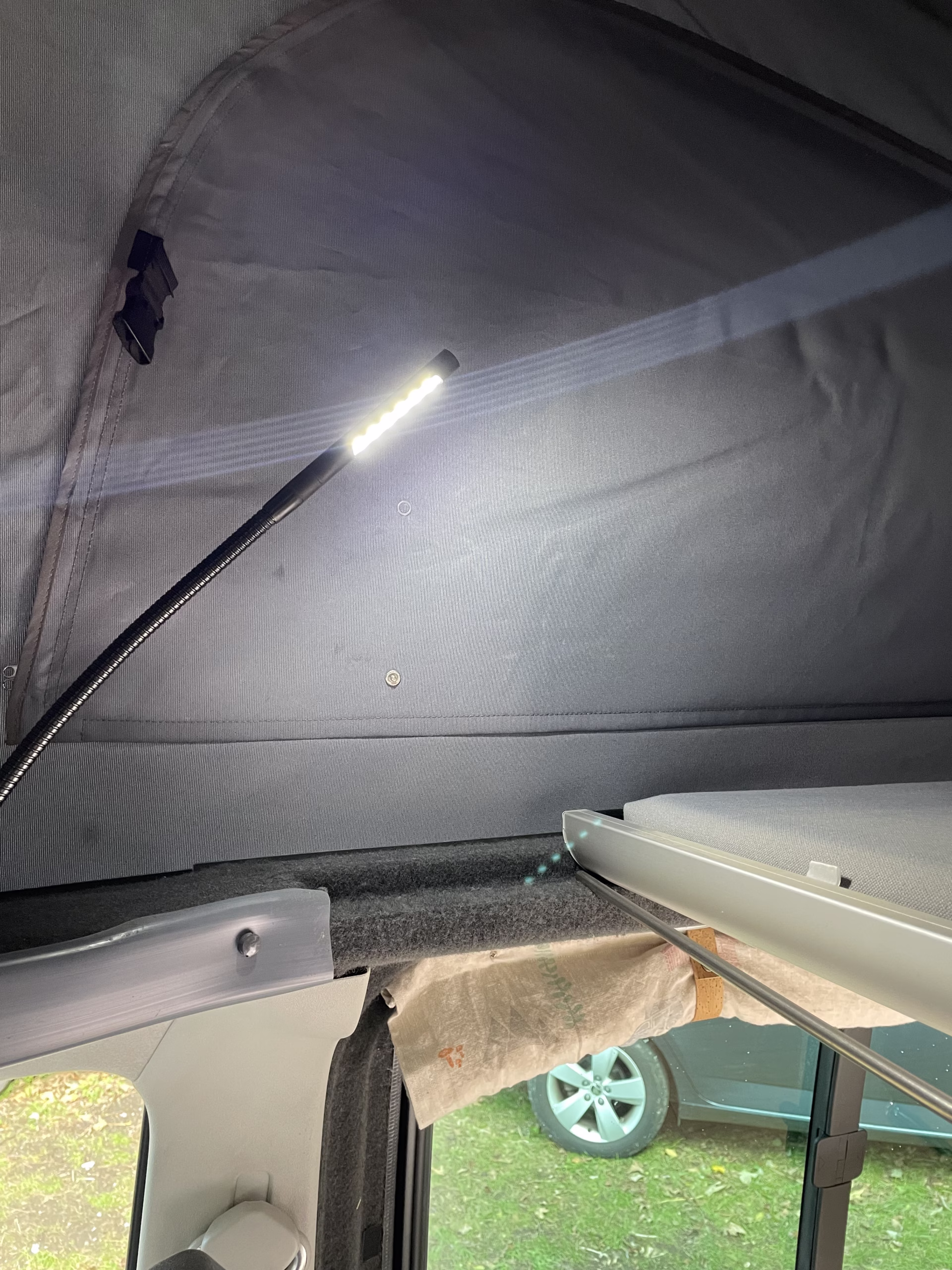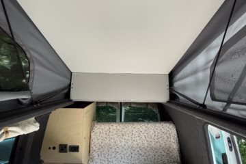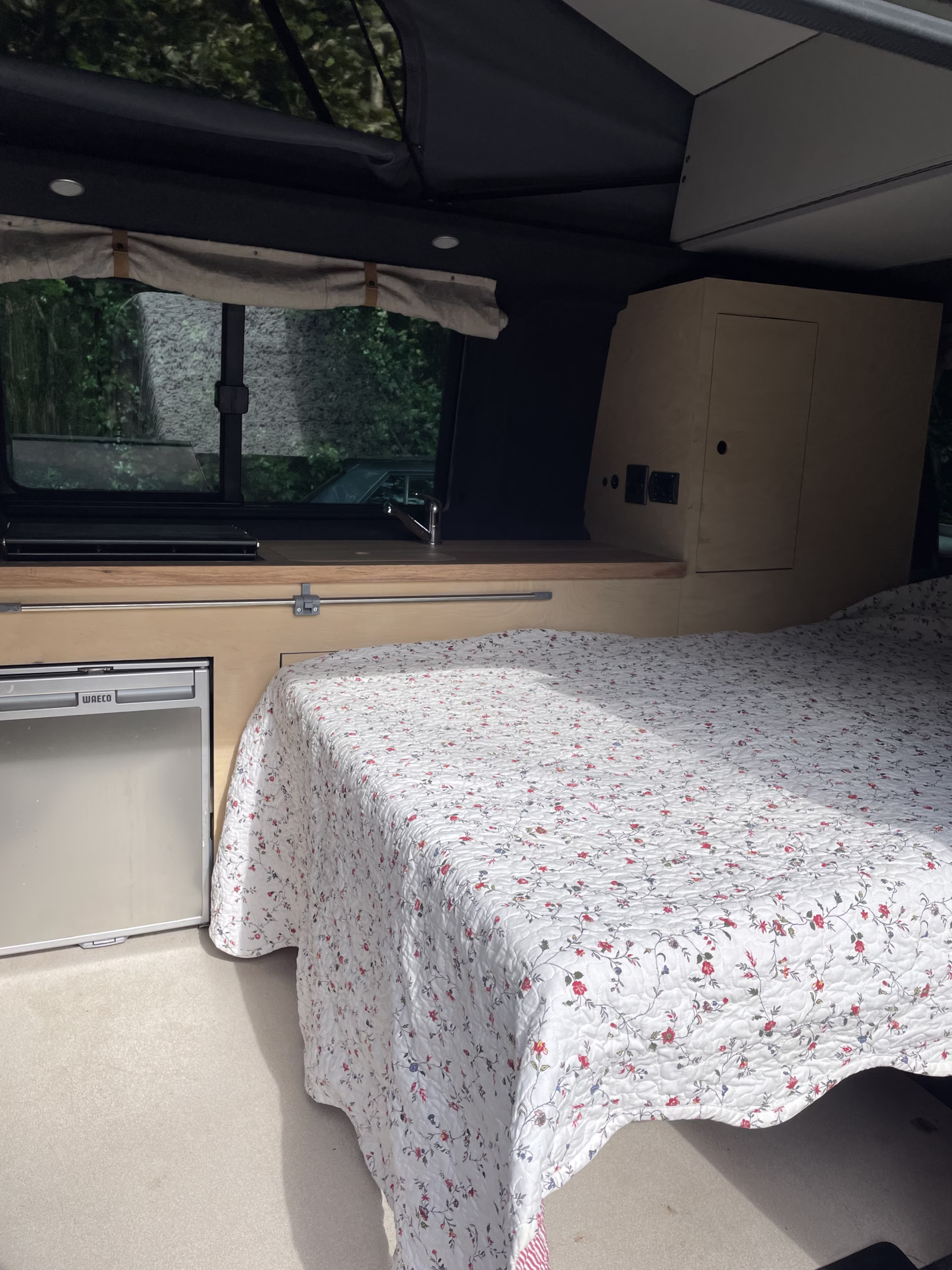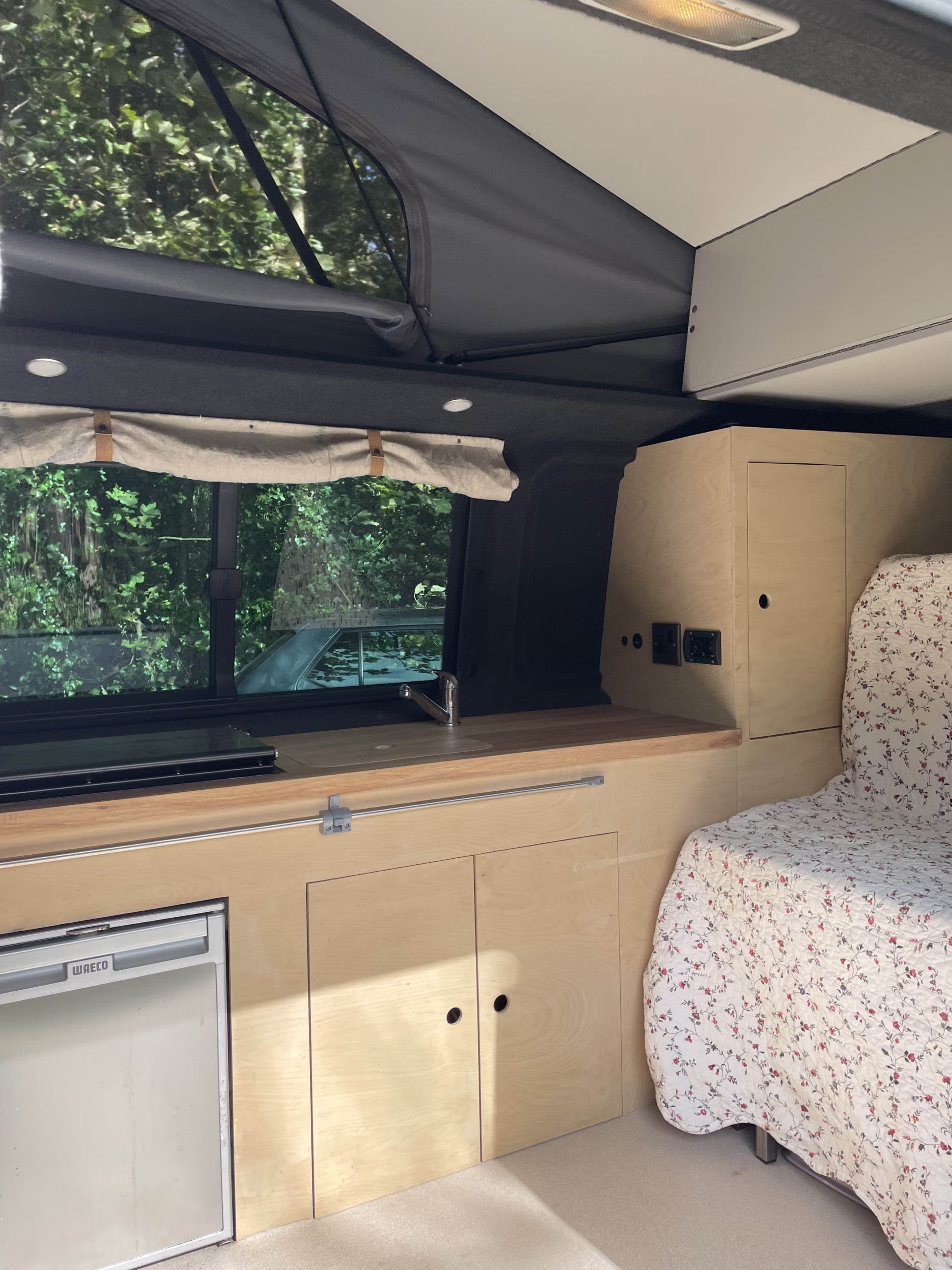 – Pop top with bifold double bed and three zip-up canvas windows for light and ventilation installed by Vanworkx