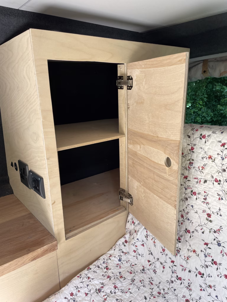 – Custom fold-out bed inside that sleeps 2 adults (note: this is not a rock & roller seat bed, so the rear is set up for living/sleeping, not extra travel seats) 190cm L x 120cm W