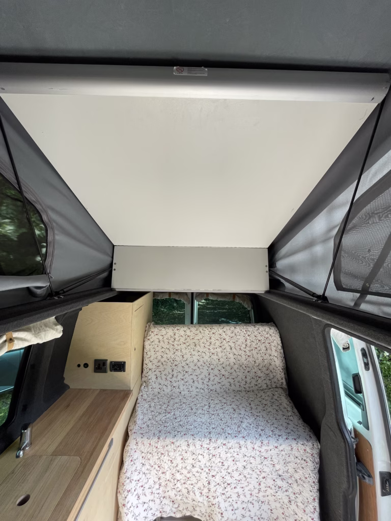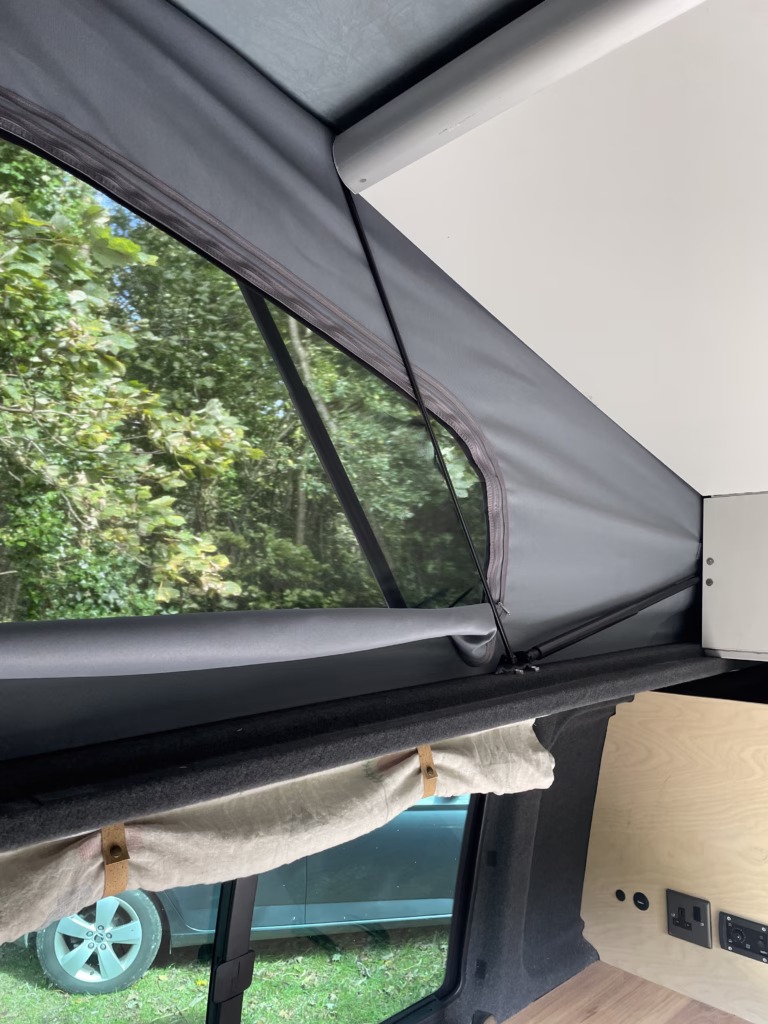 – Pop top with bifold double bed and three zip-up canvas windows for light and ventilation installed by Vanworkx