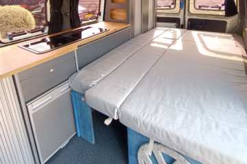Camit Design sliding double bed with IKEA LYCKSELE LÖVÅS Mattress custom tailored to custom size pieces to slide back into a bench. With the kitchen units slimline, the bed is the width of the rear of the van 112cm (same as a rock and roll bed)