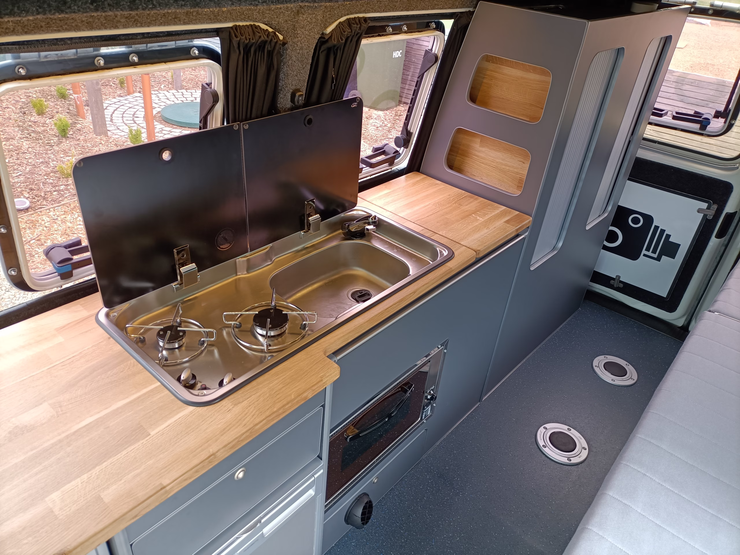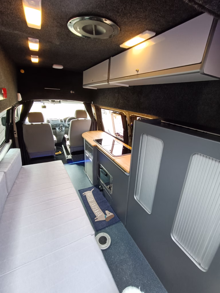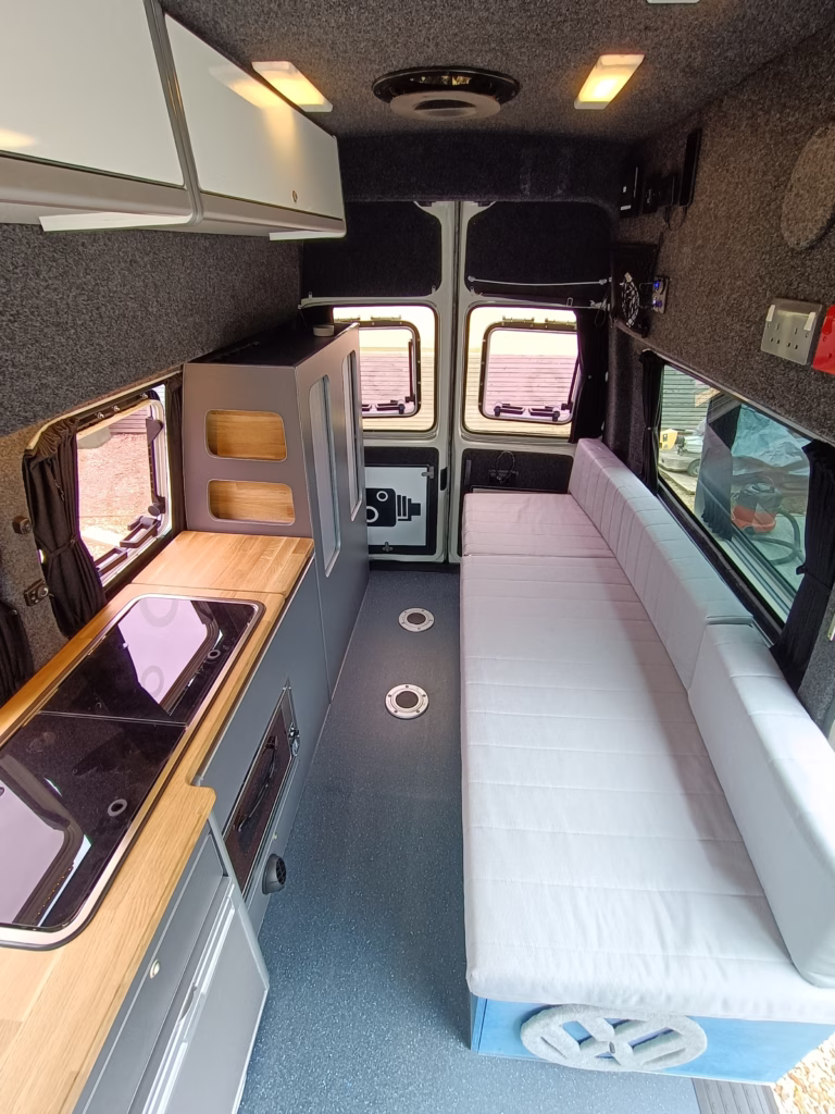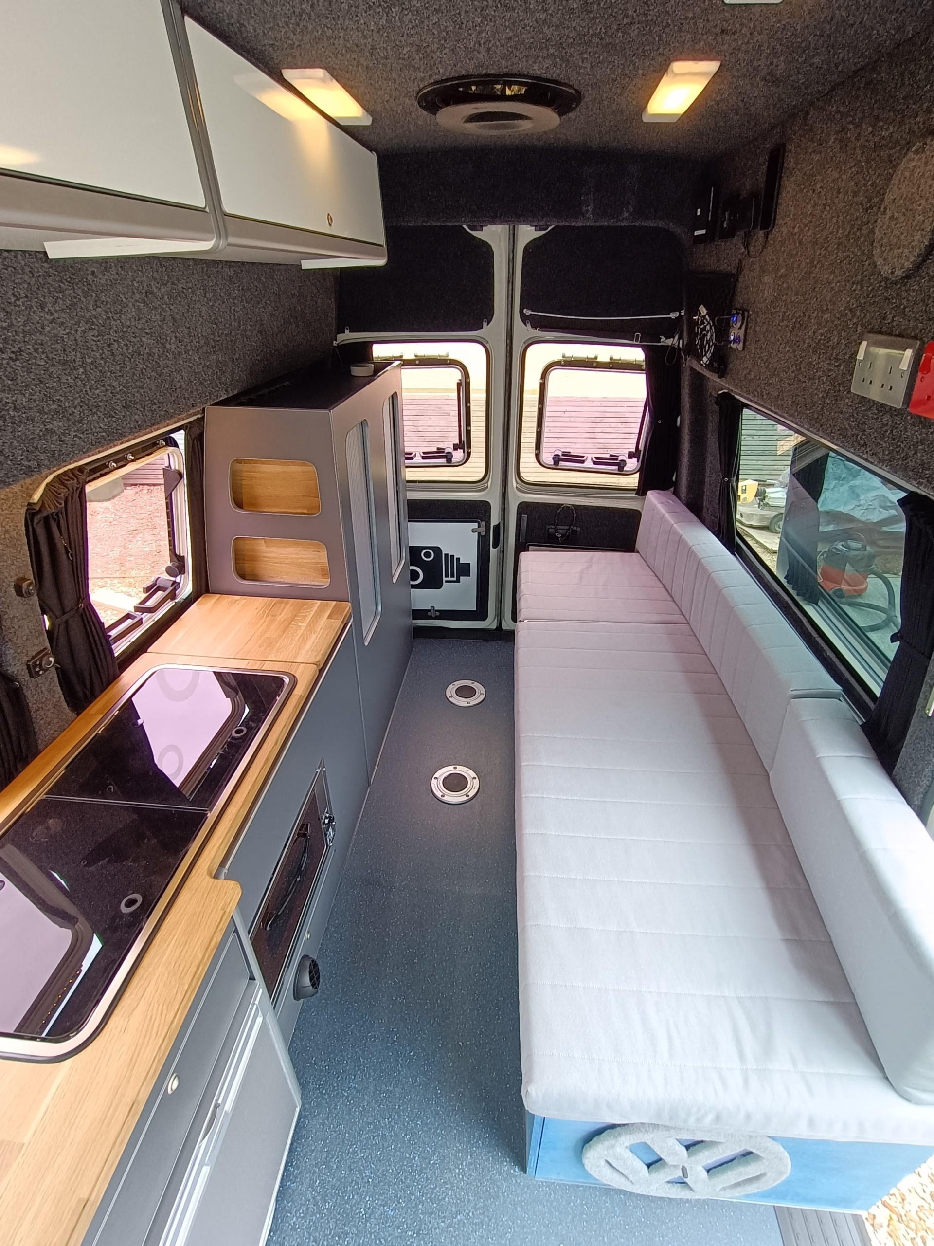 ⦁ Underslung fresh and sink waste water tanks with custom filler solution (no horrible hole in side of van for water filler)