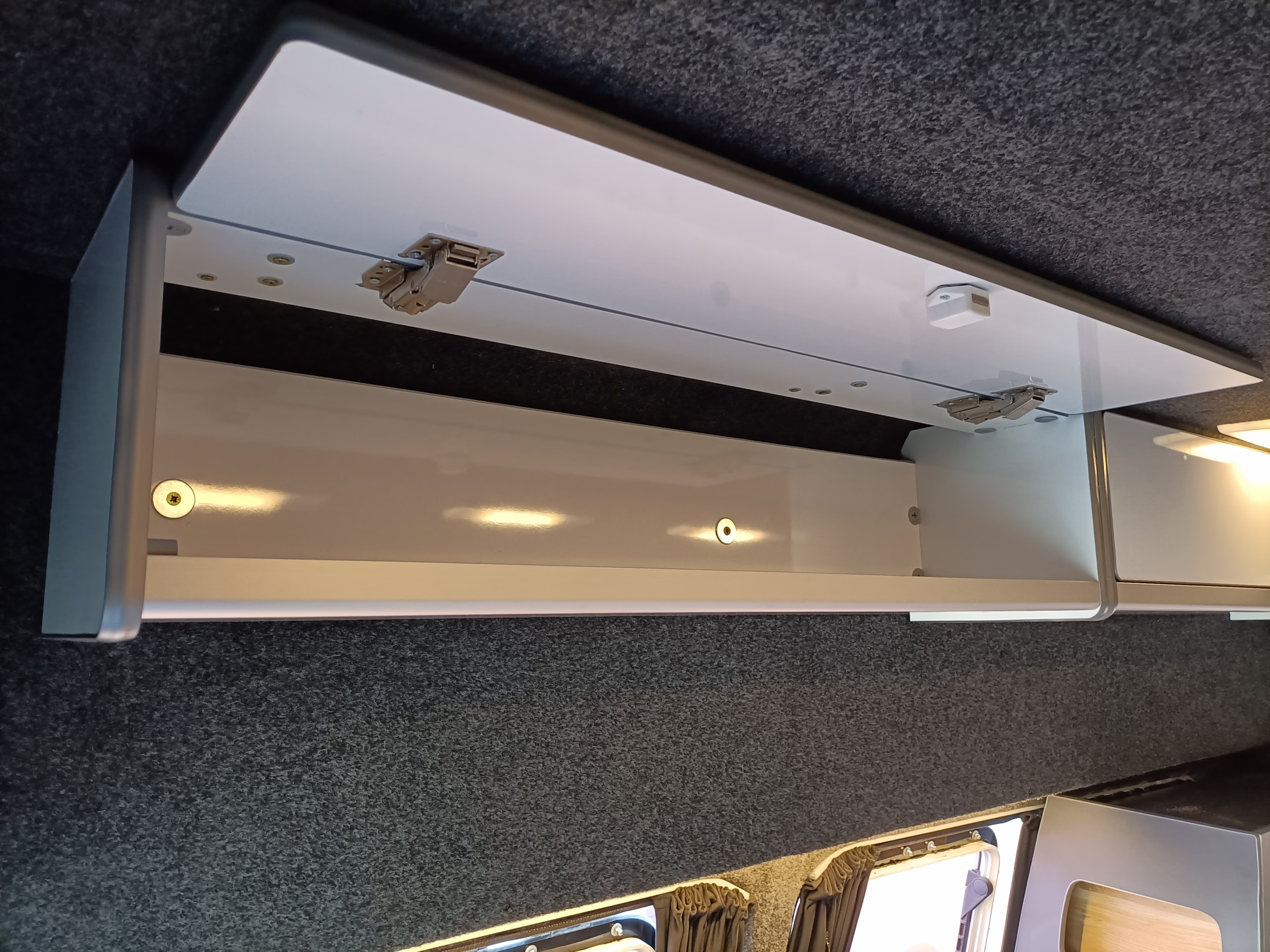 ⦁ KitlineDesign.com Mercedes Sprinter overhead lockers custom scribed to the high top roof angle.