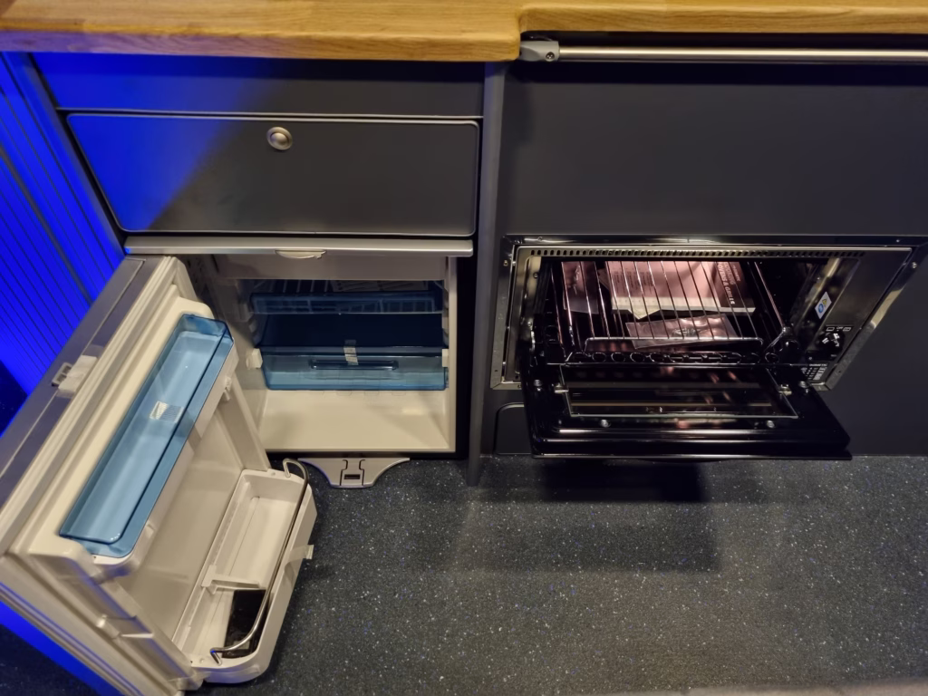 ⦁ Dometic CRX50 Fridge (fully sunk into the cabinet so it does not stick out like most!), Dometic FO211GT gas fired grill/oven, CAN FL1765 Hob/Sink Combination, custom gas install using Campingaz 907 with locker hidden in wardrobe. (Gas pipework completed by a professional marine engineer)