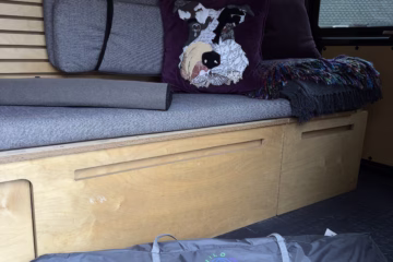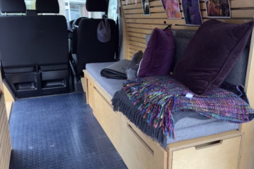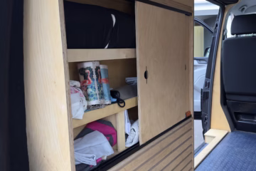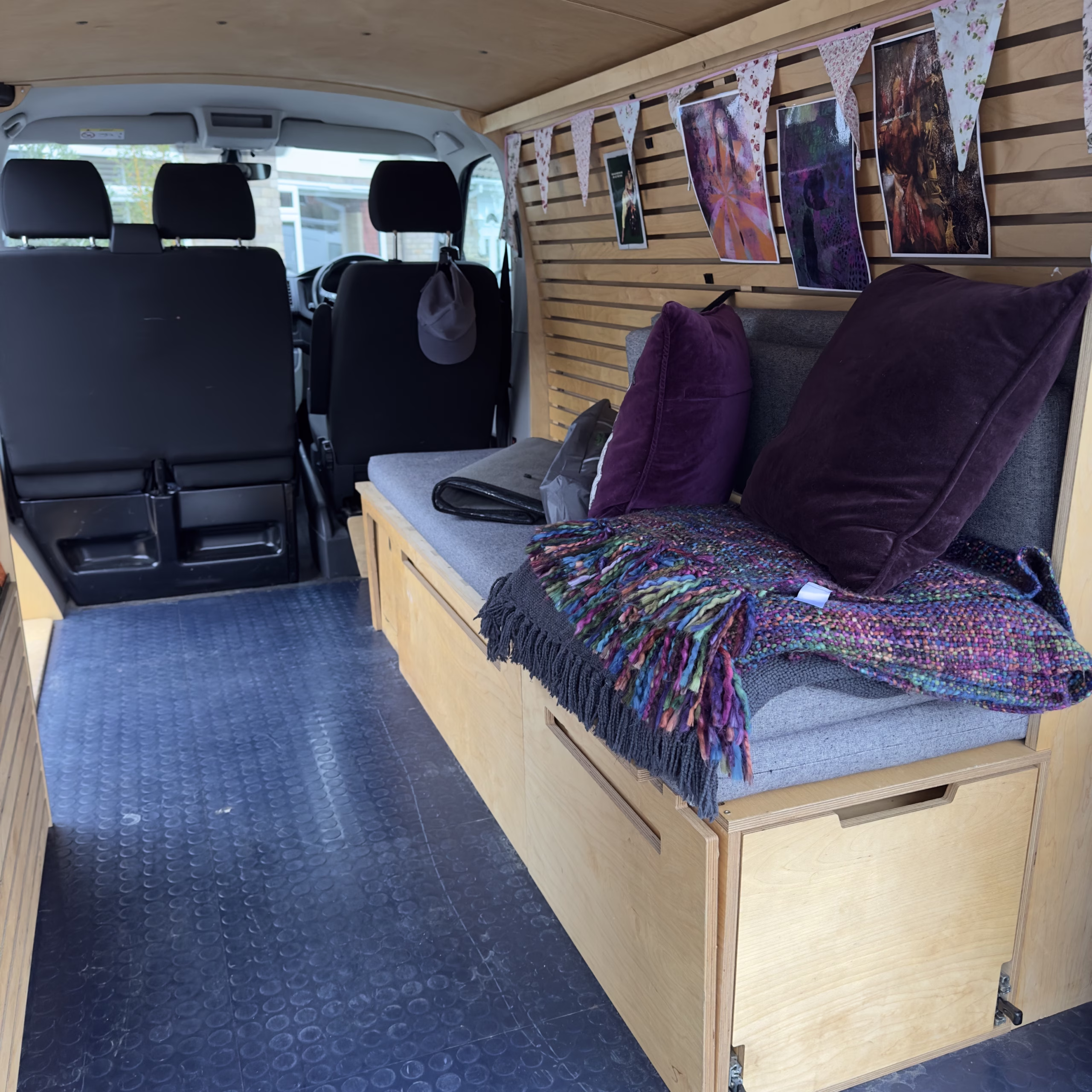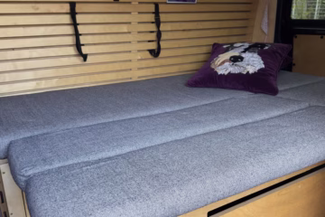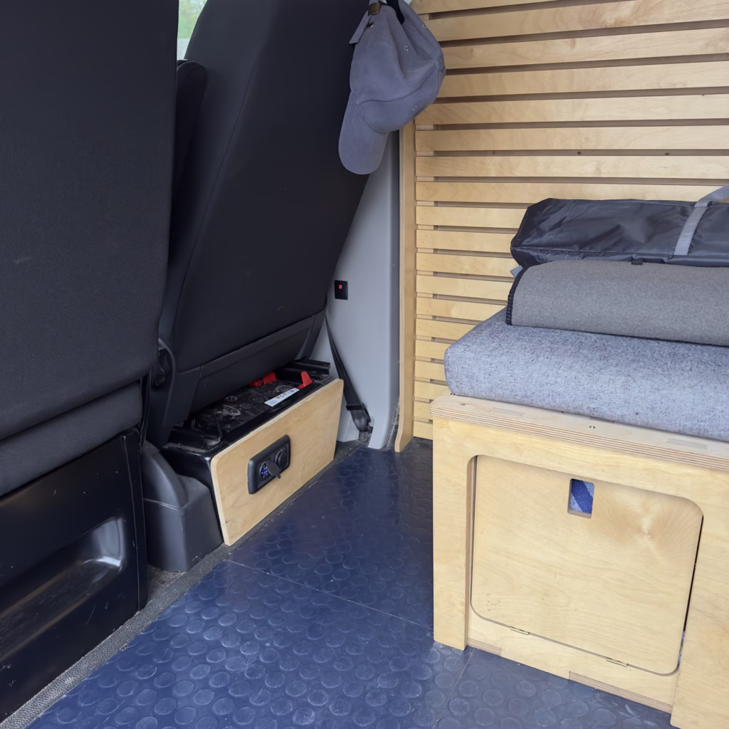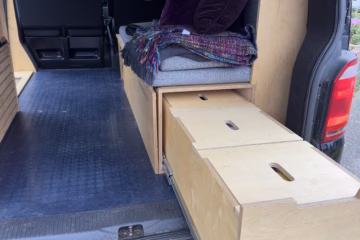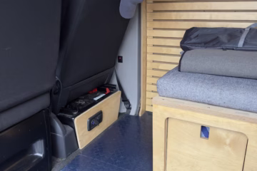 Voyager standard leisure battery fitted July 23. The interior was converted by a carpenter during lockdown. Pale wood side cupboard with sliding doors. Matching bed base which is beautifully made and pulls out to offer a small double bed with foam pads – I added a Panda mattress topper to make a super comfy nights camping. Under the bed base there is a roll out drawer system housing 4 spacious box style compartments – offering plenty of storage space. At the driver end of the bed base is an opening compartment to store easy to get to requirements. The was is matching panelling. The interior is finished off with contrasting blue vinyl flooring.