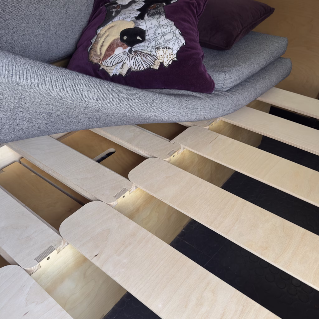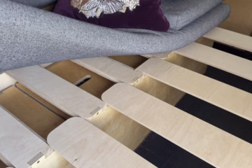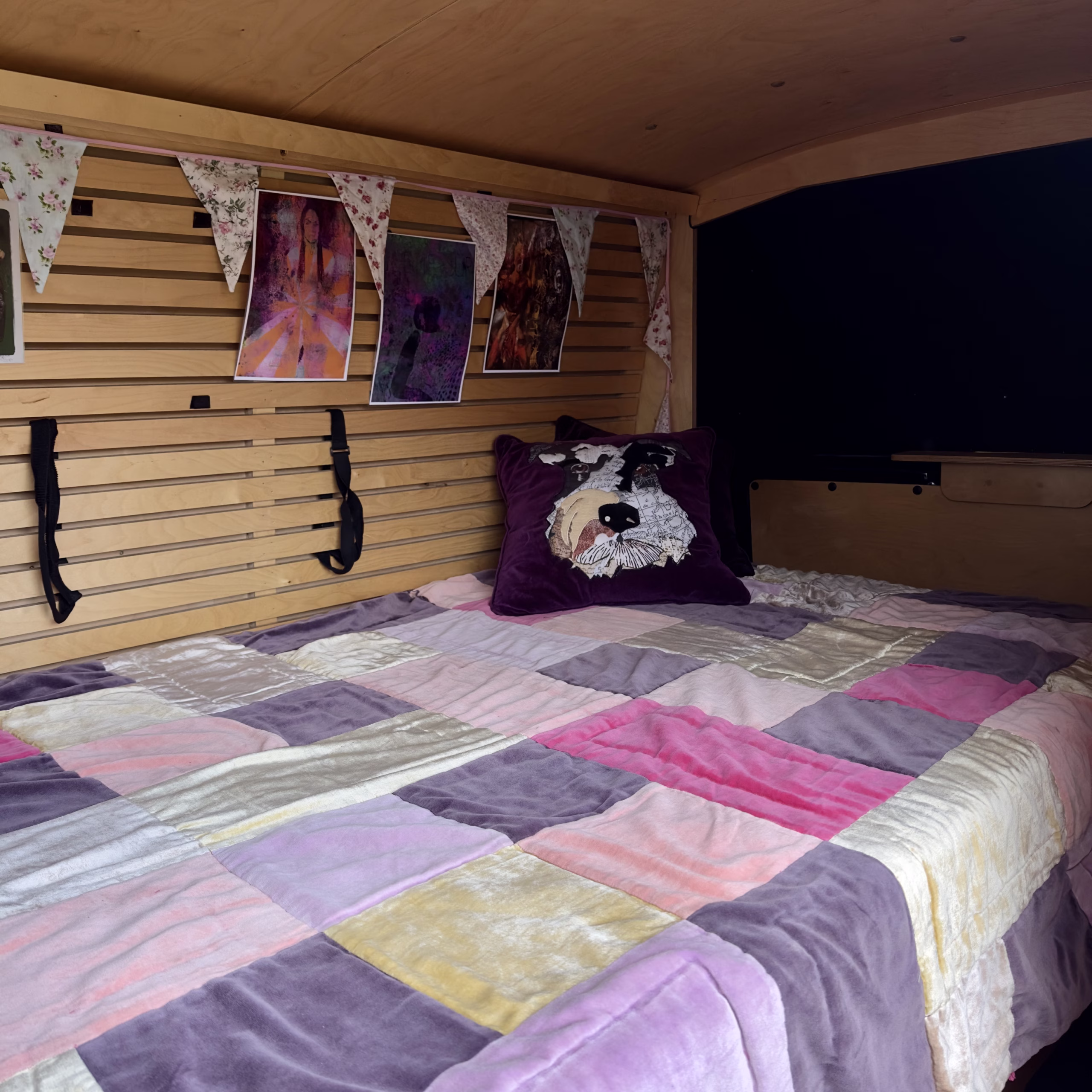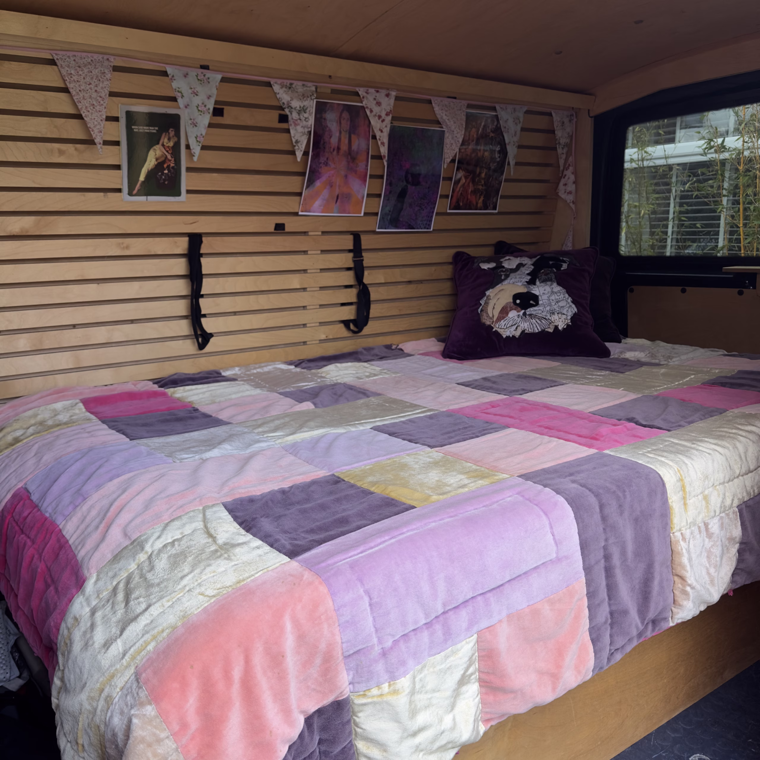 Voyager standard leisure battery fitted July 23. The interior was converted by a carpenter during lockdown. Pale wood side cupboard with sliding doors. Matching bed base which is beautifully made and pulls out to offer a small double bed with foam pads – I added a Panda mattress topper to make a super comfy nights camping. Under the bed base there is a roll out drawer system housing 4 spacious box style compartments – offering plenty of storage space. At the driver end of the bed base is an opening compartment to store easy to get to requirements. The was is matching panelling. The interior is finished off with contrasting blue vinyl flooring.