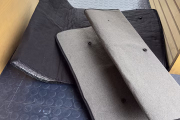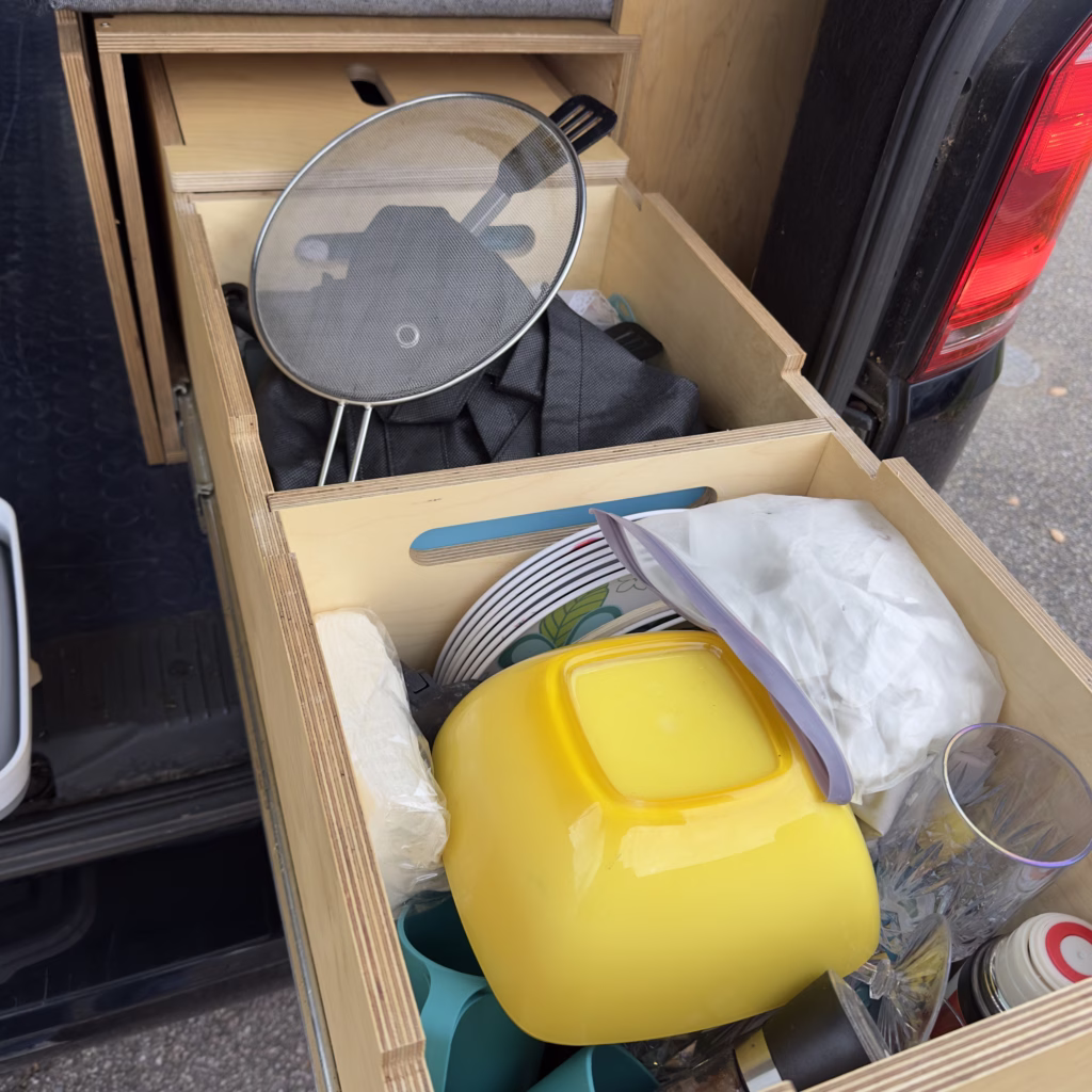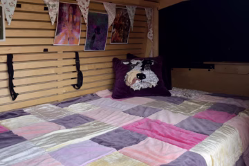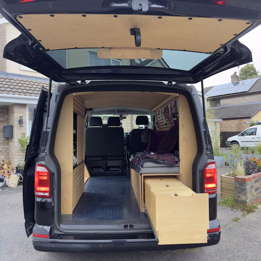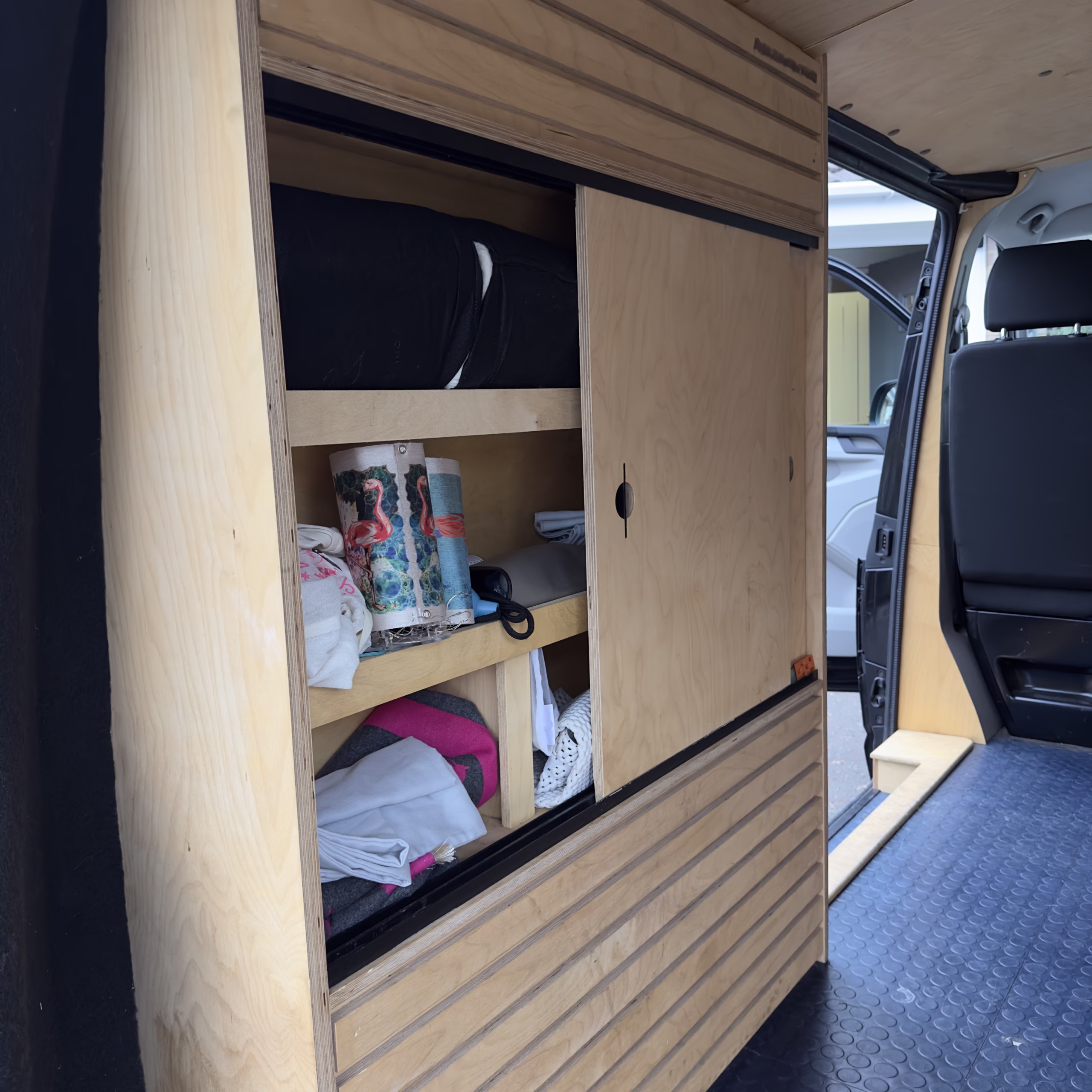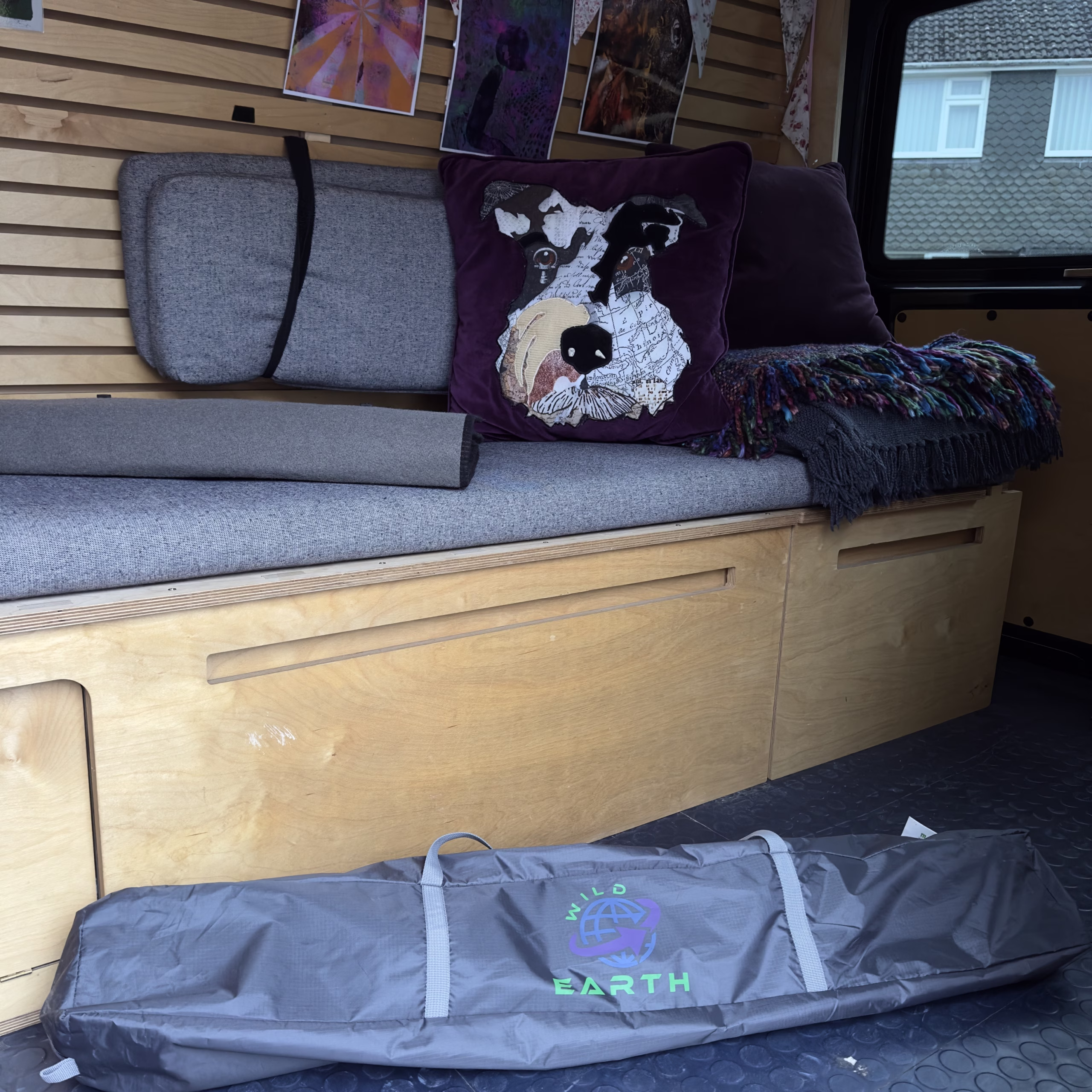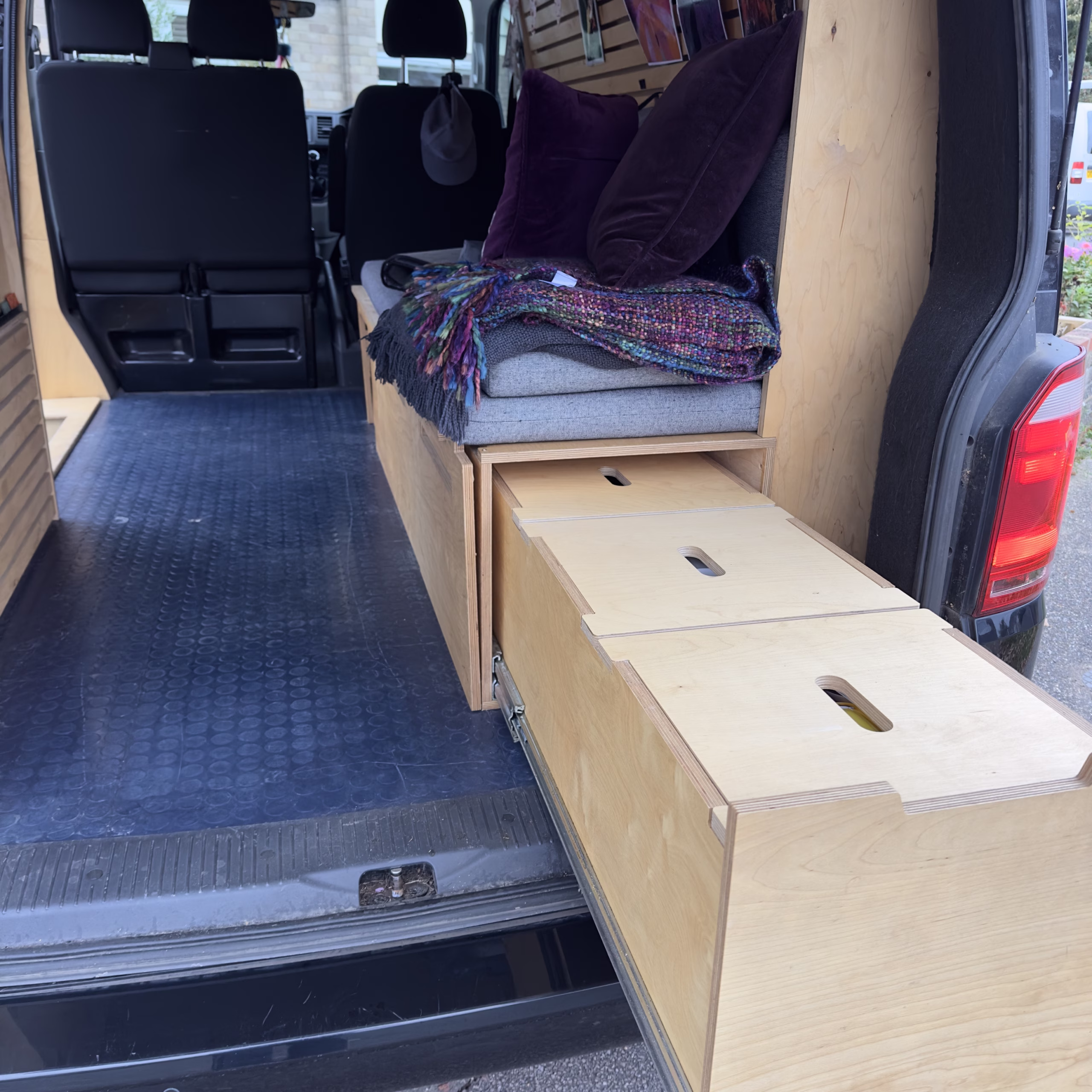 Voyager standard leisure battery fitted July 23 and has not been used that much, also included Halfords 200W Power Inverter with one electric plug socket and 2 x Type C usb ports and mains hook up with a long cable. Jackery solar panel kit available by separate negotiation if required. The interior was fully insulated and converted by a qualified carpenter during lockdown. Pale wood side cupboard with sliding doors. Matching bed base which is beautifully made and pulls out to offer a double bed with foam pads – I have added a Panda mattress topper to make a super comfy nights camping. Under the bed base there is a roll out drawer system / kitchen unit housing 4 spacious box style compartments – offering plenty of storage space for all your cooking kit. At the driver end of the bed base is an opening compartment for storage of items that need easy access. The wall is matching panelling. The interior is finished off with contrasting blue vinyl flooring. Great storage area under the bed when it is pulled out/made up.