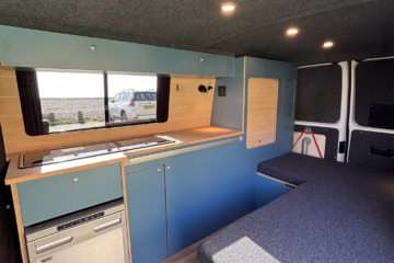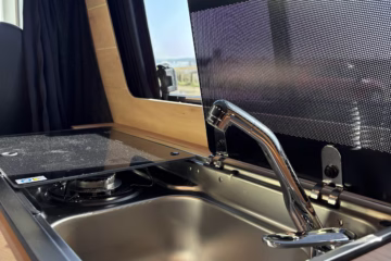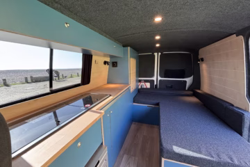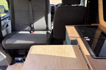 Fully insulated and sound deadened with blackout curtains on both windows and one across the cab to help you get a good nights sleep. The front seats swivel to make the living space more roomy