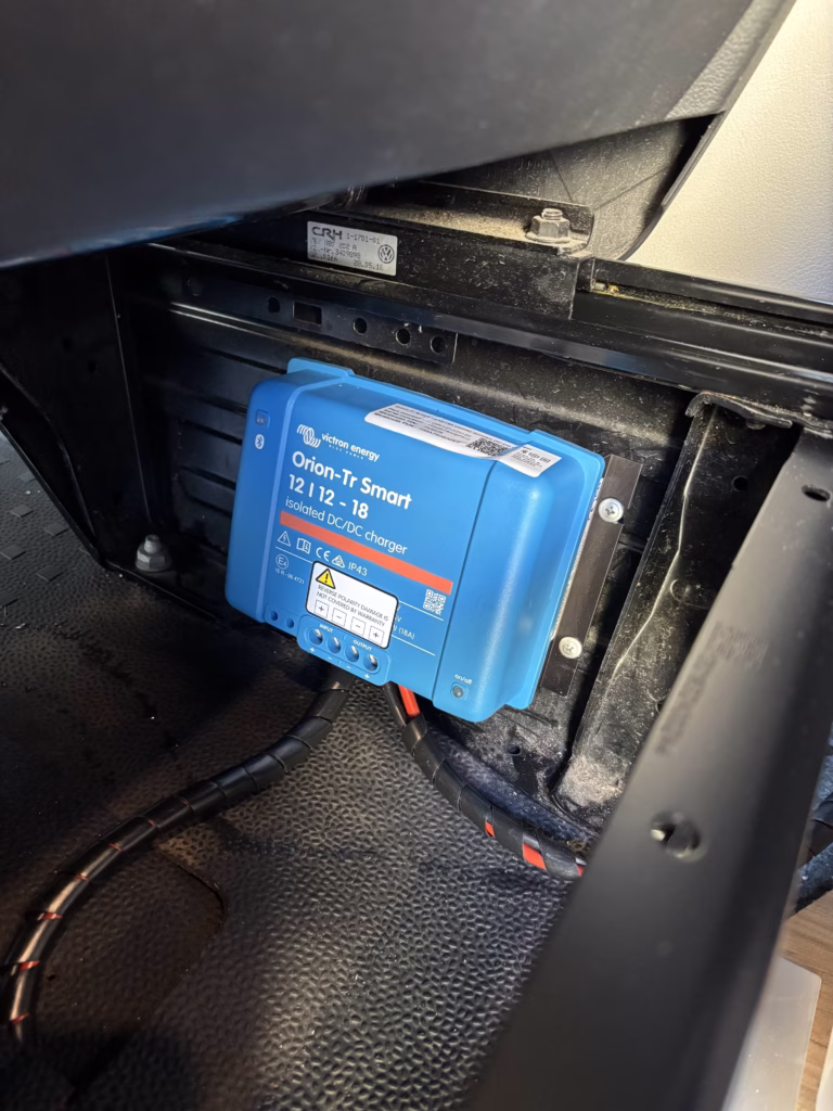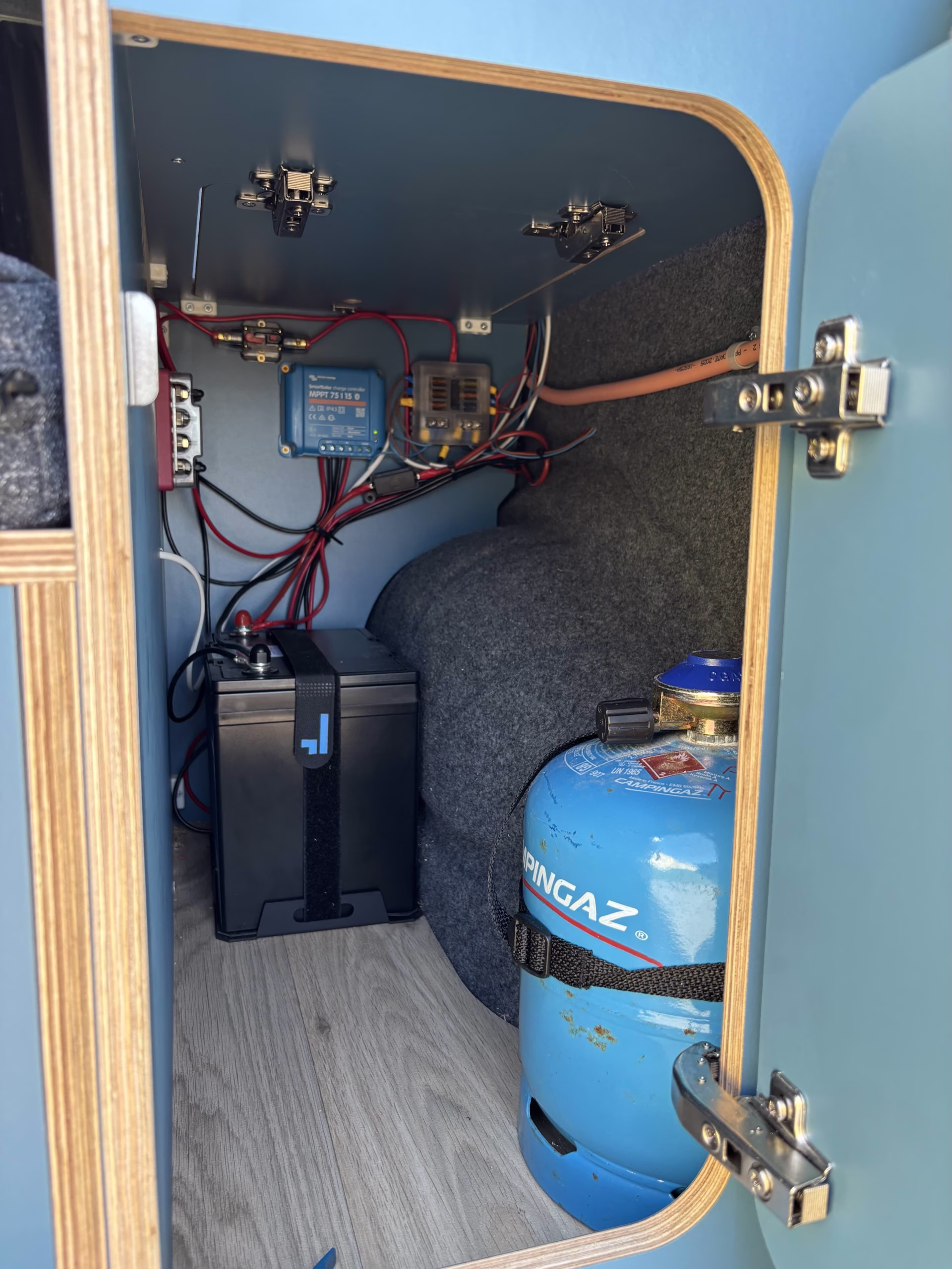 Equipped with a high quality 100 Ah lithium battery by FogStar with built in BMS and bluetooth. Charging the battery is a 210W Flexible Solar panel paired with a Victron 15amp MPPT controller with bluetooth PLUS an 18amp Victron DC-DC charger (charges the battery whilst driving). This has you totally covered for off grid camping, the lithium battery charges quickly and will run everything easily.