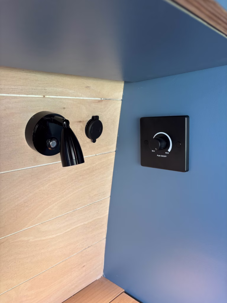 There are 4 dimmable warm white ceiling lights and 2 dimmable warm white reading lights with built-in USB sockets