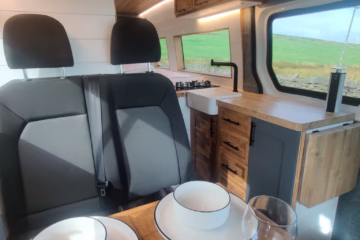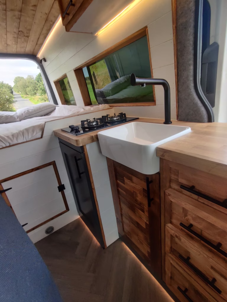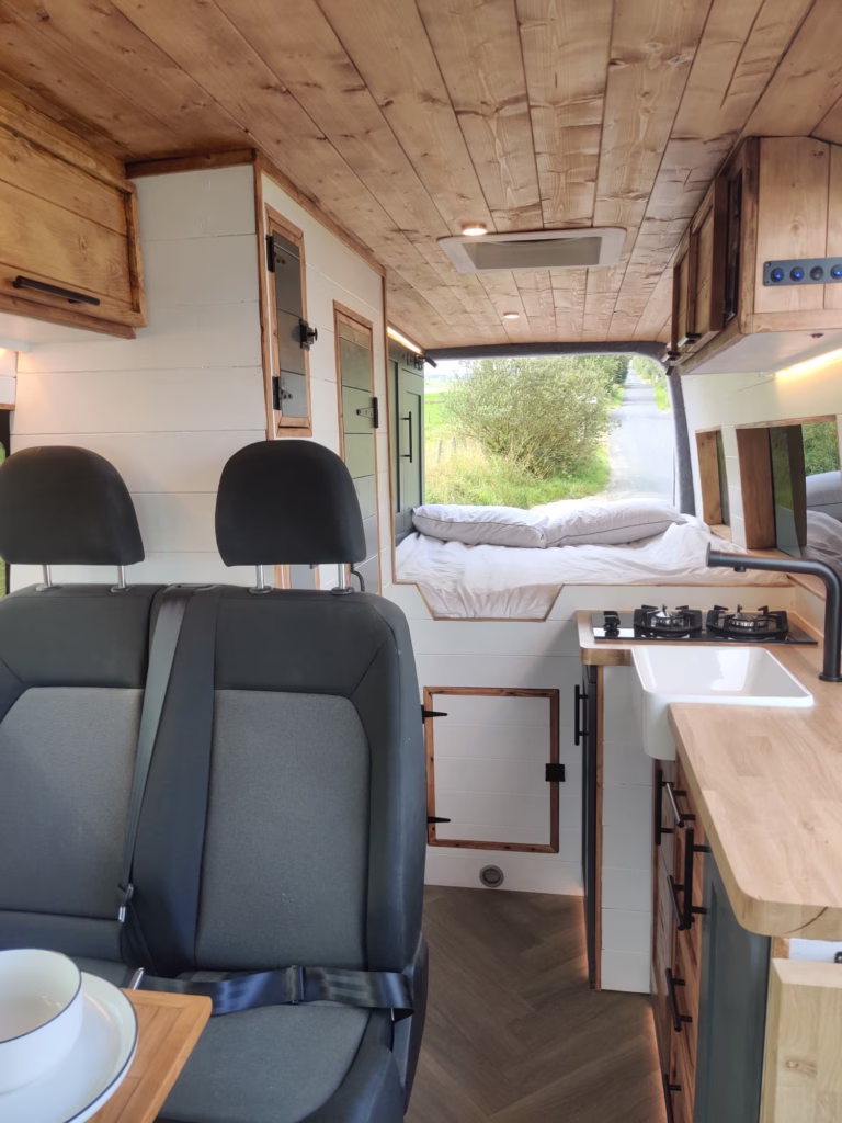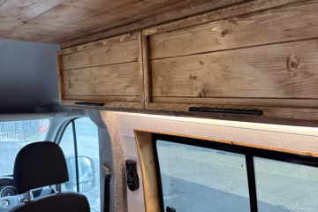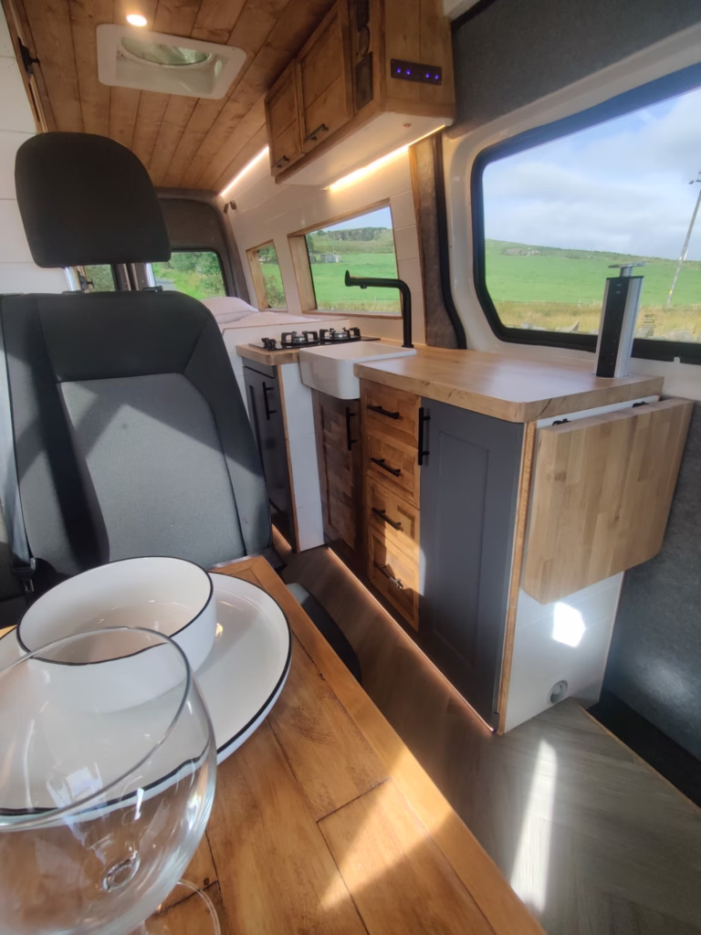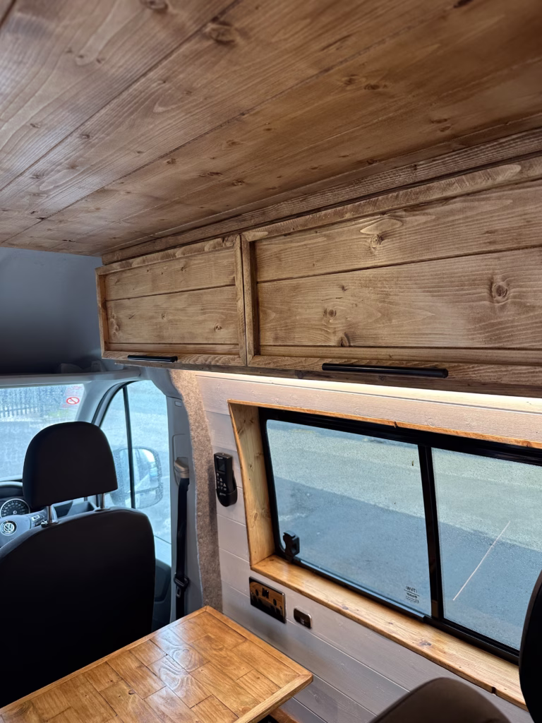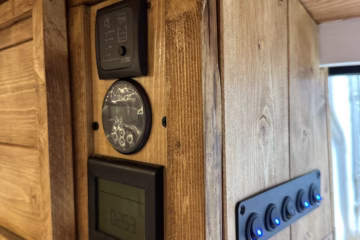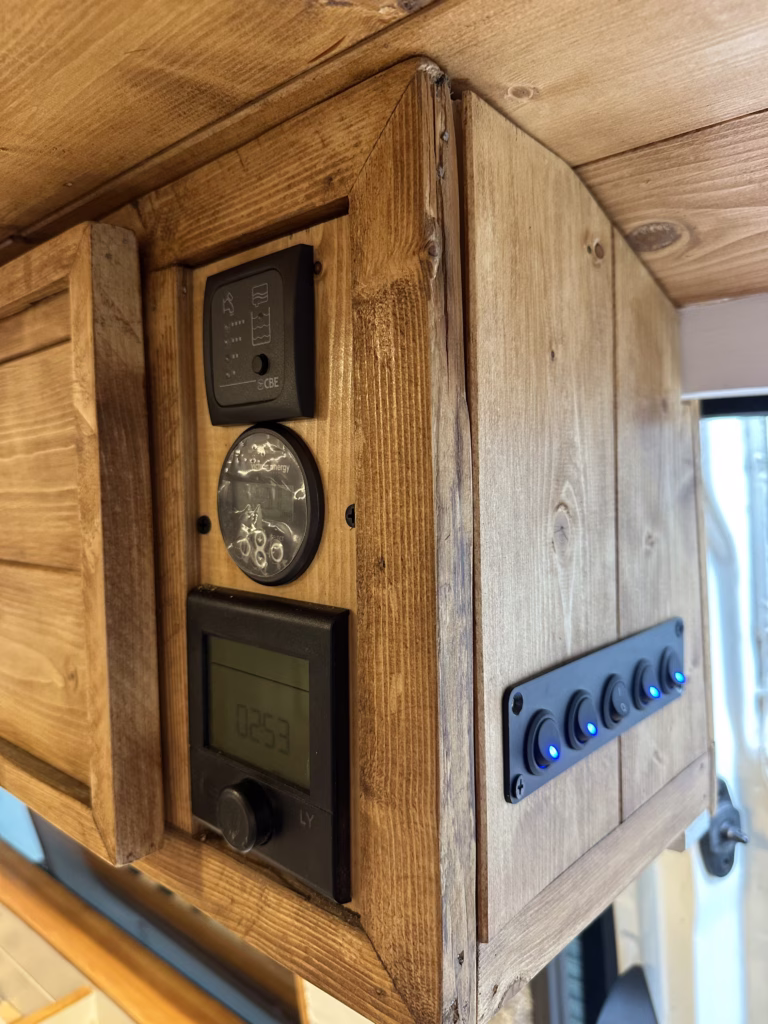 The the wooden panelling and upholstered sofa cushions make this van feel really cosy. It’s built with off grid in mind with a huge 300ah Lithium battery, large solar panels, Victron electrical system and Renogy inverter, all professionally installed, configured and tested. Light weight!.