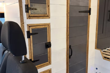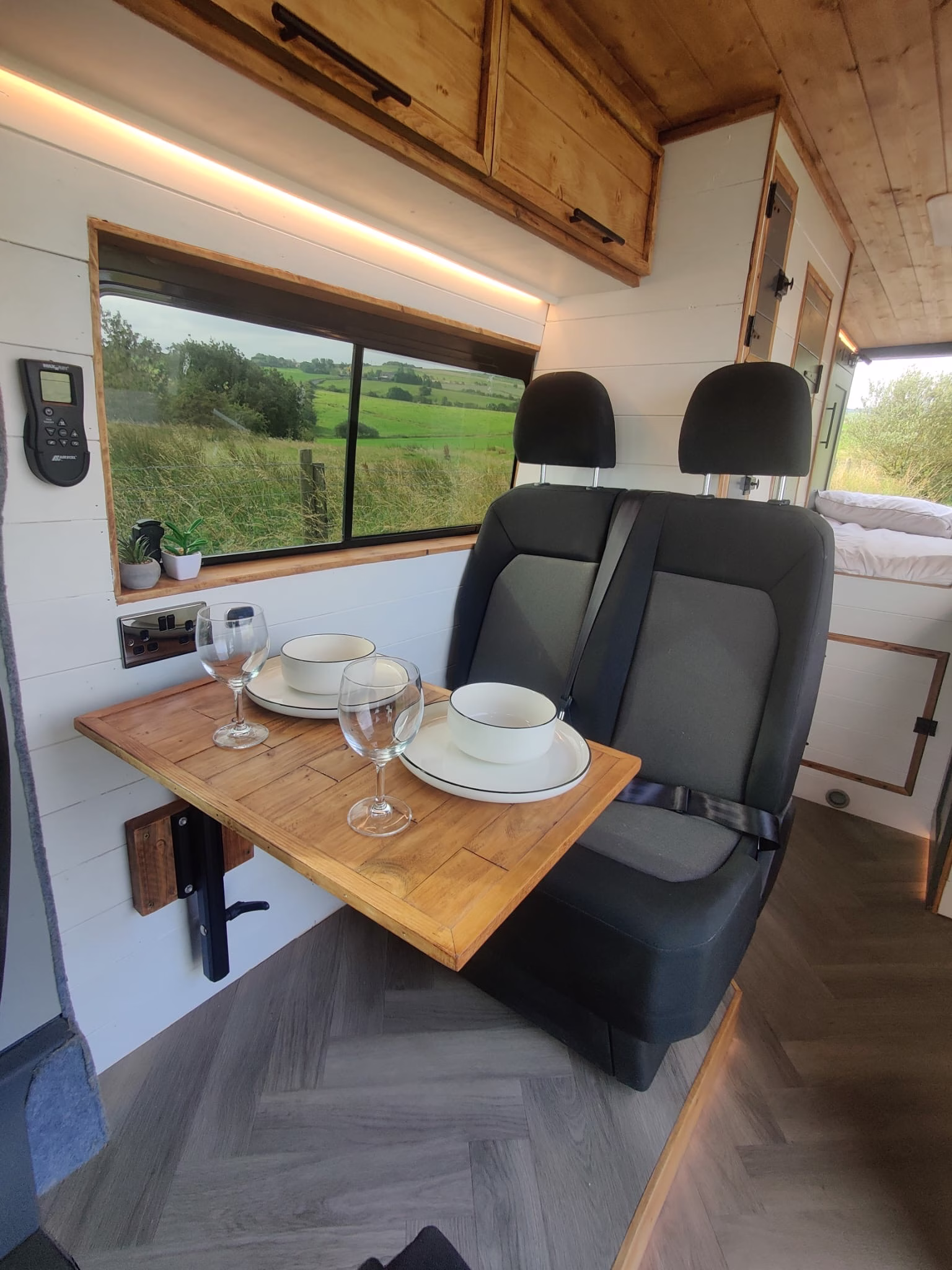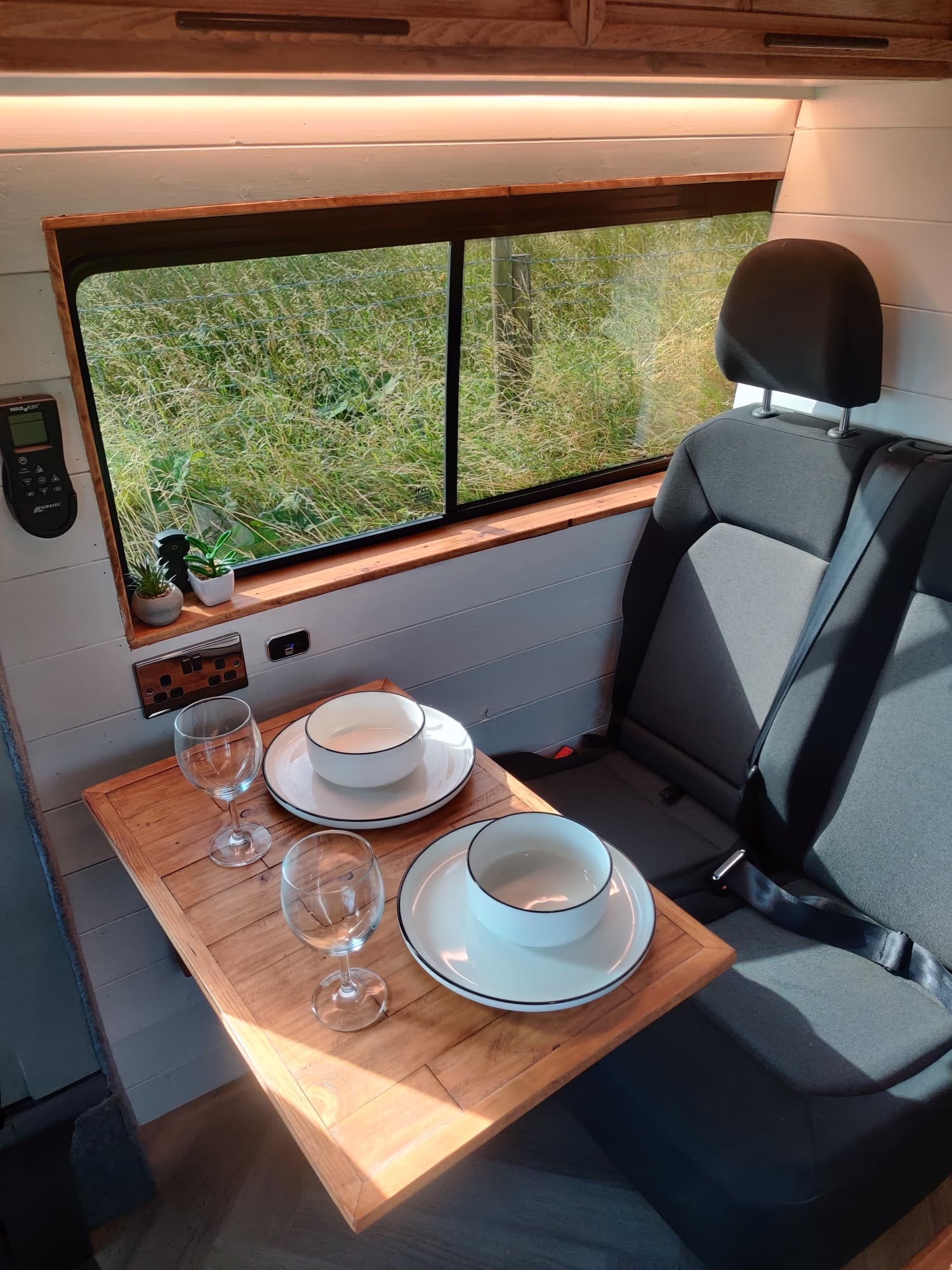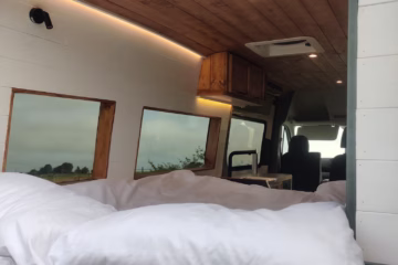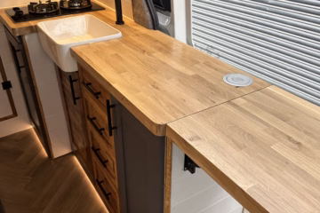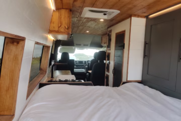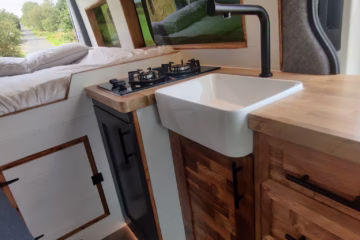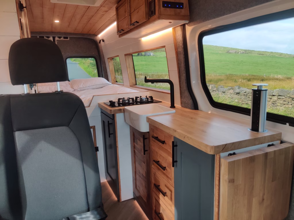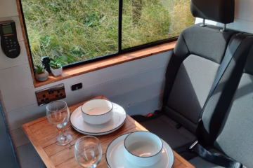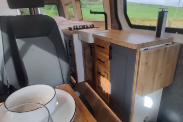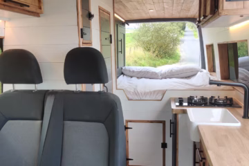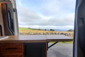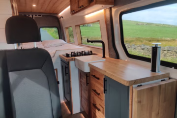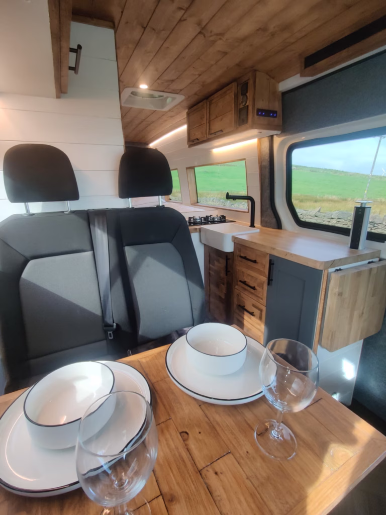 The the wooden panelling and upholstered sofa cushions make this van feel really cosy. It’s built with off grid in mind with a huge 300ah Lithium battery, large solar panels, Victron electrical system and Renogy inverter, all professionally installed, configured and tested. Light weight!.