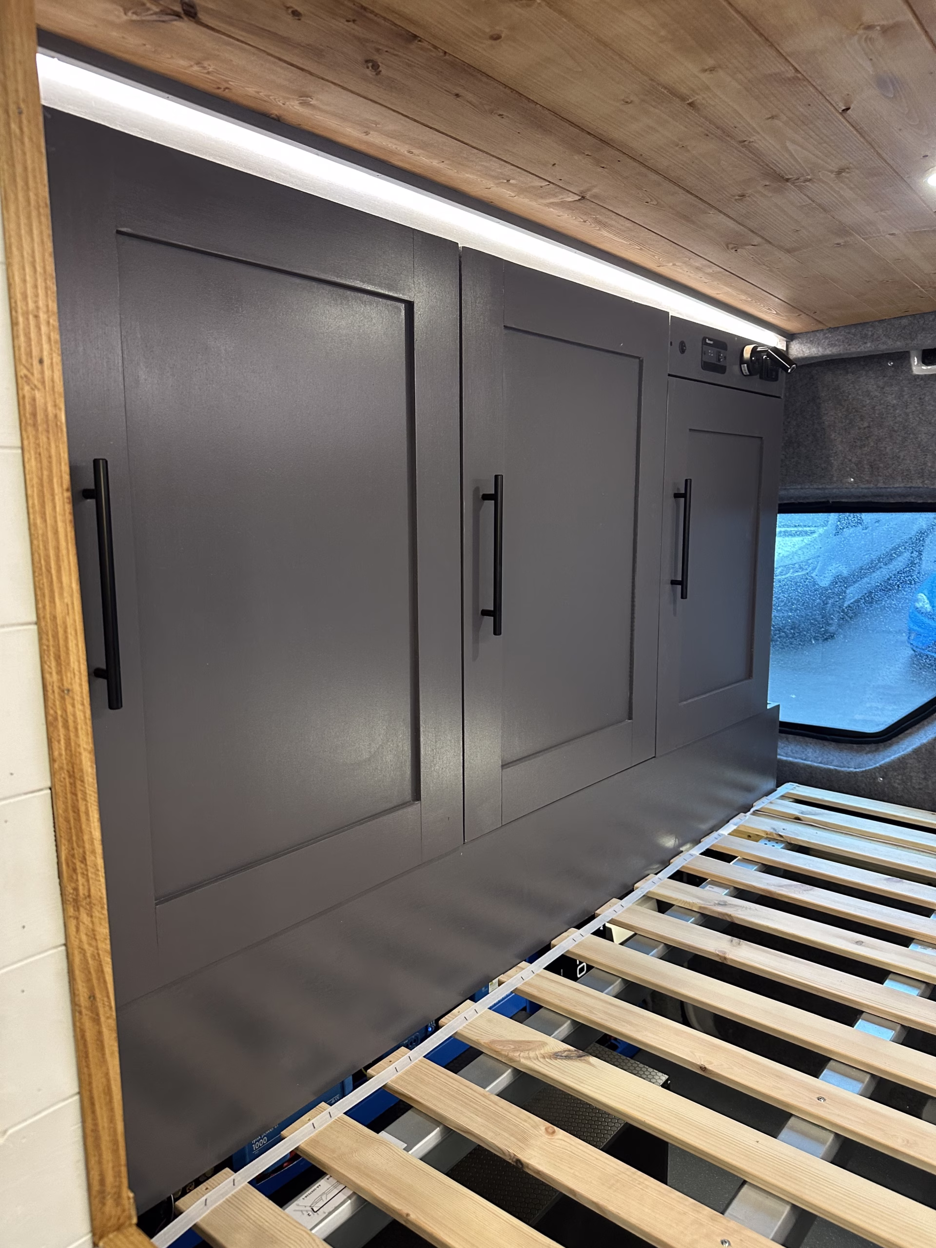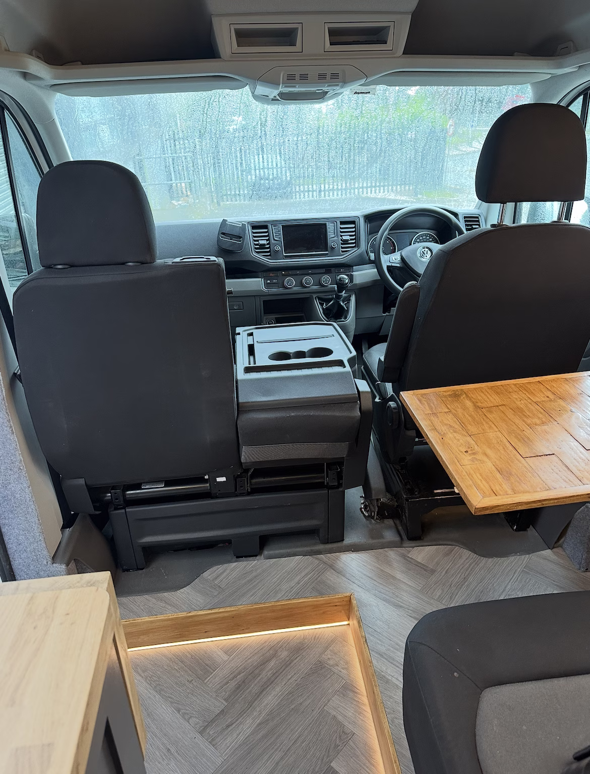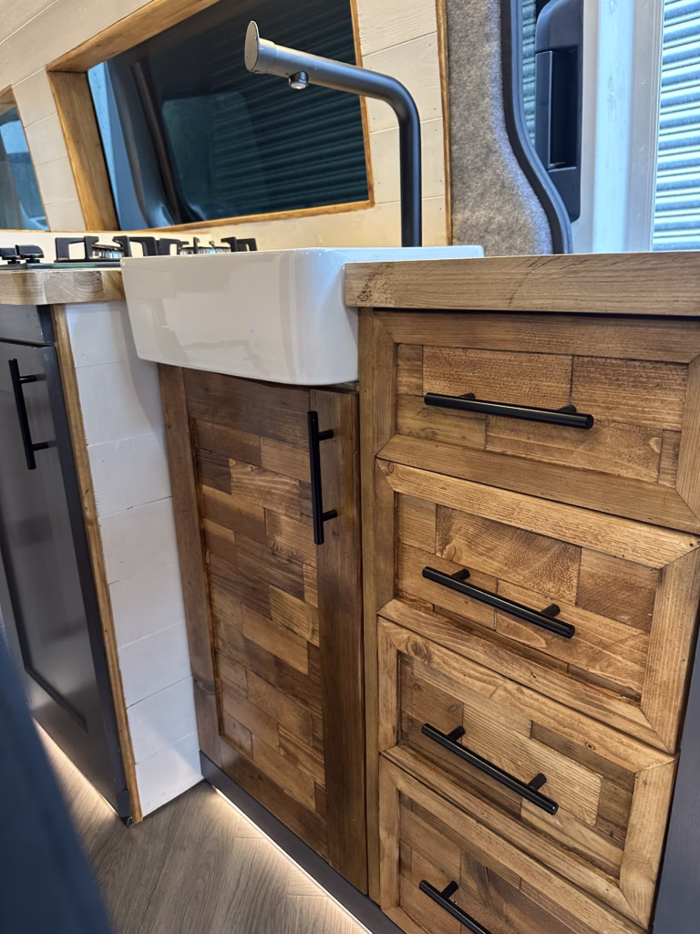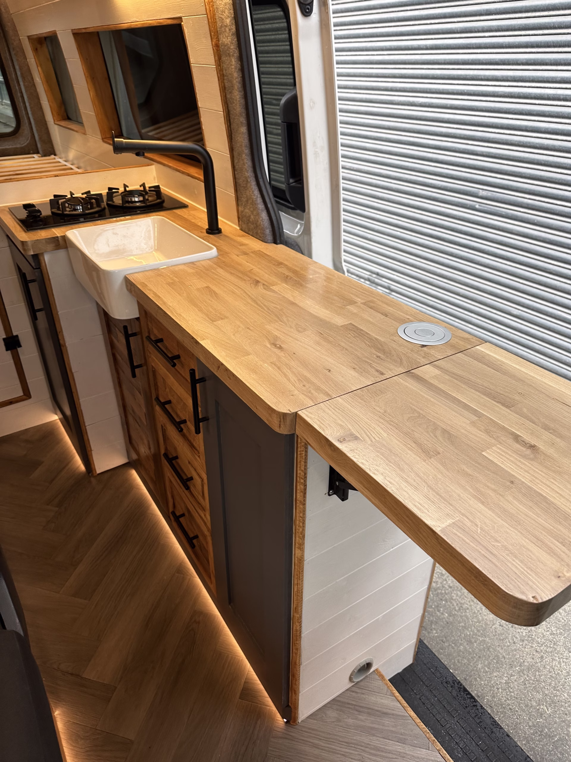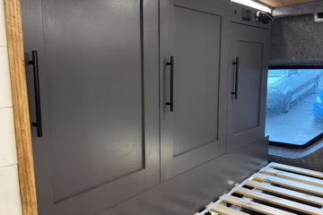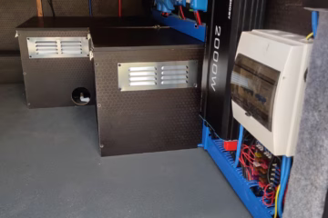 The the wooden panelling and upholstered sofa cushions make this van feel really cosy. It’s built with off grid in mind with a huge 300ah Lithium battery, large solar panels, Victron electrical system and Renogy inverter, all professionally installed, configured and tested. Light weight!.