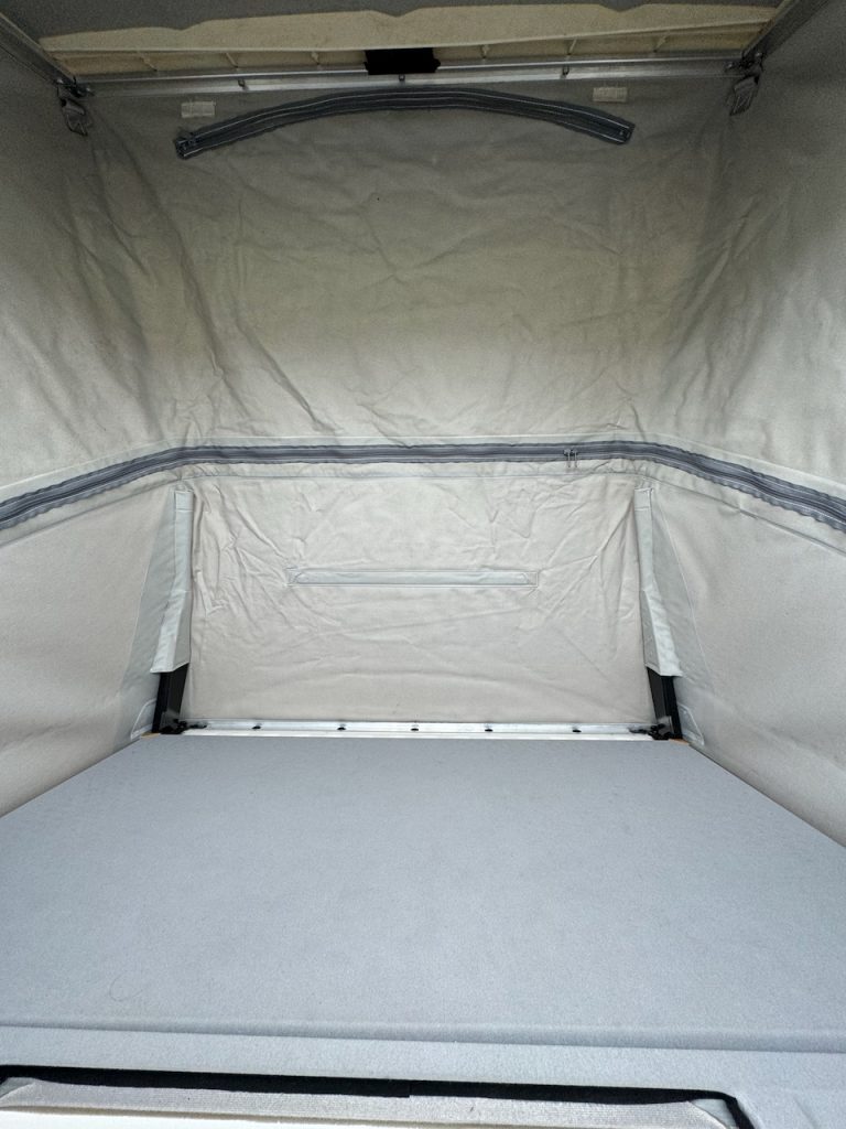 With the roof up there is headroom to stand and there is space over the front seats to stash luggage.
