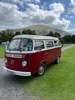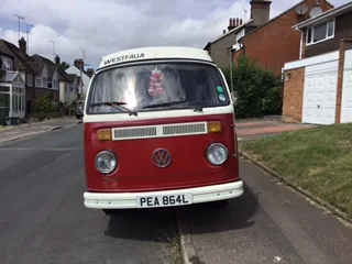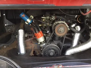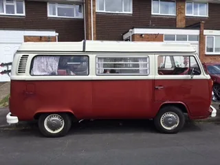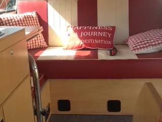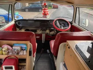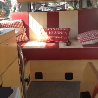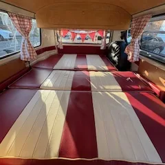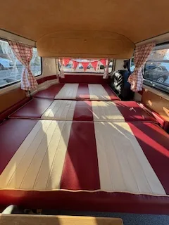 Walk through layout with full camping interior; curtains all round in the back, insulation covers for the front 3 windows. Westfalia style buddy seat and 2 front seats upholstered in red/white vinyl. Two 3-point seat belts fitted on rear seat.