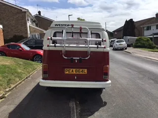 Westfalia pop top with 3 windows. Westfalia roof rack at back of van.