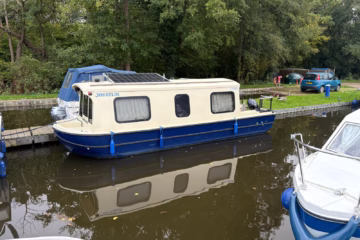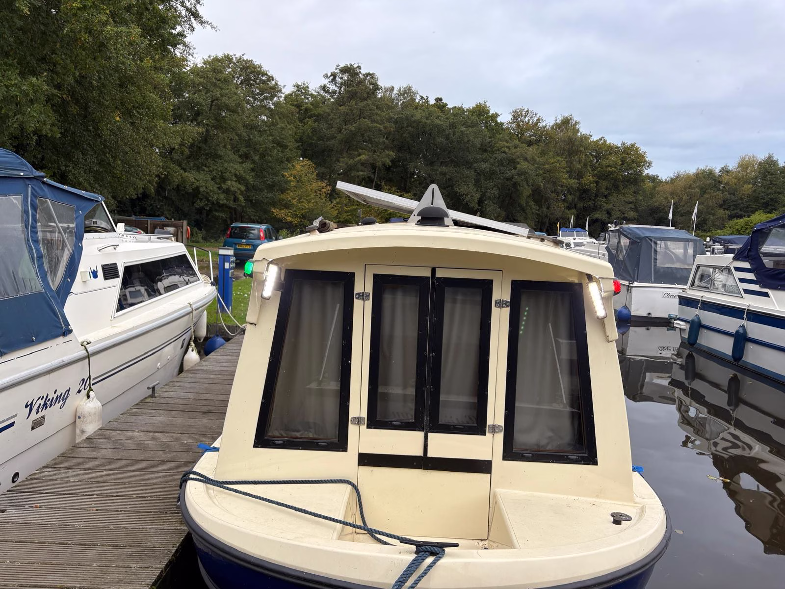 Her kitchen has a sink and drainage board, she has a Thetford Triplex 700 series cooker with an oven big enough for a chicken a potatoes, ample storage, and a roll out pantry. The work area can be extended with an occasional table that doubles as the dining table. (It can be moved to a second location via the adaptor the we have left in one of the draws for you to decide.) Her lounge/dining area flows out and onto the rear steering deck, where thereβs enough seating for guests inside and/or out. For safety she has a fire blanket, carbon monoxide alarm and two fire extinguishers. While captaining her there is a horn and running lights located just above the door. Her shower takes no room and is an extension of her entrance step. After pinning up a shower curtain that fits inside the basin, warm water is used and drains out via a pump at the back.