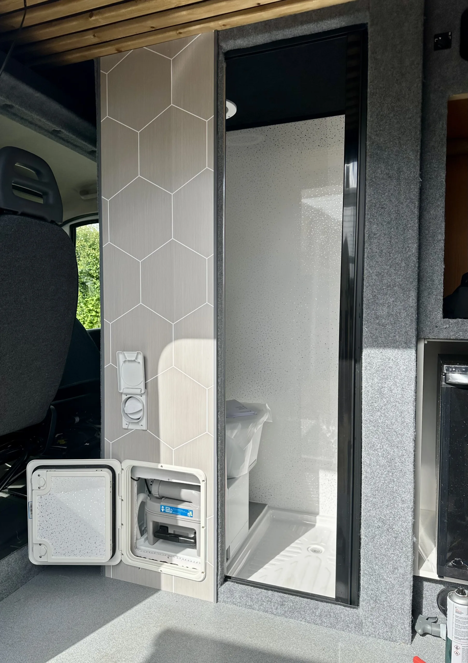 Practical water setups with showers, sinks, and underslung tanks.